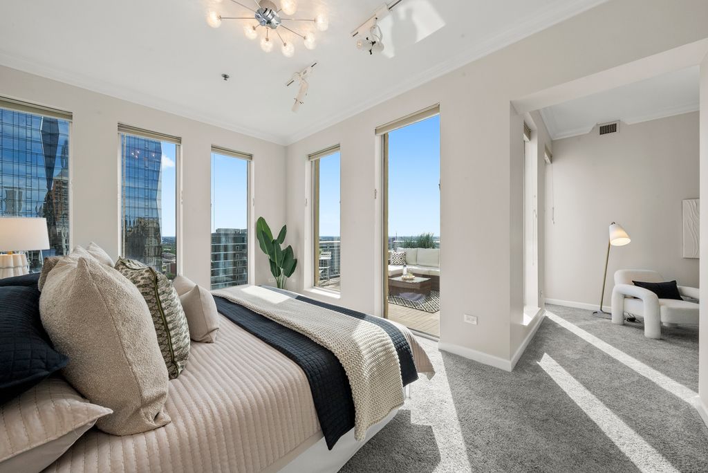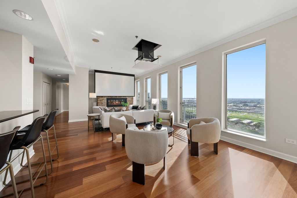 Perched atop an exclusive high-rise, this extraordinary penthouse offers over 3,000 square feet of single-level luxury-an exceptionally rare find in the city. Designed for seamless indoor-outdoor living, the home features 2 private balconies with sweeping north, west, and south exposures that showcase both iconic lakefront and skyline views. The chef's kitchen boasts stainless steel appliances and a casual dining area, while the spacious living and dining room is centered around a fireplace. The living room further enhances the home with a built-in projector, creating the perfect private theater experience. The primary suite features a comfortable sitting area, spa-like bath with soaking tub and separate shower, and expansive walk-in closets. Additional highlights include an oversized in-unit washer/dryer and the rare opportunity to purchase up to five parking spaces in the attached garage. This full-service building provides premier amenities: 24-hour door staff and on-site management, heated outdoor pool, fitness center, beautifully landscaped private park and dog run, newly renovated party room and hallways, and bike facilities. Ideally situated near public transit, expressways, and the EL, with easy access to Chicago's best attractions-Millennium Park, Grant Park, Museum Campus, Soldier Field, Lake Michigan, shops, restaurants, and more. Experience the ultimate blend of luxury, comfort, and convenience in one of Chicago's most desirable neighborhoods. Don't miss the chance to call this remarkable penthouse home! Explore in 3D-click the 3D button for a full virtual tour.