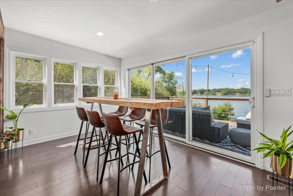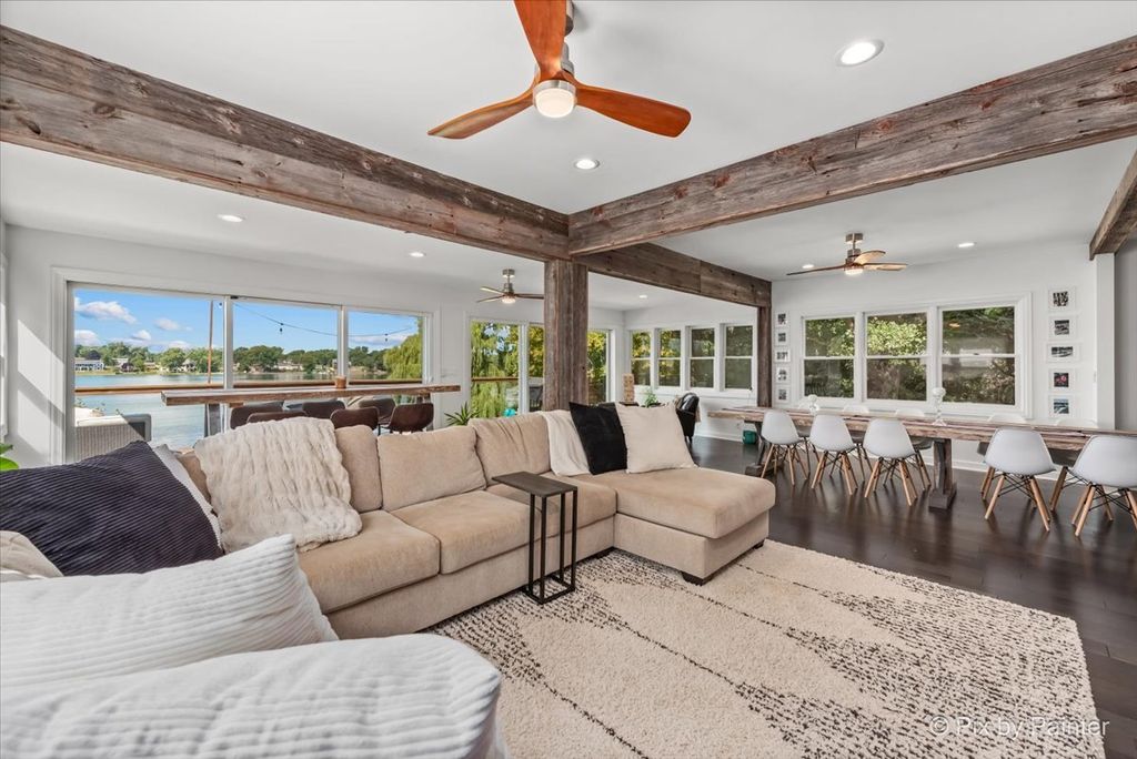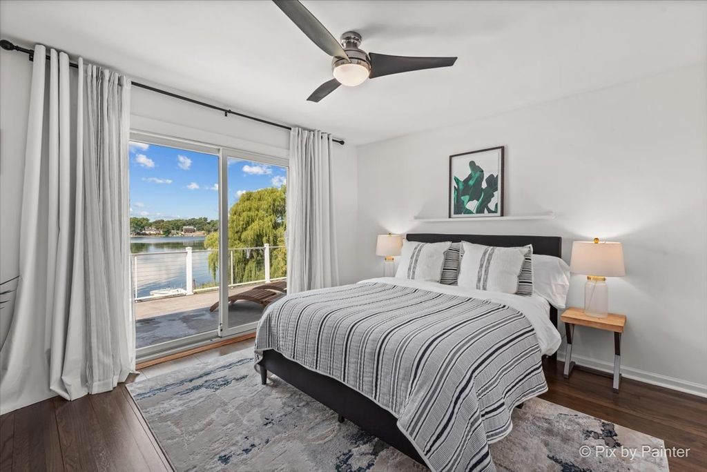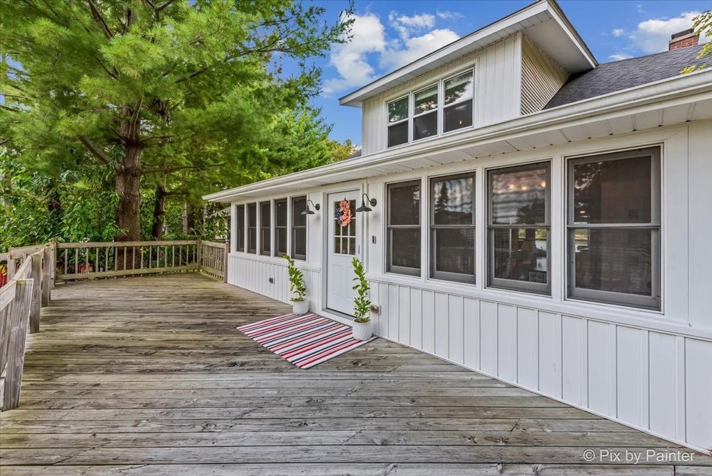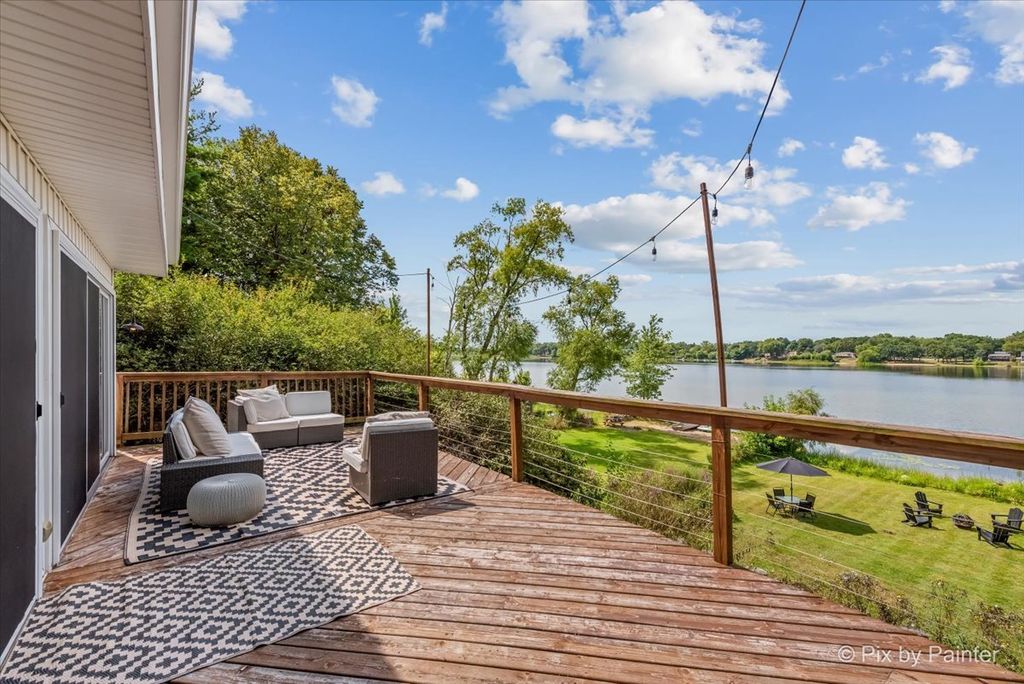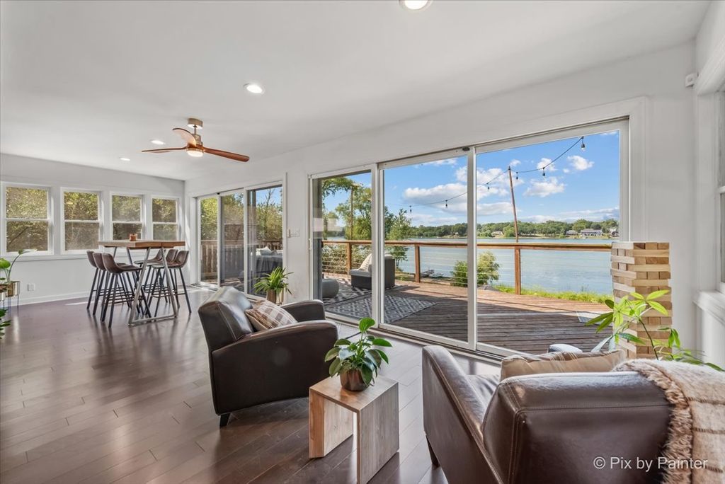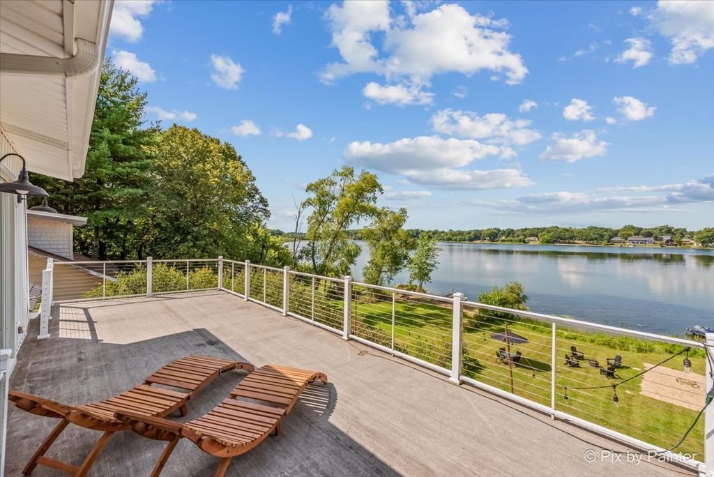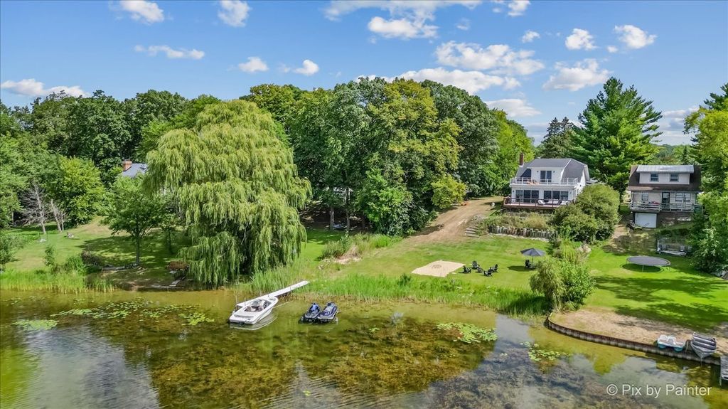 Lakefront Living on Miltmore Lake! Welcome to this beautifully updated 5-bedroom, 2-bath home with stunning western views and direct access to sought-after Miltmore Lake in Lake Villa. From the moment you step inside, the spacious foyer entry and engineered hardwood floors set the tone for the thoughtfully updated interior. The kitchen boasts crisp white cabinetry, granite countertops, stainless steel appliances, and a breakfast bar that flows seamlessly into the newly renovated great room space complete with charming exposed beams. Telescoping sliding doors stretch across the back of the home, offering incredible lake views and access to a 30x12 deck-perfect for entertaining or simply soaking in the scenery. The inviting living area features built-in shelving and a cozy gas fireplace, and connects to the large dining room for effortless gatherings. Two bedrooms and a full bath with a walk-in shower complete the main level. Upstairs, the primary bedroom with walk-in closet offers breathtaking lake views with its own expansive balcony. Beautifully refinished oak hardwood floors flow throughout the second level, where a shared full bath serves the primary and two additional bedrooms. An unfinished basement provides ample storage or potential for future living space. Outside, enjoy your own private retreat with a pier, beach, and direct access to this motorized lake. Mature trees surround the property, adding privacy and natural beauty. A detached 2.5-car garage completes the package. Updates include- A/C 2020, furnace 2021, roof 2023 and tankless water heater 2024. This is more than a home-it's a lifestyle. Imagine boating, fishing, and lakefront sunsets all from your own backyard!