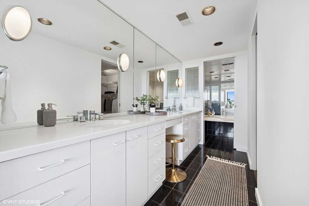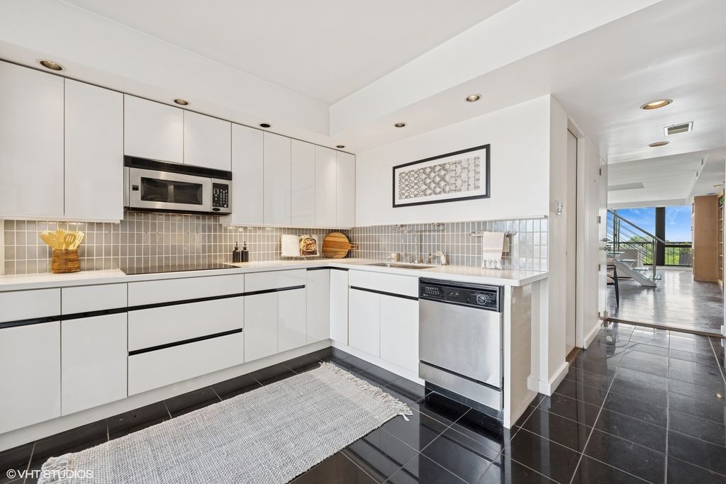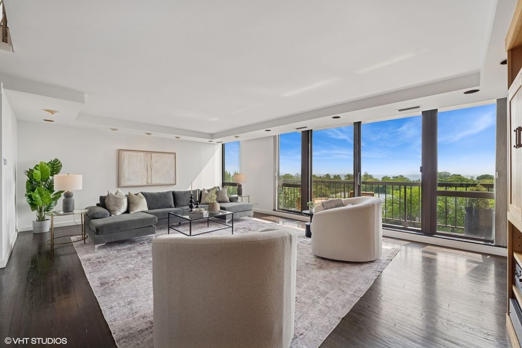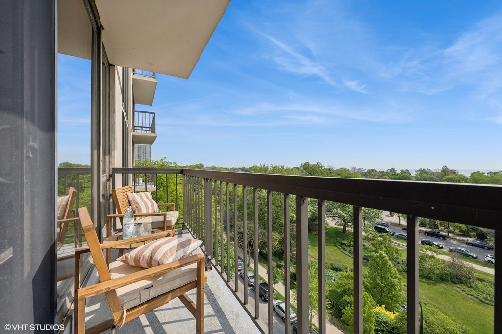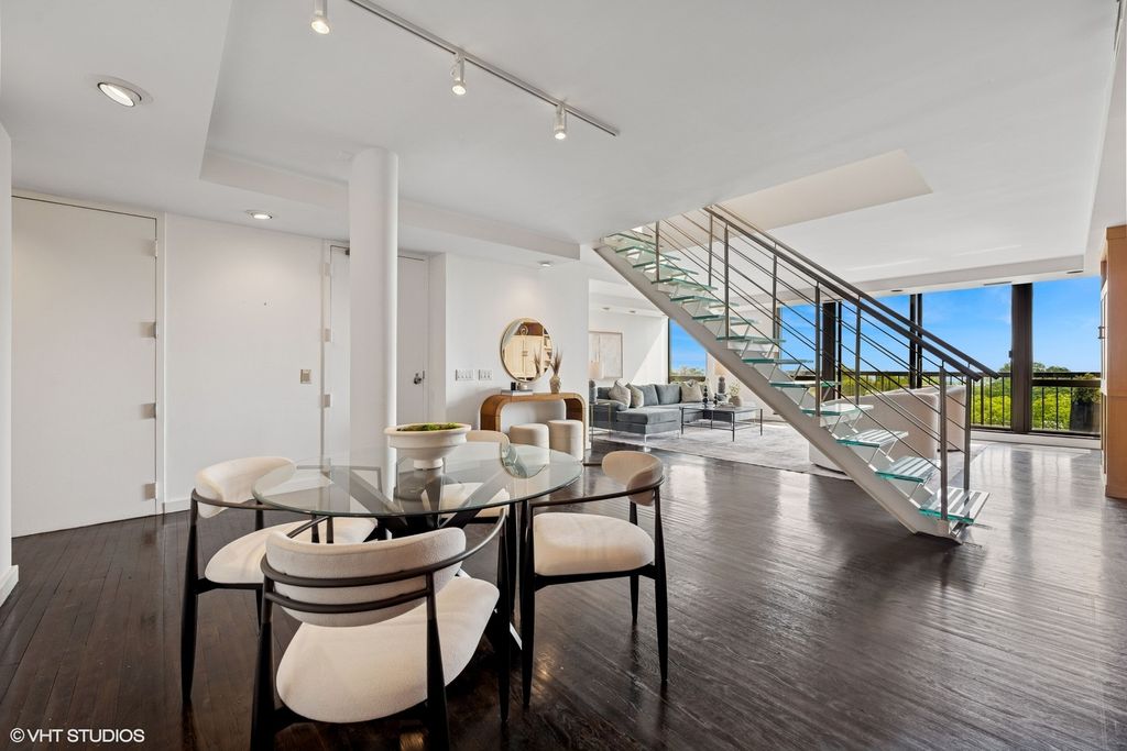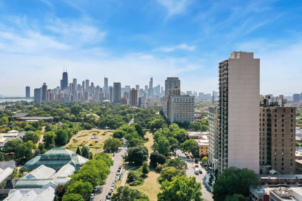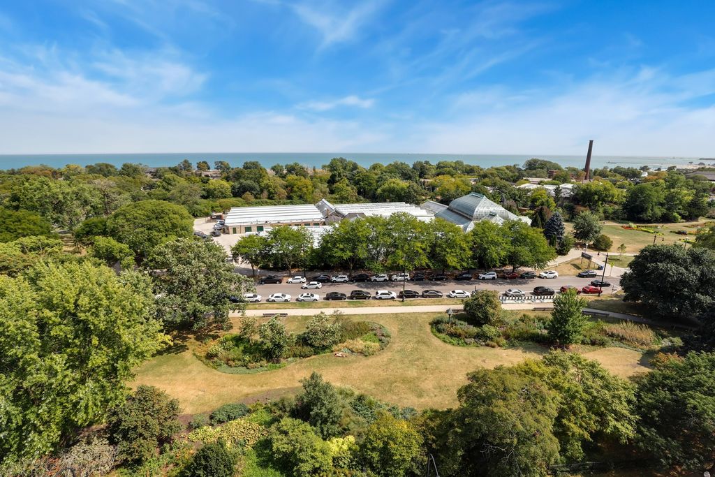 Enjoy breathtaking, southeast-facing views of the city, park, and lake from this pristine and modern two-story residence at The Conservatory. The expertly designed floor plan keeps the public rooms on the main level and the bedrooms upstairs so that this 2273 SQFT condo lives more like a single-family home. Floor-to-ceiling windows welcome abundant natural light while sliding doors open to a 14 ft long terrace overlooking the Lincoln Park Conservatory with a skyline view to the south. The first-floor features hardwood flooring in the living and dining rooms along with elegant custom built-in bookshelves. Wired for surround sound, this home is the perfect place to entertain. A separate eat-in kitchen offers high end appliances, granite tile flooring, a pantry, and copious counter and cabinet space. A powder room and ample closet and storage space complete this level nicely. The floating glass staircase separates the living and dining rooms and leads upstairs to the private quarters. Comfortable and serene, the primary suite is bathed in natural light and enjoys its own private 14 ft long terrace, two walk-in closets, and an ensuite bath with Whirlpool tub, separate shower, and double sinks. Across the hall, a graciously sized guest suite offers west-facing views, a walk-in closet, and an ensuite bath. Two parking spaces (one garage and one exterior) are included in the price. Side-by-side W/D on each floor, shared with same-floor neighbor only. Ideally located in East Lincoln Park alongside parks, playgrounds, Lincoln Park Zoo, near the lake front, 5-star dining, shopping, and public transportation - this home has it all. Welcome home!