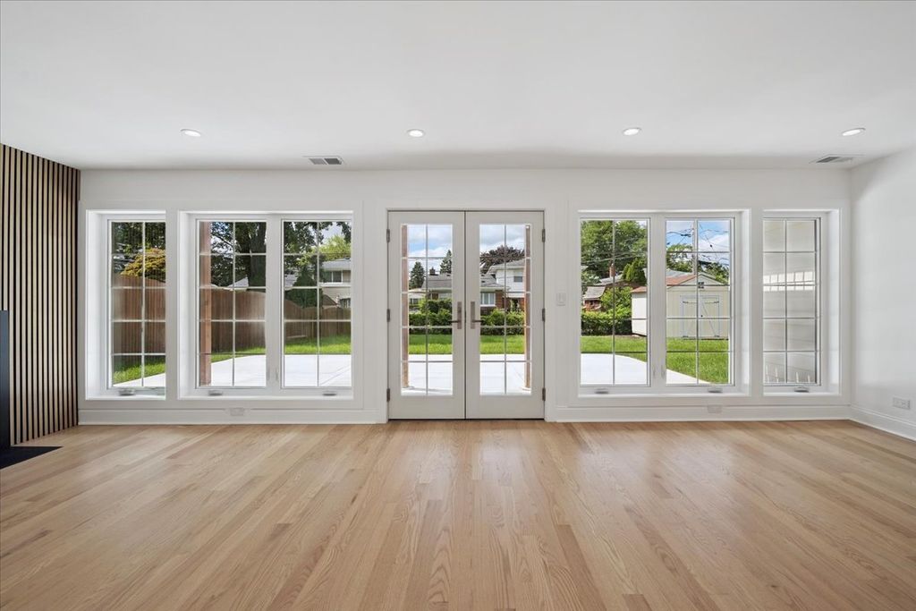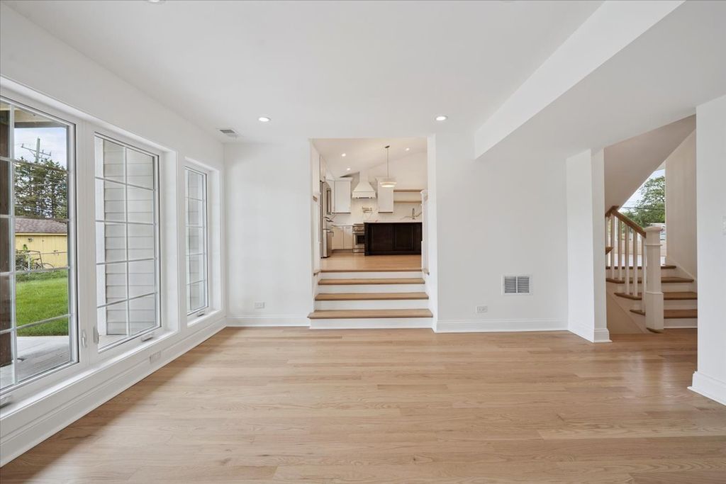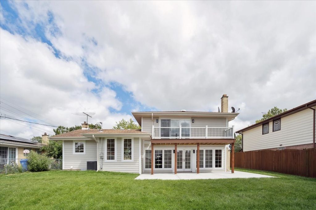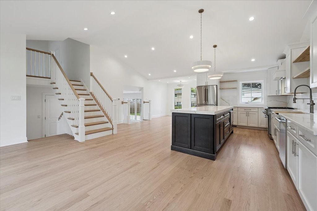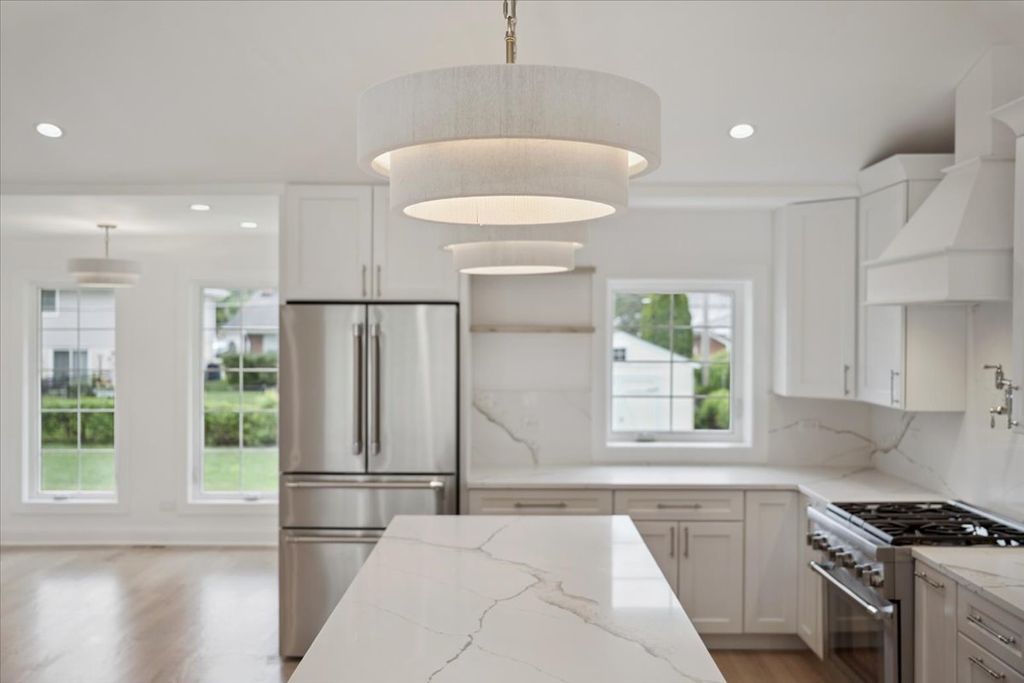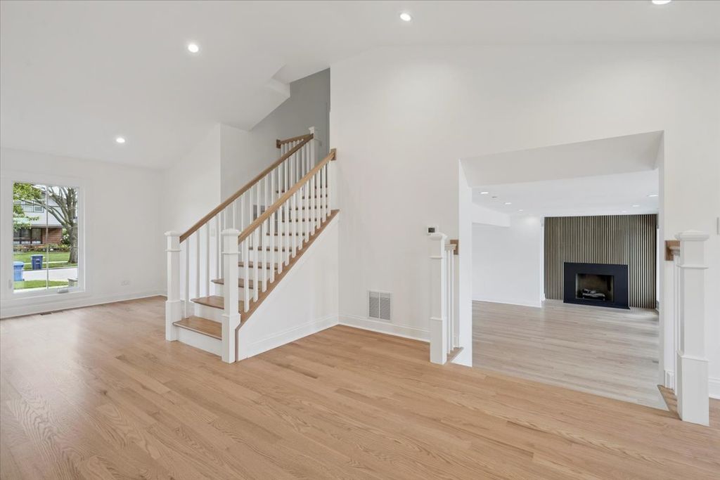 Beautifully renovated 3-bedroom, 3-bath home featuring an open-concept layout with hardwood floors, custom fireplace, and oversized windows flooding the space with natural light. The gourmet kitchen offers quartz countertops, waterfall island, pot filler, stainless steel appliances, and designer lighting. Upstairs, the primary suite includes vaulted ceilings, a private balcony, walk-in closet, and spa-like ensuite. A finished basement with family room, updated baths, modern laundry, 2-car garage with epoxy floor, and a large backyard with patio complete this move-in ready home.