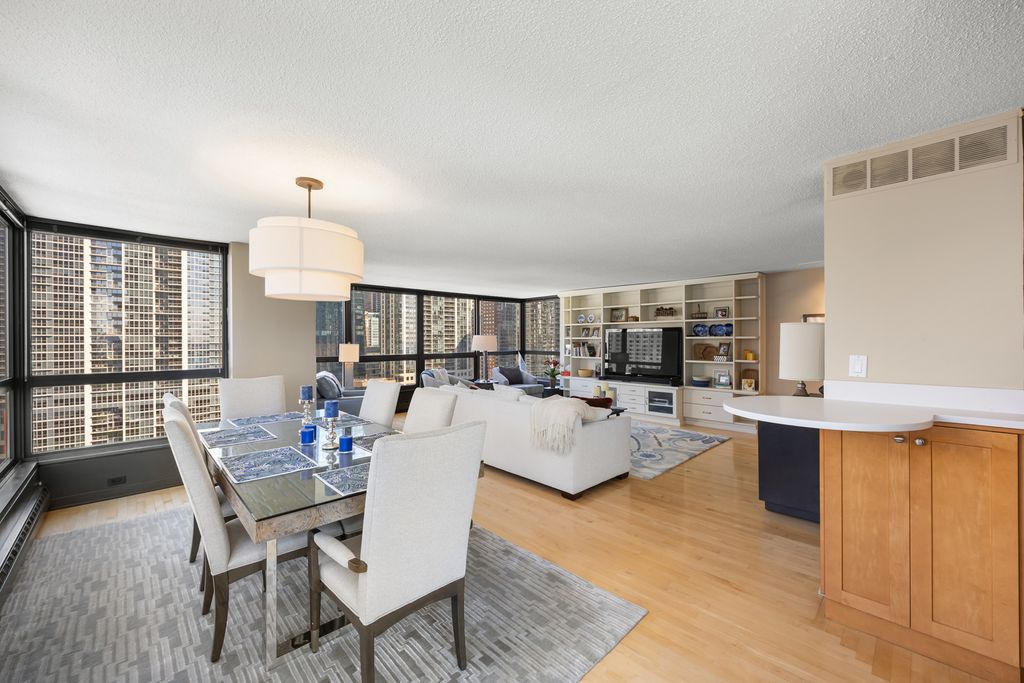 Coveted corner 2 bed / 2 bath home at The Buckingham showcases sweeping views of Lakeshore East and Millennium Parks through dramatic floor-to-ceiling windows. A spacious entry foyer opens into a sun-drenched living and dining area with custom built-ins, perfect for both entertaining and everyday living. The renovated kitchen features upgraded cabinetry, quartz counters, breakfast bar, and stainless-steel appliances. The primary suite is massize and boasts a newly renovated spa-like bath with a glass-enclosed shower and soaking tub. Second bedroom is 13 x 16, easily large enough for a guest bed and desk for those work from home days. A separate laundry room with washer/dryer and storage adds convenience. The Buckingham is a premier, full-amenity building with a beautifully landscaped terrace, party room, heated indoor pool, sundeck, saunas, fitness center, bike room, guest parking, and attentive 24-hour door staff. Ideally located just steps from the lakefront, harbor, Grant, Millennium, and Maggie Daley Parks and Michigan Avenue.