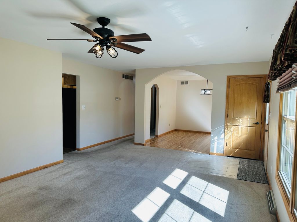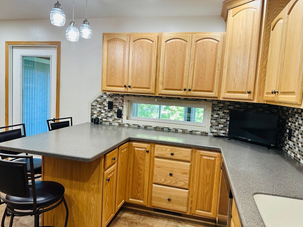 Whether you're seeking the ease of main-floor living or the flexibility of multi-generational living, this home is designed to accommodate your lifestyle. Step up to the welcoming front deck and into this inviting home, with thoughtful details throughout to create a warm and functional living space. The spacious living room connects seamlessly through an arched opening to the dining room. While at the back of the home you'll find a well-appointed kitchen with stainless steel appliances, a center island with seating, and direct access to the bright sunroom. Surrounded by windows, the sunroom offers panoramic views of the backyard, or you can step outside to enjoy the back deck overlooking the garden shed and a beautifully carved eagle tree stump. The main floor features two comfortable bedrooms and a full bath with a walk-in shower. The back hallway off the kitchen leads to a convenient half bath with laundry, access to the attached two-stall garage, and the staircase to the lower level. Downstairs expands your options with a second laundry area and wash sink, a full bath with walk-in shower, a third bedroom with walk-in closet, a mechanical room closet, a large storage area with built-in shelving, and an additional living space complete with a full kitchen and walk-out to the brick paver patio perfect for entertaining.