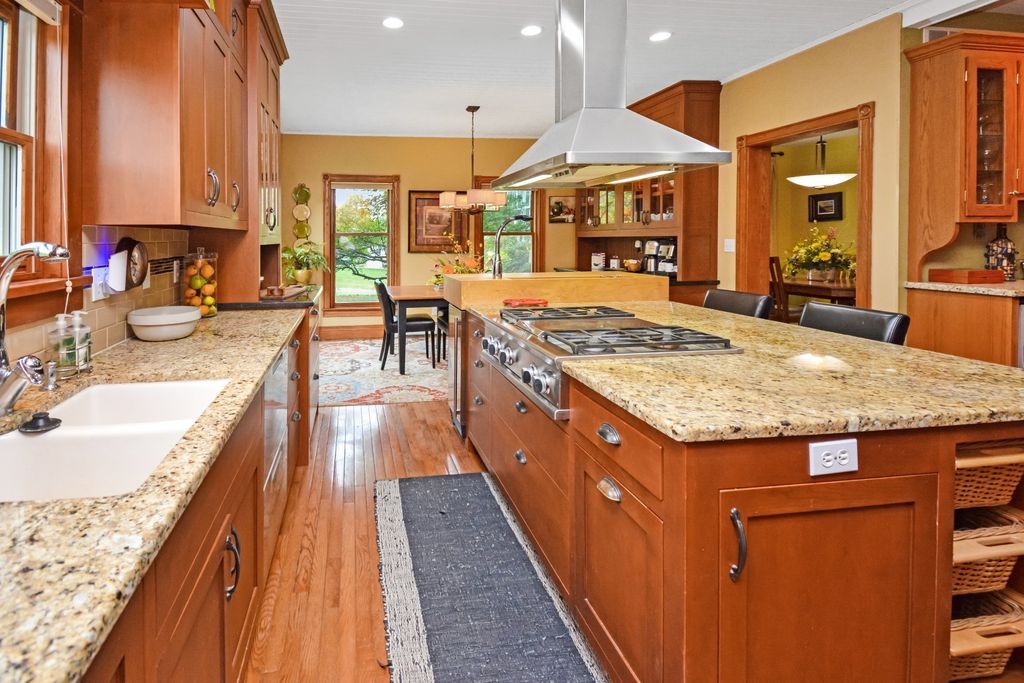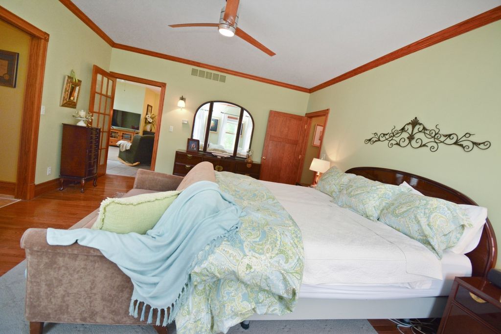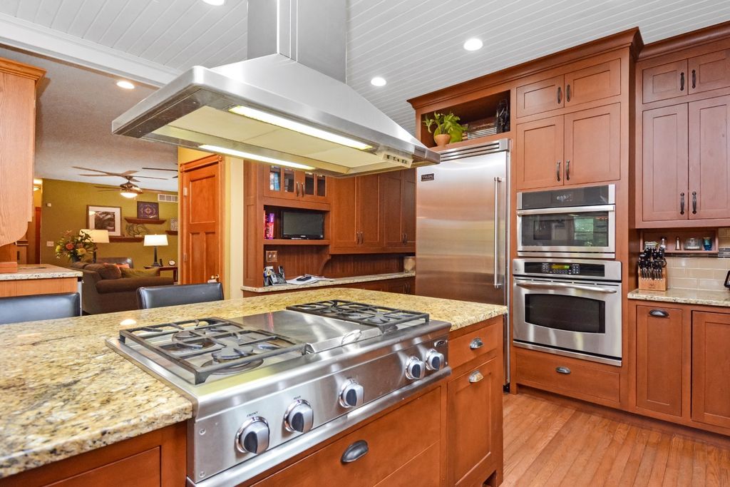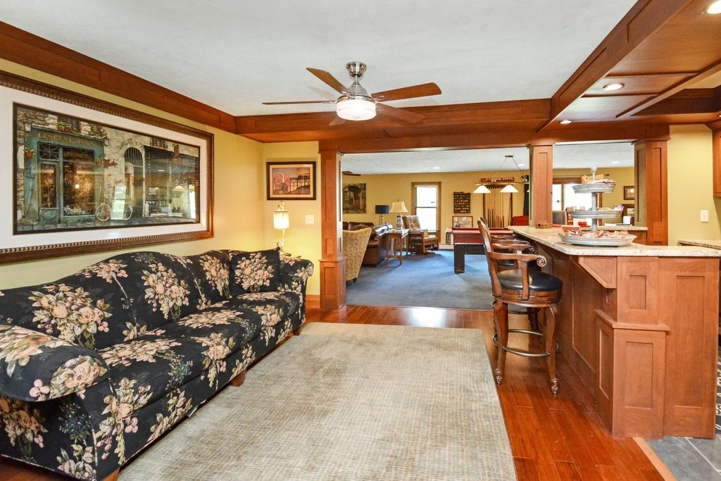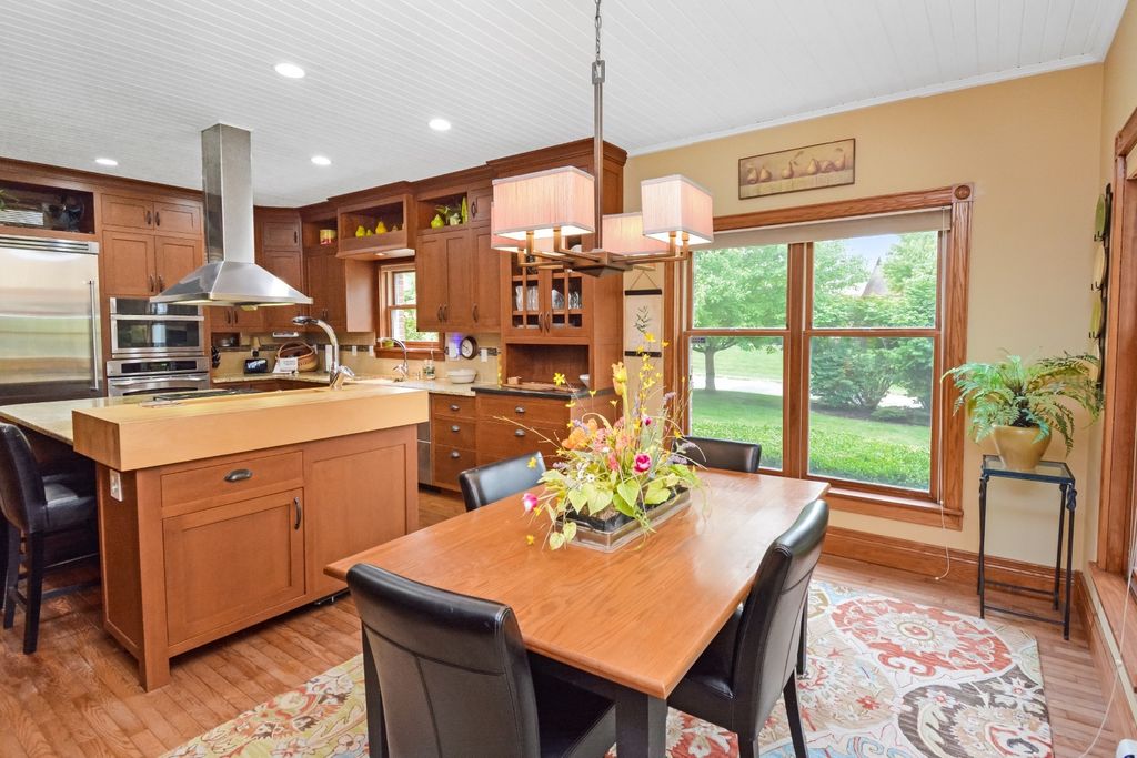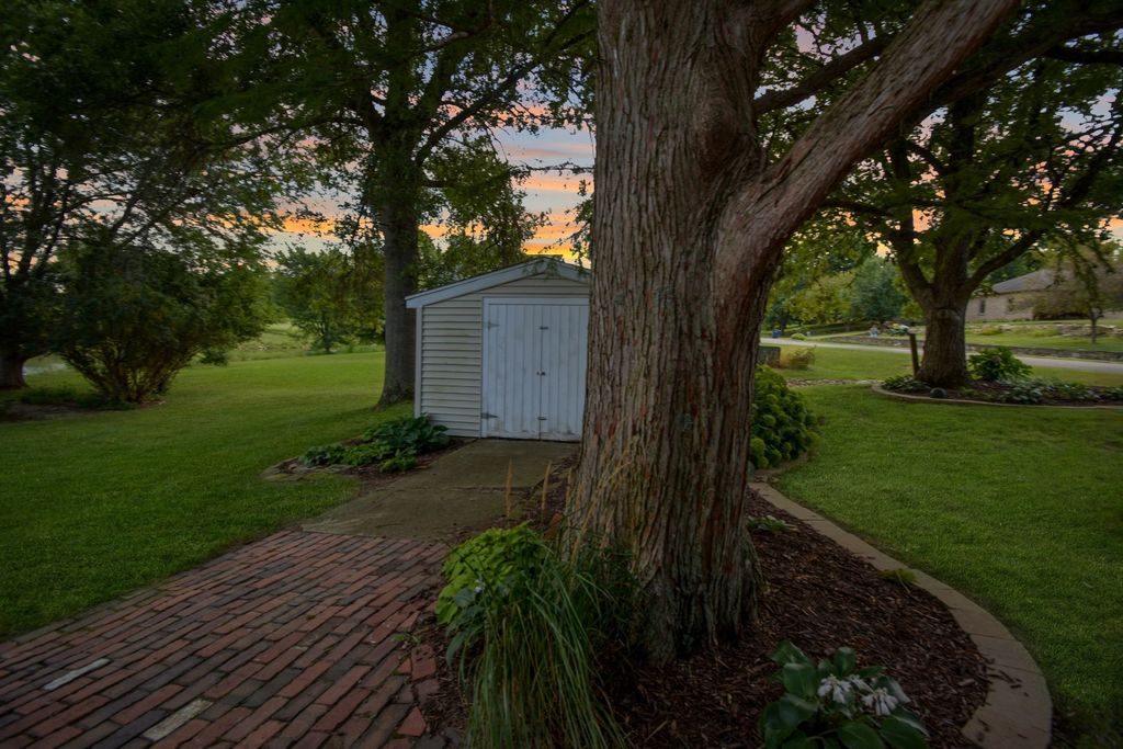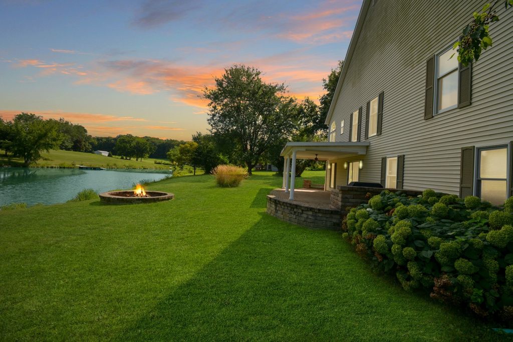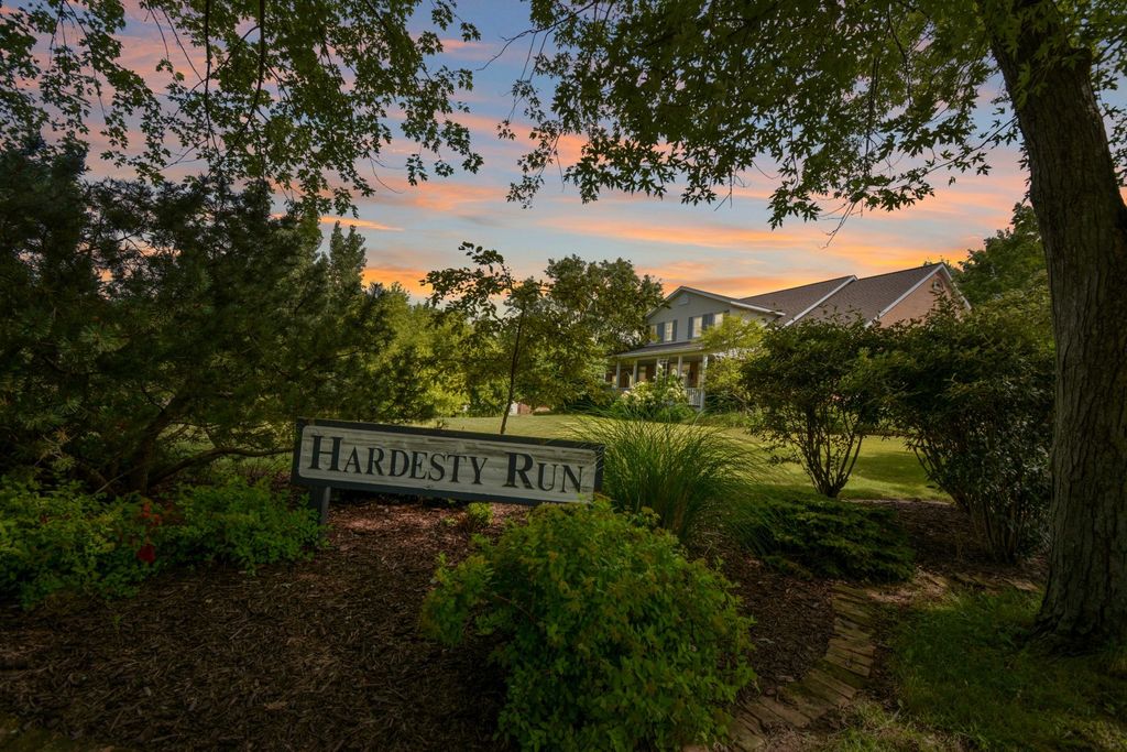 What a rare opportunity to purchase one of the most well-built and beautiful homes in McLean County! An ENTERTAINER'S DREAM! Grace, Charm, Character, Functionality. It feels purpose-built for a beautiful life. Custom built and lovingly kept by the original owners for 32 years, 9030 Hardesty Run is built like a fortress! It feels like home, but also feels like a retreat. Set high on a .79-acre corner lot, the home looks out over a fully stocked lake from a series of outdoor rooms: A storybook covered front porch, sun deck off the vaulted sunroom, covered walkout patio, brick paver terrace, fire pit, a rose garden, shed, and a granite-topped grill station. And that's just the OUTDOOR living space! Inside, the custom millwork sets a refined tone with the most beautiful custom woodwork details: Built- ins, ceiling-height cabinetry, pocket doors, window seats, deep casings, and rich hardwoods. The foyer is flanked by a gorgeous office with custom coffered wood ceiling and a formal dining. The kitchen is a Chef's DREAM COME TRUE! All stainless appliances include: Viking fridge, built-in Advantium convection oven & microwave with steam feature, custom ice maker, double Fischer Paykel dishwasher, commercial grade Fischer Paykel DCS commercial grade gas cooktop, hood, built-in pantry, THREE sinks, separate wine & coffee bars, granite counters with a butcher-block island extension. The large main-level family room (wood fireplace w/gas start) flows to the vaulted sunroom via 2 sets of glass french doors. A wall of built-ins links kitchen to garage; the separate laundry/mudroom adds bench seating, Quartz counters, pull-outs (incl. trash), built-in ironing board, and dual hanging racks. The primary suite reads like a spa-dual custom closets with pocket doors; honed-granite double vanity with hidden outlets; discreet medicine cabinets; custom cabinetry, steamer shower (heated light just outside); jetted tub with neck/back jets and chromotherapy; **motorized blinds** here-and custom blinds throughout-convey (curtains excluded; hardware stays). Upstairs: Three oversized bedrooms, a generous loft, a bath with cast-iron Kohler steeping tub, separate shower, and double vanity; two unfinished rooms await your ideas- great for seasonal decor. The walkout lower level echoes an elegant pub with daylight lake views: Enormous family/rec room with gas fireplace, built-ins, wet bar, kitchenette, and a gym-sized fitness room. About 2,500 sq ft down (2/3 finished) plus tidy storage/mechanicals. Oversized 2-car garage with pull-down stairs to a floored attic; room to add a third stall, though a mature cypress-kept by design-enhances the landscape. As solid as it is graceful! 2x6 construction, 50-ft mono-trusses, and 9-ft ceilings on every level. Comfort is dialed-in with central vac, instant hot water, three A/C units 2 are newer (2023 & 2021), and an ultra-efficient zoned boiler (2023). Roof is 15 years old. Thoughtful site design means no sump pump; footing tile carries water to the lake. Approx. 6,500 sq ft | 5-6 BR | 4.5 BA | 2 FP.