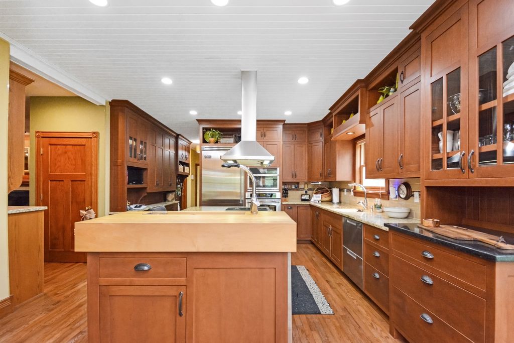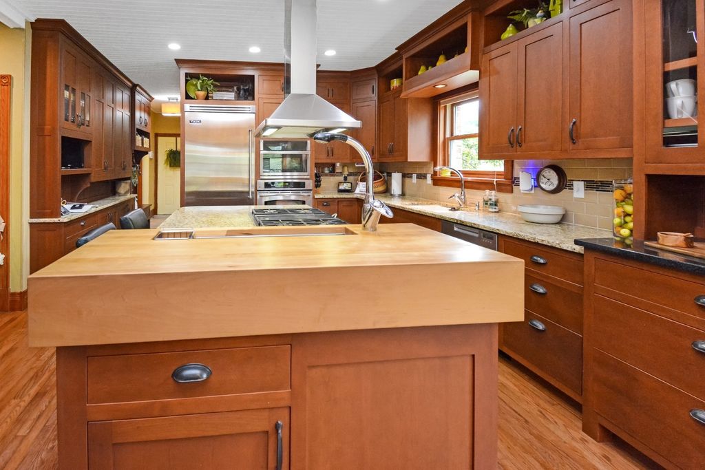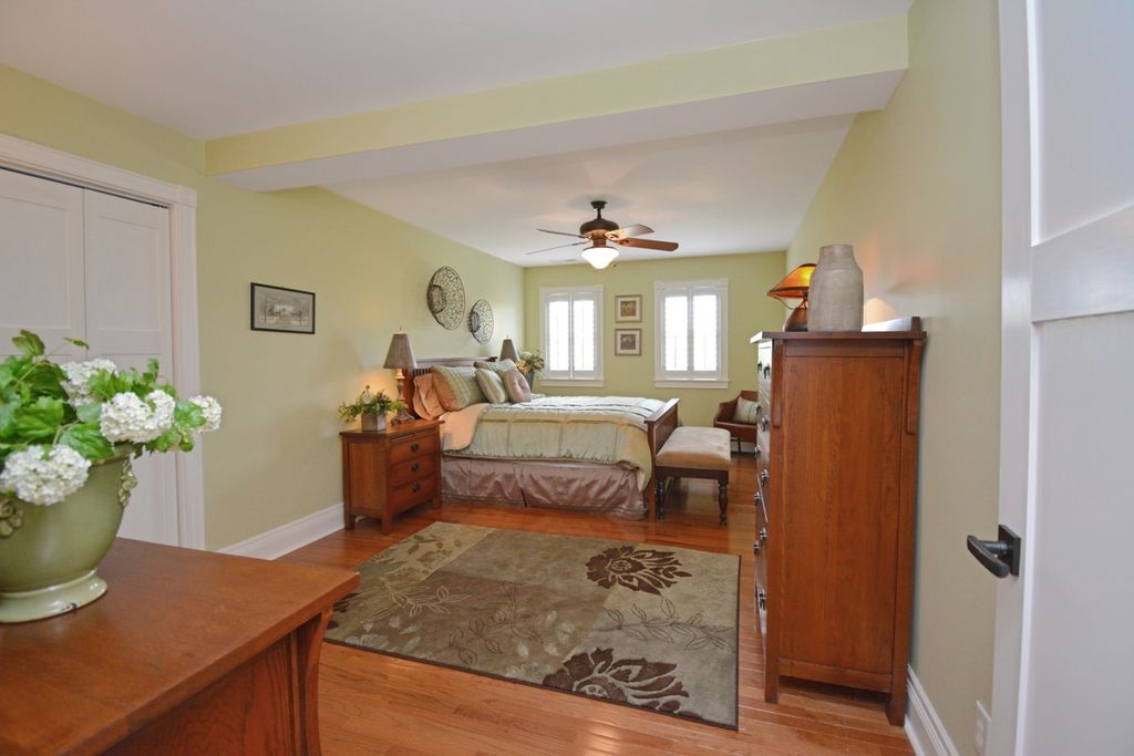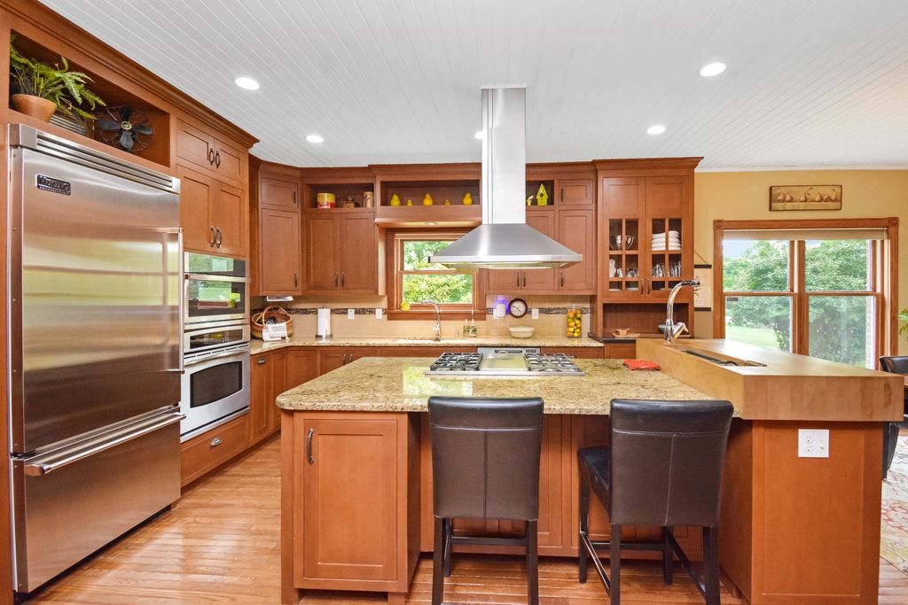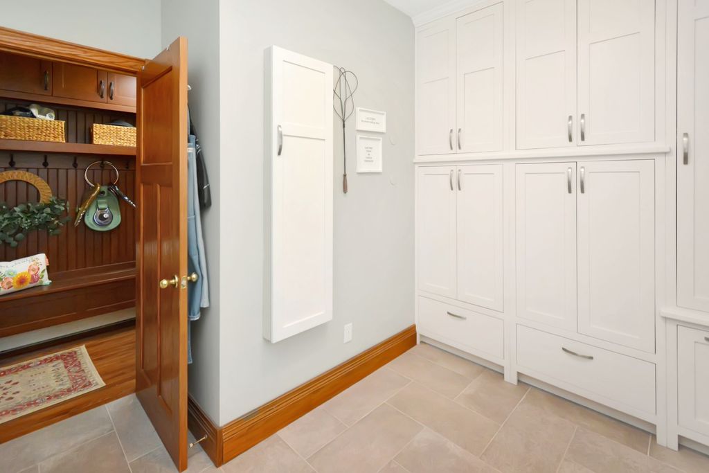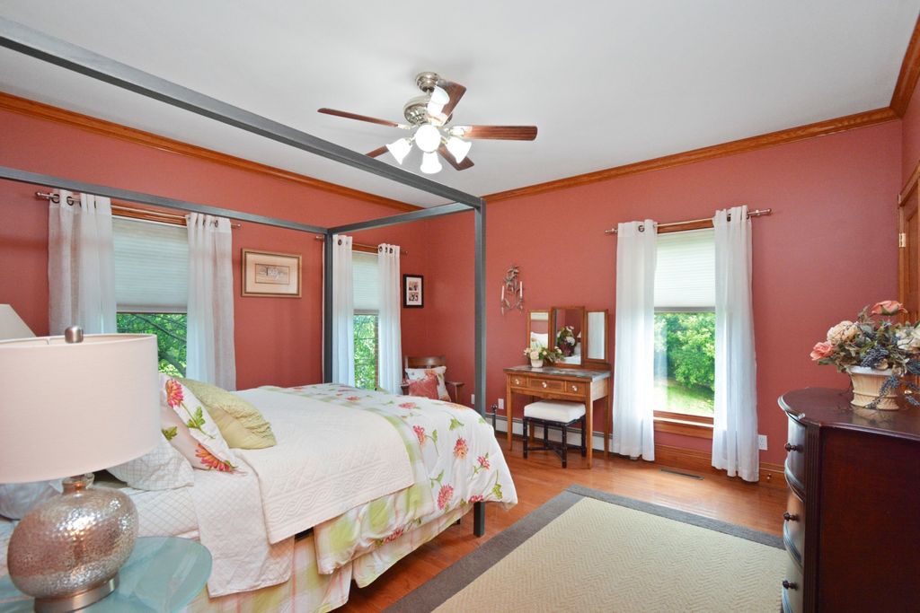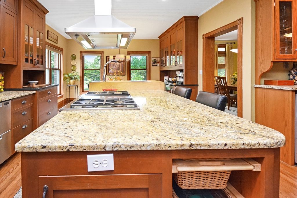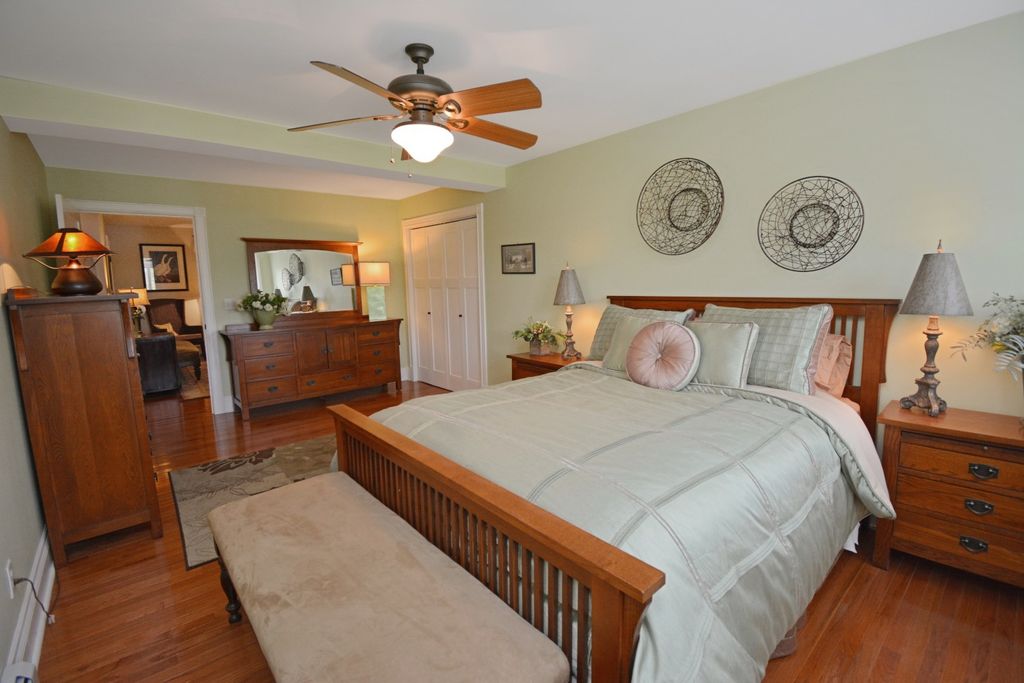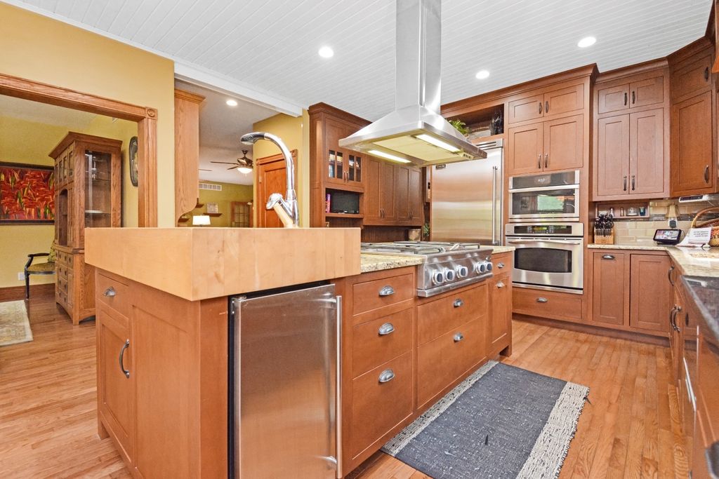 What a rare opportunity to purchase one of the most well-built and beautiful homes in McLean County! An ENTERTAINER'S DREAM! Grace, Charm, Character, Functionality. It feels purpose-built for a beautiful life. Custom built and lovingly kept by the original owners for 32 years, 9030 Hardesty Run is built like a fortress! It feels like home, but also feels like a retreat. Set high on a .79-acre corner lot, the home looks out over a fully stocked lake from a series of outdoor rooms: A storybook covered front porch, sun deck off the vaulted sunroom, covered walkout patio, brick paver terrace, fire pit, a rose garden, shed, and a granite-topped grill station. And that's just the OUTDOOR living space! Inside, the custom millwork sets a refined tone with the most beautiful custom woodwork details: Built- ins, ceiling-height cabinetry, pocket doors, window seats, deep casings, and rich hardwoods. The foyer is flanked by a gorgeous office with custom coffered wood ceiling and a formal dining. The kitchen is a Chef's DREAM COME TRUE! All stainless appliances include: Viking fridge, built-in Advantium convection oven & microwave with steam feature, custom ice maker, double Fischer Paykel dishwasher, commercial grade Fischer Paykel DCS commercial grade gas cooktop, hood, built-in pantry, THREE sinks, separate wine & coffee bars, granite counters with a butcher-block island extension. The large main-level family room (wood fireplace w/gas start) flows to the vaulted sunroom via 2 sets of glass french doors. A wall of built-ins links kitchen to garage; the separate laundry/mudroom adds bench seating, Quartz counters, pull-outs (incl. trash), built-in ironing board, and dual hanging racks. The primary suite reads like a spa-dual custom closets with pocket doors; honed-granite double vanity with hidden outlets; discreet medicine cabinets; custom cabinetry, steamer shower (heated light just outside); jetted tub with neck/back jets and chromotherapy; **motorized blinds** here-and custom blinds throughout-convey (curtains excluded; hardware stays). Upstairs: Three oversized bedrooms, a generous loft, a bath with cast-iron Kohler steeping tub, separate shower, and double vanity; two unfinished rooms await your ideas- great for seasonal decor. The walkout lower level echoes an elegant pub with daylight lake views: Enormous family/rec room with gas fireplace, built-ins, wet bar, kitchenette, and a gym-sized fitness room. About 2,500 sq ft down (2/3 finished) plus tidy storage/mechanicals. Oversized 2-car garage with pull-down stairs to a floored attic; room to add a third stall, though a mature cypress-kept by design-enhances the landscape. As solid as it is graceful! 2x6 construction, 50-ft mono-trusses, and 9-ft ceilings on every level. Comfort is dialed-in with central vac, instant hot water, three A/C units 2 are newer (2023 & 2021), and an ultra-efficient zoned boiler (2023). Roof is 15 years old. Thoughtful site design means no sump pump; footing tile carries water to the lake. Approx. 6,500 sq ft | 5-6 BR | 4.5 BA | 2 FP.