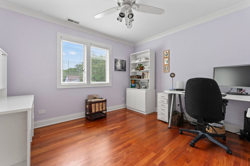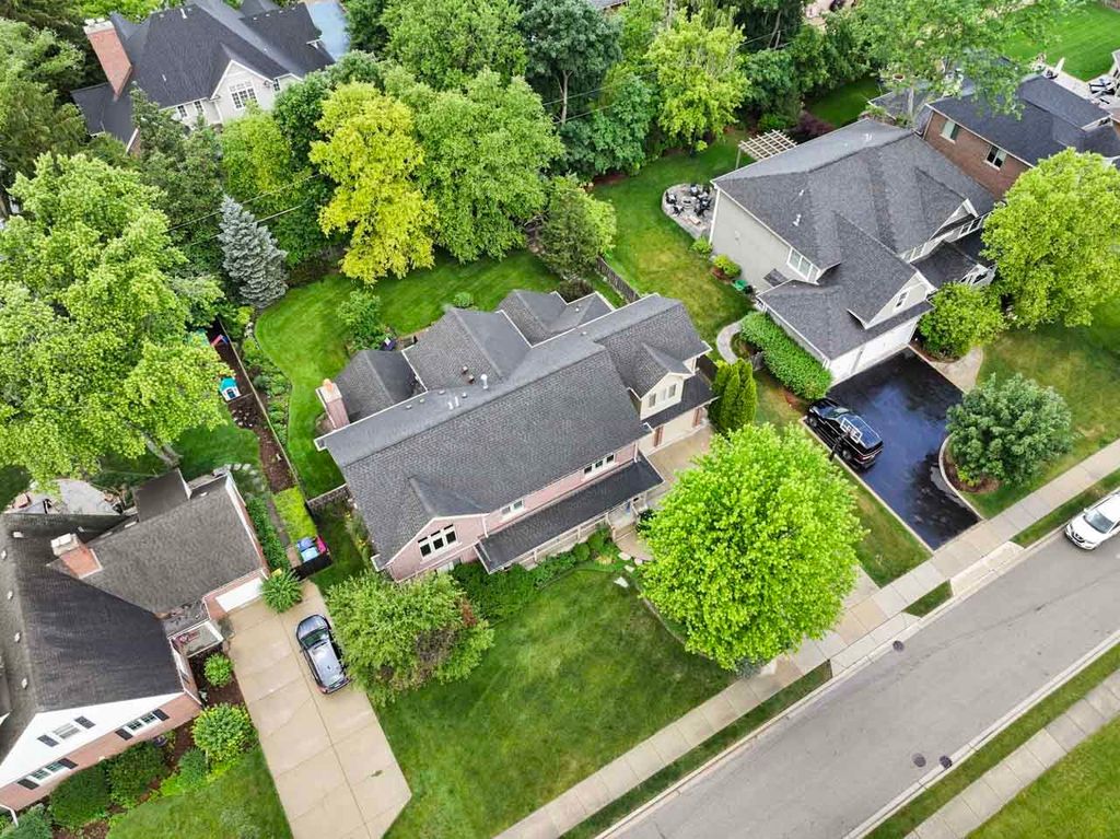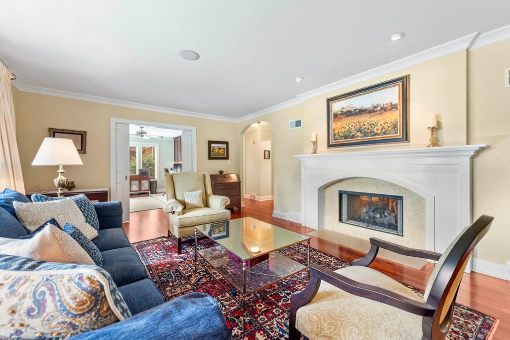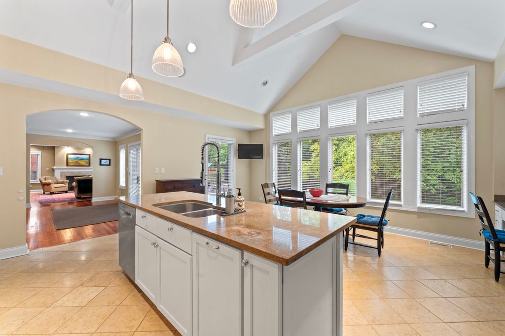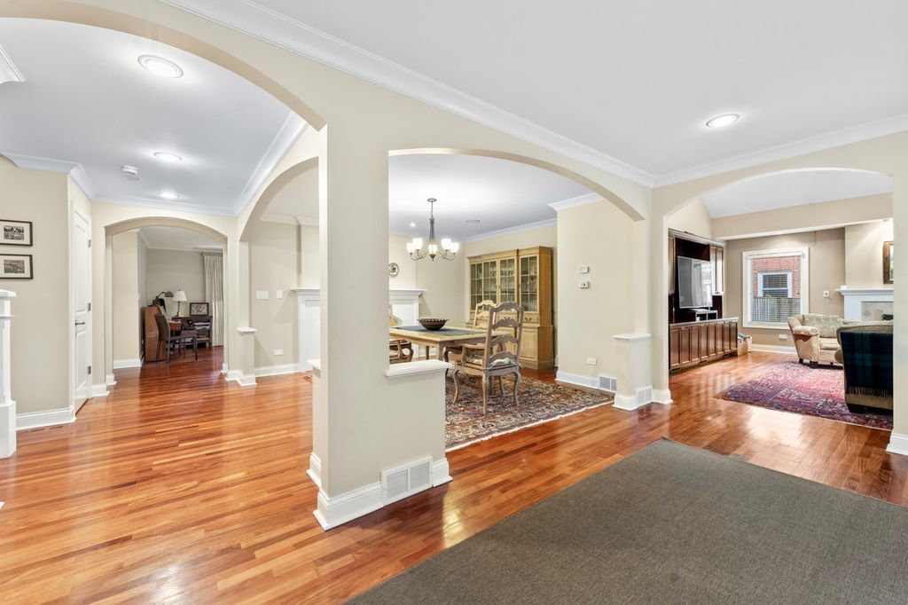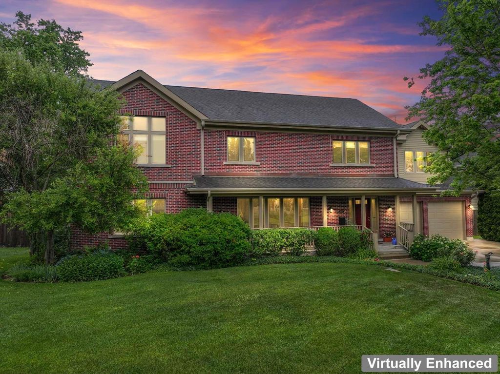 This timeless all-brick two-story home combines classic curb appeal with a smartly designed floor plan that balances privacy, comfort, and functionality. The striking red brick exterior, inviting front porch, and beautifully landscaped yard with an inground sprinkler system create a warm welcome from the start. Step into the grand foyer where rich mahogany floors flow seamlessly throughout the main level. A spacious office with custom built-in cabinetry and a granite-topped desk offers the perfect setting for remote work or study. The formal living and dining rooms share a stunning double-sided Jerusalem Gold Limestone fireplace, adding warmth and elegance to both spaces. A main-floor bedroom with an adjacent full bath provides an ideal guest suite or private retreat. The cozy family room impresses with soaring cathedral ceilings and a gas-start fireplace, while the kitchen features vaulted ceilings, a generous island, stainless steel appliances, white cabinetry, African granite countertops, built-in desk, and a sunlit eating area. A laundry room and convenient half bath complete the first floor. Upstairs, the private primary suite is set apart at the end of the hall and offers a spacious walk-in closet and a luxurious en-suite with marble floors, dual sink and a walk-in marble shower. With a total of five bedrooms upstairs, there's space for everyone: one with cathedral ceilings and an en-suite bath, two with walls of closet space, and a versatile fifth bedroom with cathedral ceilings and abundant natural light-perfect as a rec room, workout space, or studio. The unfinished basement, already plumbed for a bathroom, provides endless options for customization, storage, or project space. Outdoors, enjoy the fully fenced backyard with a brick paver patio, storage shed, and lush landscaping-ideal for relaxing or entertaining. All of this in a prime location within walking distance of Deerfield Square, Deerspring Park, Briarwood Country Club, and the Metra station. This beautifully maintained home blends classic style with modern comfort-ready for you to make it your own!