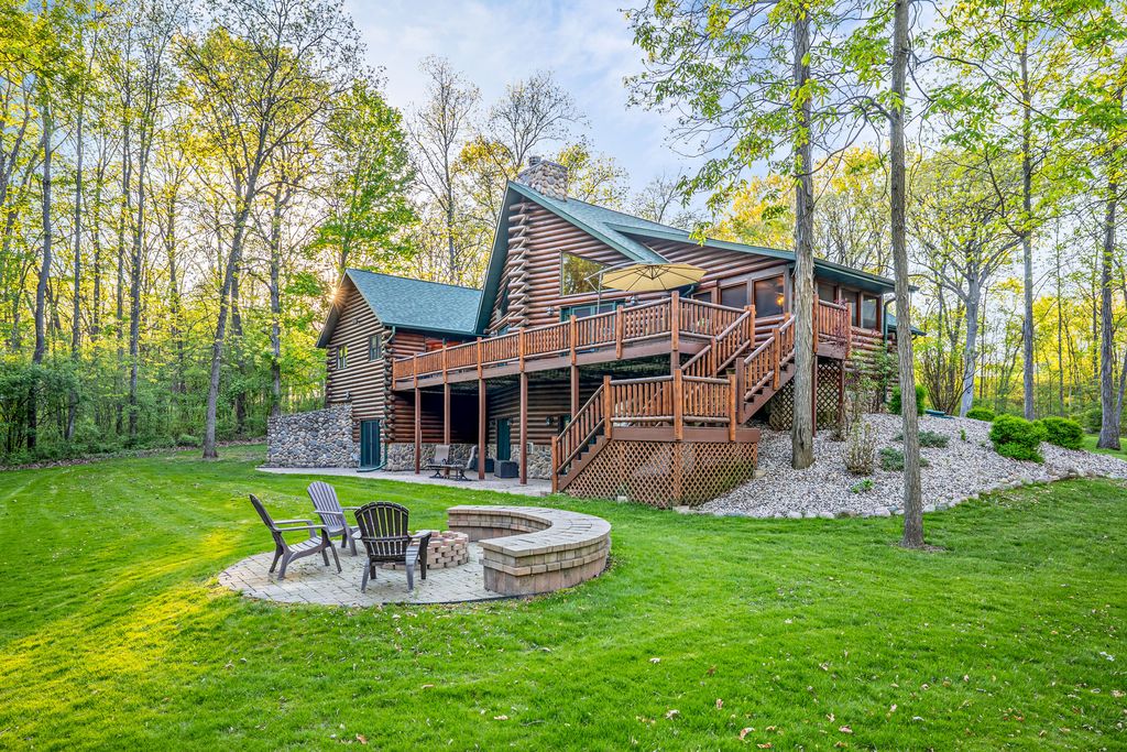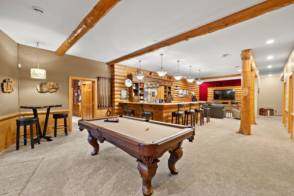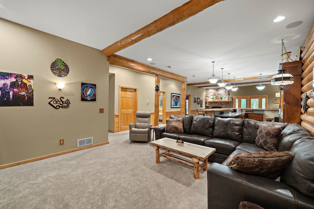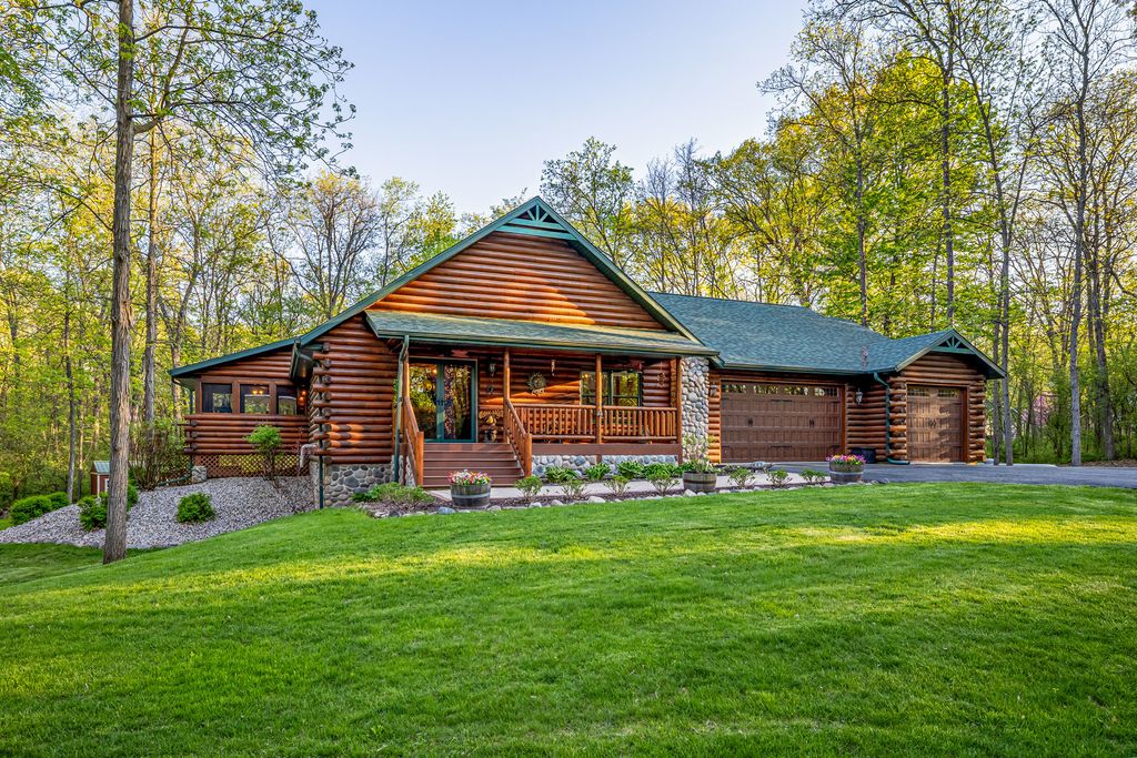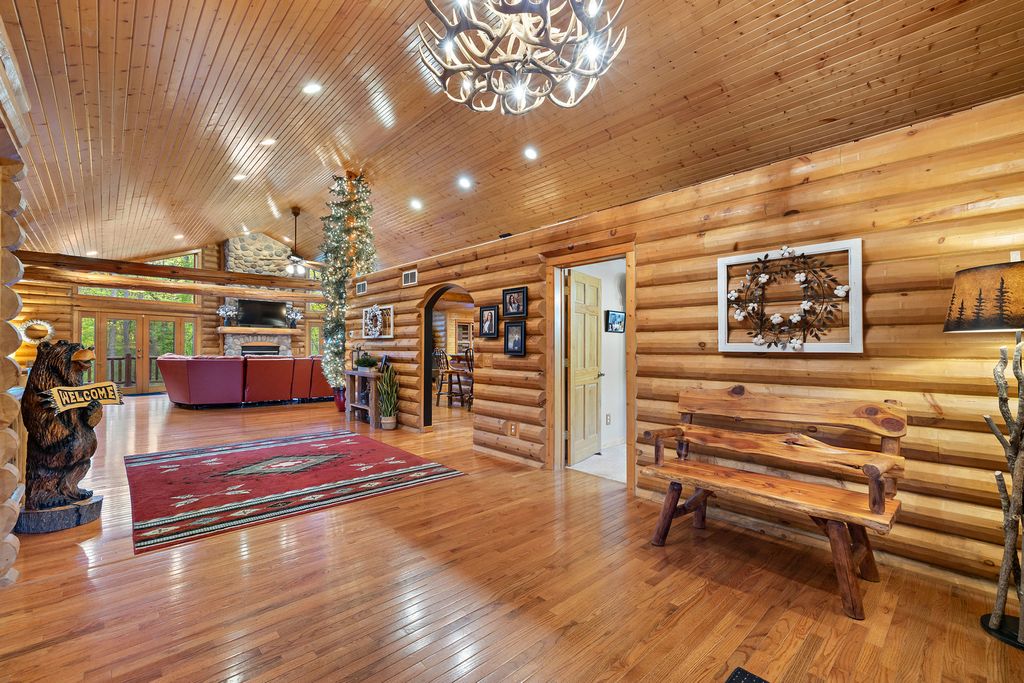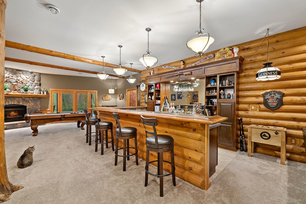 Welcome to W7611 County Road A - a stunning 4-bed, 3.5-bath log home on 5+ wooded acres. With over 4,650 sq ft, this home blends rustic charm and modern luxury. A grand, tree-lined driveway leads to manicured grounds and an inviting front yard. Inside, enjoy soaring ceilings, rich wood finishes, two impressive floor-to-ceiling fireplaces, a custom bar, and a top-tier theatre room. Roughly 1 mile of private walking trails wind through the woods on property. Just minutes from Whitewater Lake Turtle Lake and nearby nature preserves, this retreat offers elegance, comfort, and seclusion. Perfect as a year-round residence or a luxurious weekend escape, this one-of-a-kind property invites you to relax, entertain, and enjoy nature at your doorstep.