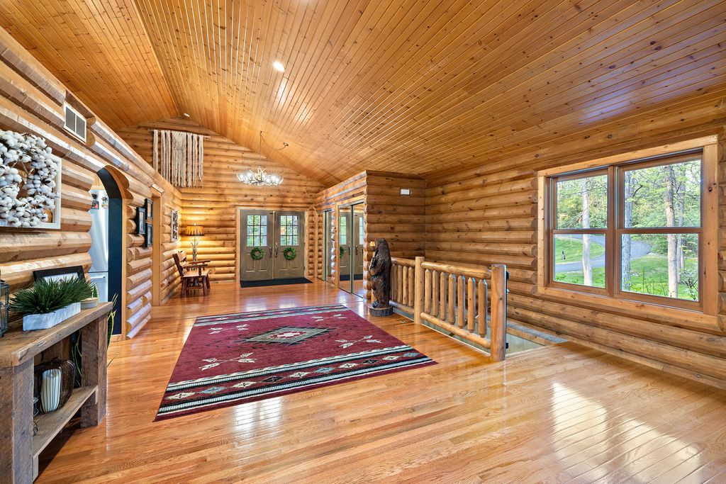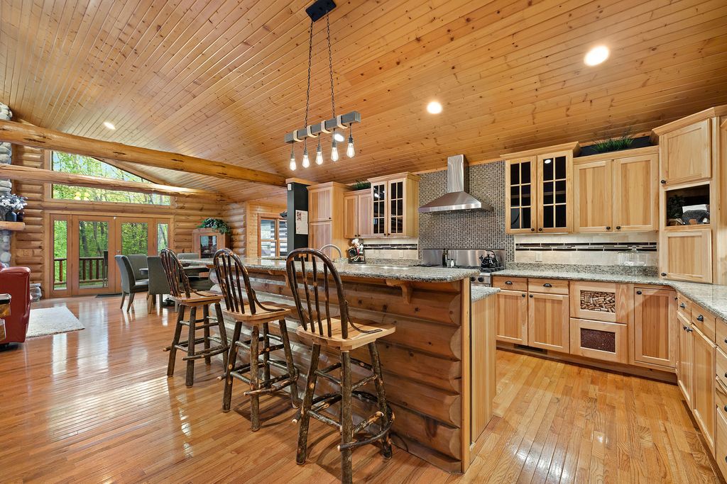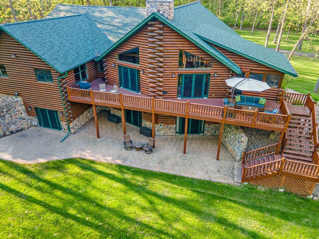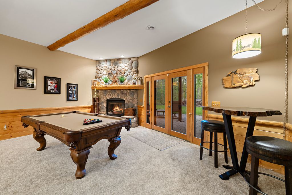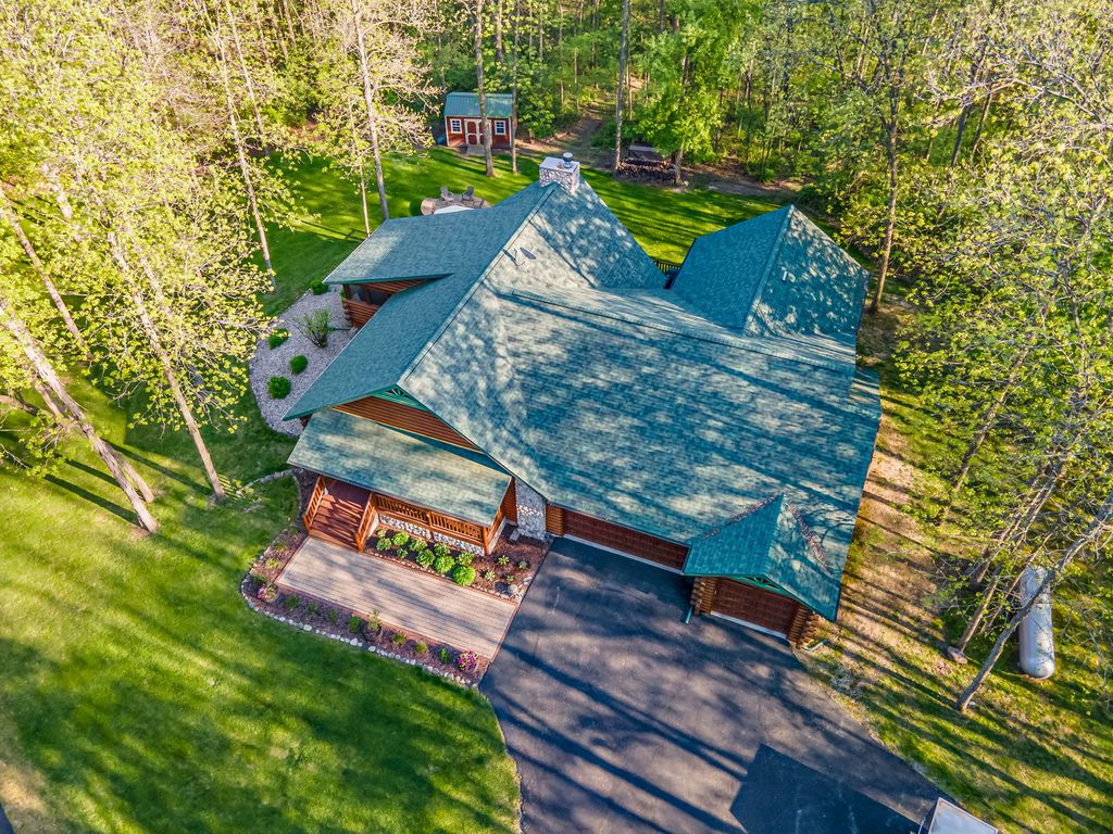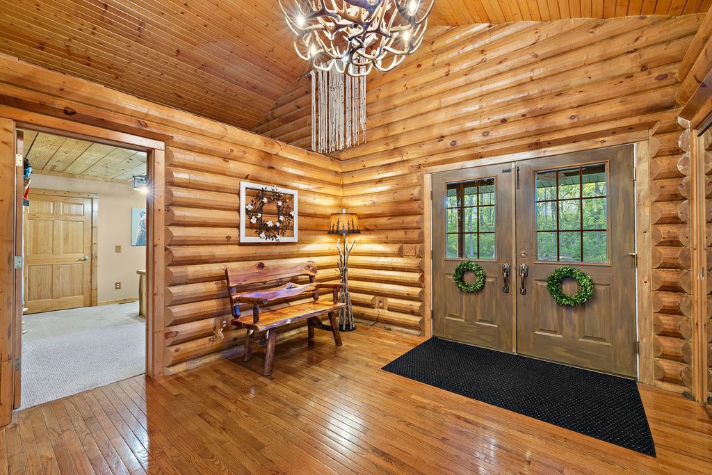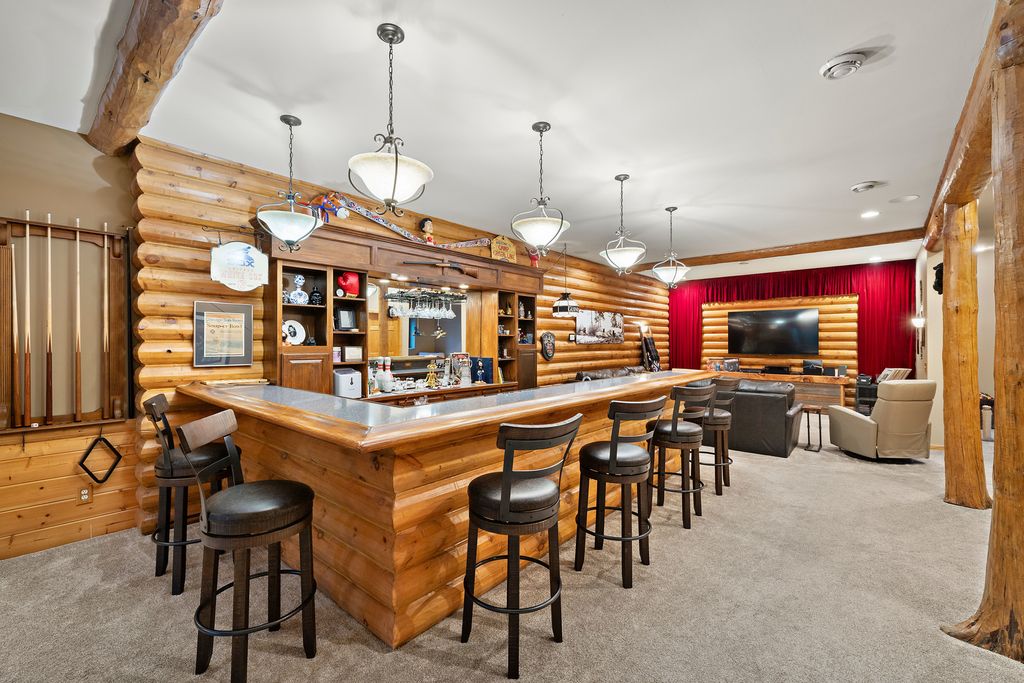 Welcome to W7611 County Road A - a stunning 4-bed, 3.5-bath log home on 5+ wooded acres. With over 4,650 sq ft, this home blends rustic charm and modern luxury. A grand, tree-lined driveway leads to manicured grounds and an inviting front yard. Inside, enjoy soaring ceilings, rich wood finishes, two impressive floor-to-ceiling fireplaces, a custom bar, and a top-tier theatre room. Roughly 1 mile of private walking trails wind through the woods on property. Just minutes from Whitewater Lake Turtle Lake and nearby nature preserves, this retreat offers elegance, comfort, and seclusion. Perfect as a year-round residence or a luxurious weekend escape, this one-of-a-kind property invites you to relax, entertain, and enjoy nature at your doorstep.