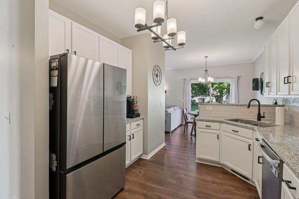 Welcome to this beautifully maintained 2-bedroom, 2.5-bath townhome in Aurora, offering stylish comfort and convenience in a prime location. Step inside to find wood laminate flooring and neutral paint tones throughout the main living areas, creating a warm and inviting atmosphere. The spacious living and dining rooms flow seamlessly into the modern kitchen, which features stainless steel appliances, granite countertops, and a sleek tile backsplash. Soaring ceilings and an abundance of windows in the living room fill the space with natural light. Enjoy the convenience of a private entrance, a main floor powder room, and direct access to an attached 2-car garage with additional overhead storage. Upstairs, a versatile loft space provides the perfect spot for a home office, reading nook, or play area. The primary suite is a true retreat with high ceilings, a walk-in closet, and a private ensuite bath that has been recently updated, including a reglazed tub/shower in crisp white. A second generously sized bedroom, full hallway bath, and laundry area complete the upper level. Step outside to your private patio with serene courtyard views-ideal for relaxing or entertaining. Located just 10 minutes from I-88 and less than 15 minutes to Route 59's shopping and dining corridor, this home is also part of the highly rated Indian Prairie 204 School District. Recent upgrades include a new AC and furnace (2021), washer and dryer (2021), granite kitchen counters and backsplash (2022), new carpet (2024), a refreshed primary bath, a new sliding patio door (2025), and modern lighting throughout. With close proximity to downtown Aurora and a welcoming neighborhood, this home offers the perfect blend of comfort, style, and location.