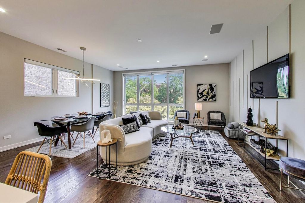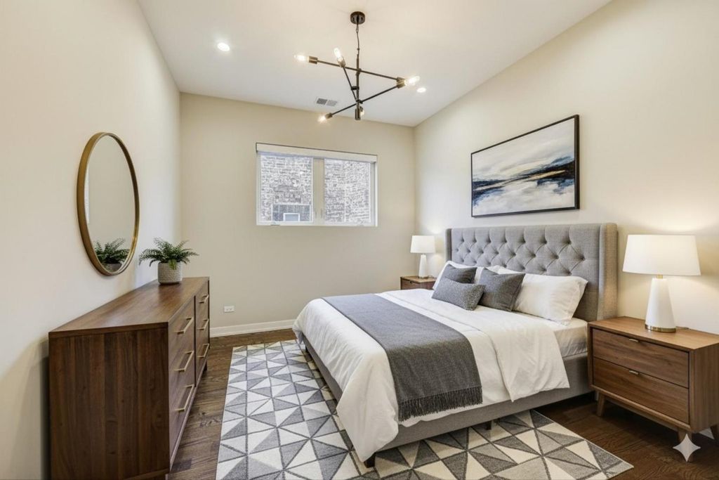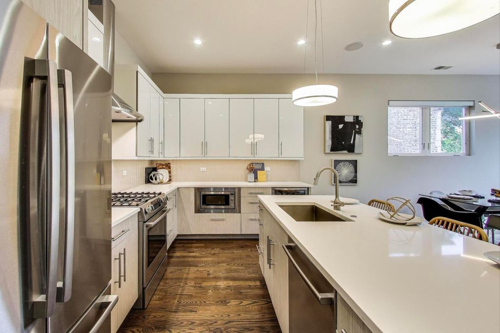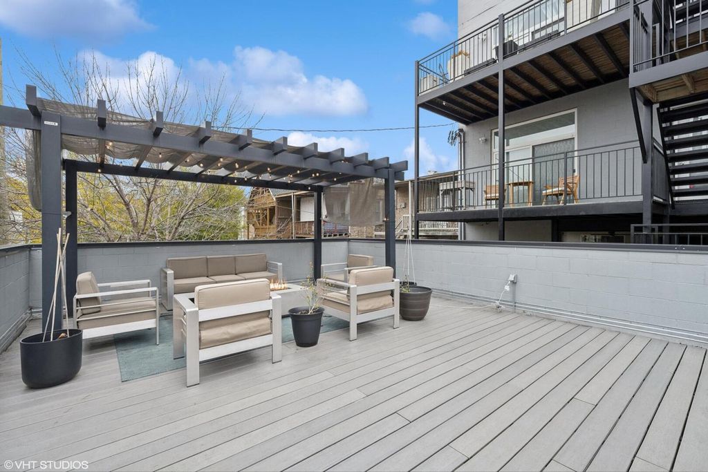 Incredible extra wide 3BR/2BA condo in Logan Square with a massive 450 square foot private garage rooftop deck. This newer construction home, built in 2018, features 21-ft wide interior, 10-ft ceilings and over-sized windows to give a very bright & airy feel overlooking the treetops. The fantastic open kitchen with large island boasts two toned custom cabinets, quartz countertops, stainless steel appliances by Bosch including a beverage cooler & a direct exhaust hood, undermount lighting, and a designer tile backsplash. The giant living & dining room combo with an accent wall, includes integrated 5.1 surround sound. The luxurious primary bedroom can easily accommodate a king-sized bedroom set and includes another accent wall and a walk-in closet. The magnificent primary bathroom has a walk-in rain shower with steamer, double quartz vanities and a heated floor. Both the 2nd & 3rd bedrooms are generously sized that can fit queen-sized bedroom sets easily and are perfect for a nusery/guest room/office. The secondary bathroom is nicely finished with a deep soaking tub & designer tile work. This homes has great storage with organized closets throughout, a large coat closet, pantry closet, and laundry closet with a side-by-side washer & dryer. The TWO outdoor spaces includes a large back terrace with a gas line for a grill. The amazing garage rooftop deck is upgraded with composite decking and an aluminum pergola for ultra low maintenance. The outdoor furniture and garage parking are included! Phenomenal location that's steps to The 606, Palmer Square, some of the city's best dining/coffee/cocktails, shops, and nightlife.
