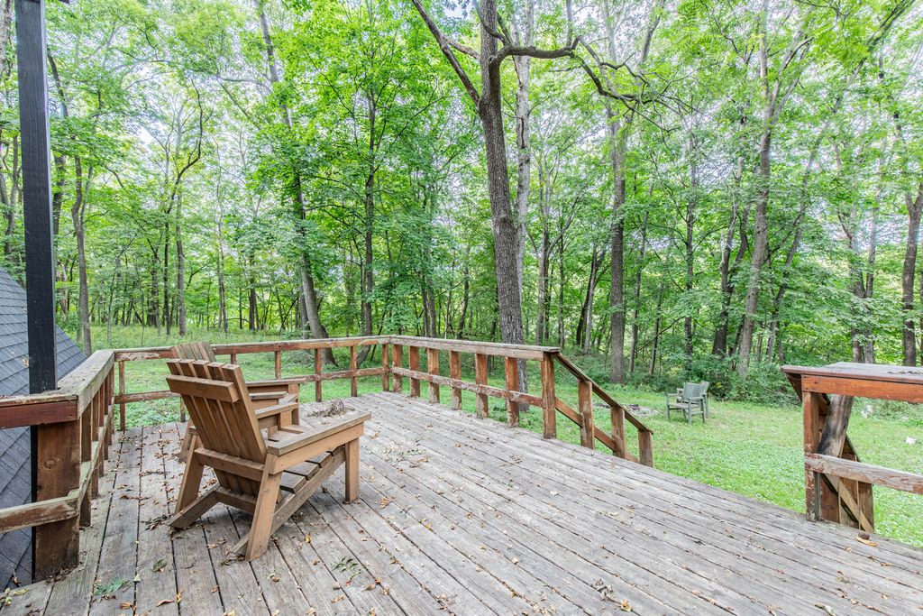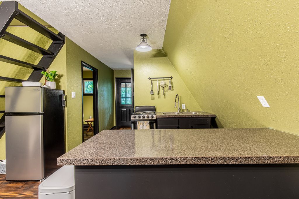 Escape to this fully remodeled, modern A-Frame cabin nestled on over half an acre of serene, wooded land. Offering the perfect blend of privacy and convenience, this 2-bedroom, 1-bath home is a peaceful getaway that's just a short drive from the best of outdoor recreation. Located less than 1 mile from Lake Thunderbird, enjoy access to a variety of amenities including a clubhouse, boating, fishing, kayaking, swimming, and more. This cozy cabin features an open living area with a family room, dining room, and a warm, inviting fireplace-perfect for unwinding after a day of adventure. Recent updates include new roof, new flooring, fresh paint, updated bathroom, and a new hot water heater, ensuring peace of mind and comfort. Additionally, enjoy the beautiful outdoors from the large patio or gather around the fire pit for a night of stargazing and s'mores. The furniture is included with the sale.