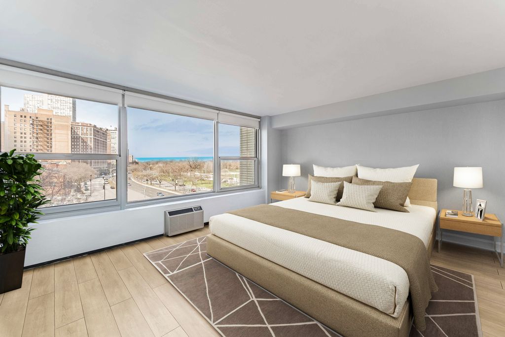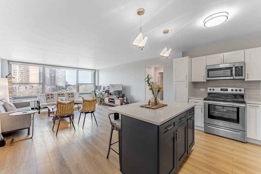 Beautifully updated 1-bed, 1.5-bath condo with sweeping north-facing views of Lake Michigan. This 900 sq ft home features an open-concept layout, sleek new kitchen with custom cabinetry and appliances, luxury vinyl flooring throughout, and a spacious bedroom with an updated en-suite bath. Full-service building includes 24/7 door staff, fitness center, rooftop deck, award-winning patio with grills, convenience store, and additional storage. Unbeatable location-steps to the lake, Wrigley, Broadway shops, dining, and express buses. Walk Score 89, Transit Score 80, Bike Score 87. Rental parking available nearby. Don't miss this perfect blend of comfort, style, and location. Schedule your showing today and see the lakefront lifestyle for yourself!