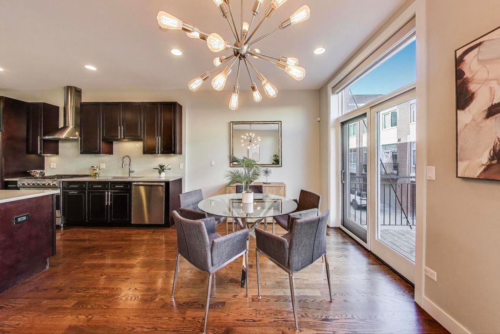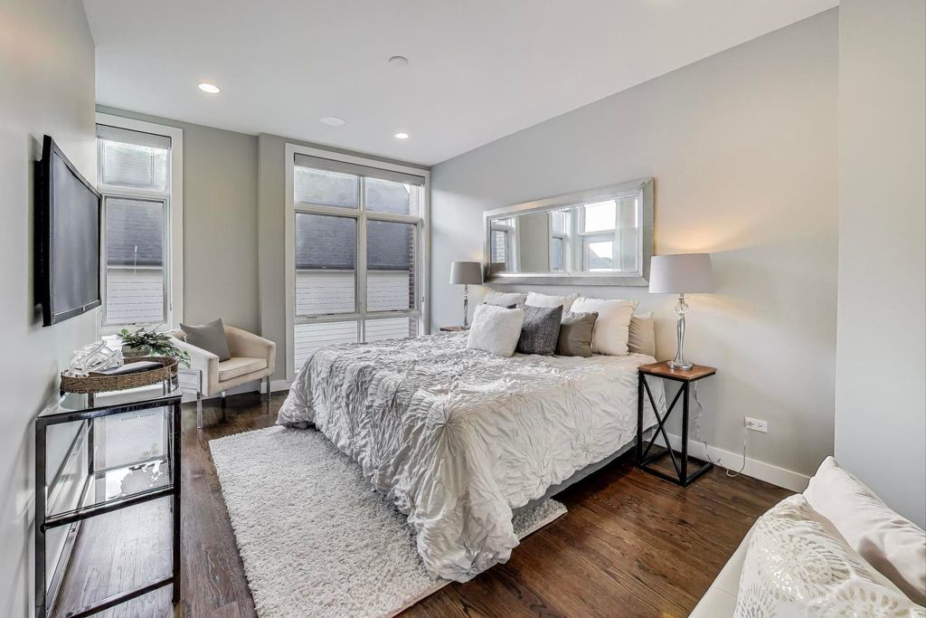 Beautifully cared-for, fee-simple, all-brick 4-bedroom, 3.1-bath townhome tucked away in a peaceful riverfront community surrounded by mature trees and lush greenery. Spanning nearly 2,500 sq. ft., this bright residence lives like a single-family home while offering the ease of a 2-car attached garage and three private outdoor spaces. The main level showcases an inviting open layout with hardwood floors, a warm fireplace, and a chef's kitchen featuring quartz countertops, stainless steel appliances, a center island with seating, abundant cabinetry, and a stylish built-in buffet perfect for a coffee or wine bar. A designated dining area, living room, play area, powder room and balcony off dining room complete this floor. Upstairs, you'll find three spacious bedrooms, two full bathrooms, and a washer and dryer. The primary suite is a true retreat with dramatic floor-to-ceiling windows, a walk-in closet, and its own balcony. The spa-like ensuite bath is complete with heated floors, dual vanities, a steam shower, and a soaking tub. The lower level adds flexibility with a 4th bedroom/office/gym, a full bathroom with direct access to a private patio. Ideally located where Lincoln Park meets Lakeview, this quiet community provides effortless access to Roscoe Village, Bucktown, Logan Square, Hamlin Park, Midtown Athletic Club, Fresh Thyme, Binny's, Hexe Coffee, expressways, and more.