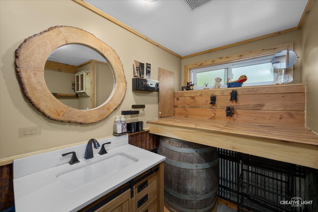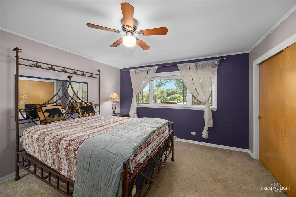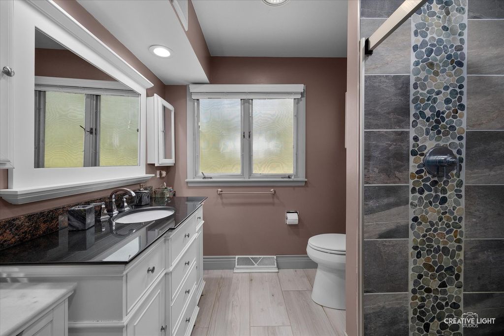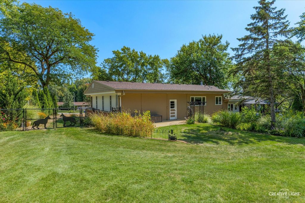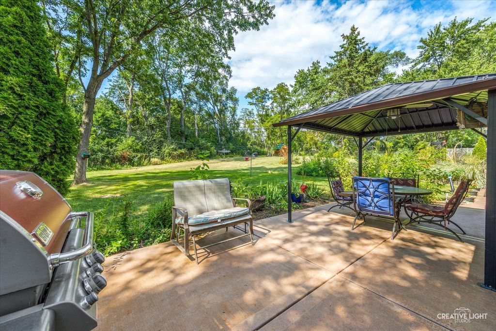 Hurry! Rare opportunity to find a custom home on just under an acre in this neighborhood! Tucked away in a cul-de-sac, this home stands up tall! Long driveway approach! Brick and stone front! Covered front porch! Hardwood entry! Cozy living room with massive glass picture window with endless views! Solid brick fireplace with custom mantle and sliding door to the front concrete patio with built-in exterior fireplace, great for summer nights! Updated eat-in kitchen with 42" custom cabinetry, stainless steel appliances, tile backsplash, upgraded granite countertops, extra recessed lighting and sliding door to the oversized patio! Separate flexible dining area! Spacious master bedroom with double closets! Gracious size secondary bedrooms all with small picture windows! Update hall bath with raised vanity and walk-in stone shower with seat! Finished lower level with family room with tin wainscoting, custom barrel bar, flex/laundry area and upgraded full bath with walk-in shower! Great storage in the crawl space! Stunning fenced yard with mature trees and perennials! Storage shed! Deep garage! Newer roof and driveway! Warmth and character are in abundance with this home! Quick access to train and I-90! A 10+!