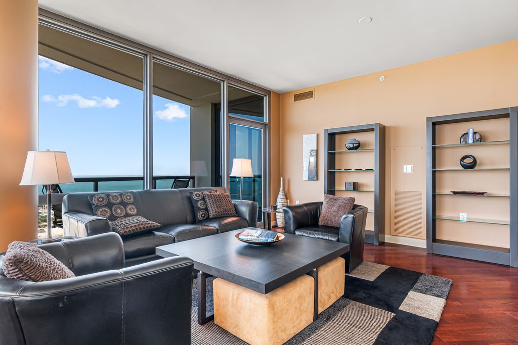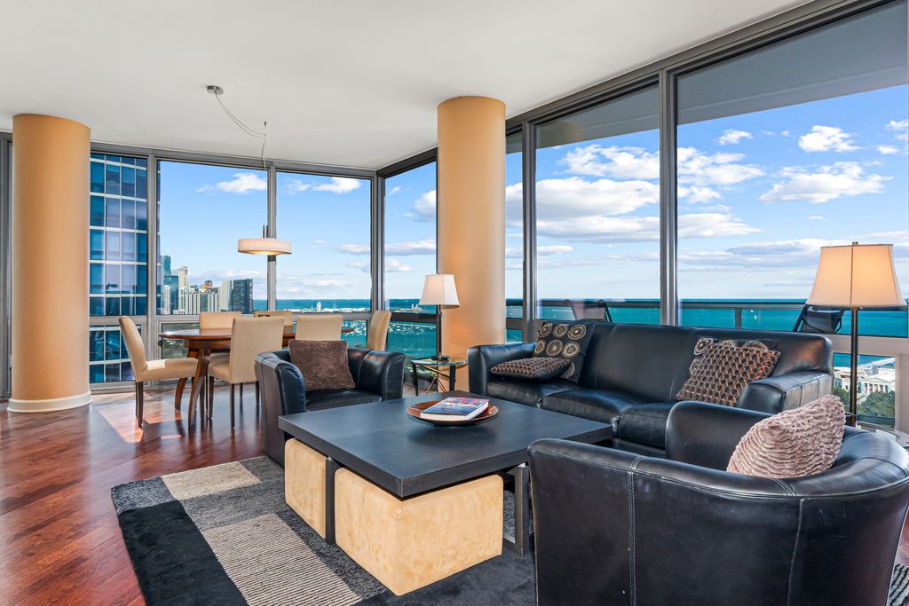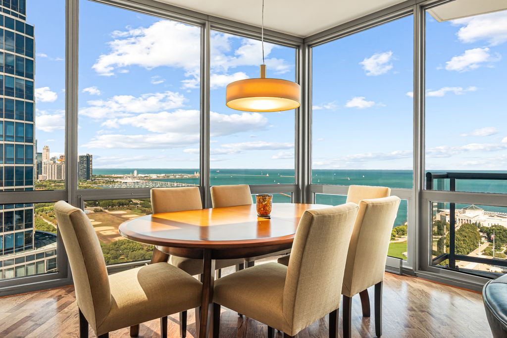 Experience stunning north and east views overlooking the Museum Campus, Lake Michigan, and the Chicago skyline from this high-floor residence in the coveted "01" tier at Museum Park. This spacious 2 bedroom, 2 bath plus den home features an open layout with hardwood floors throughout, floor-to-ceiling windows, and a private balcony with sweeping lake and city views. The den is ideal for a home office or flex space. The kitchen offers granite countertops, stainless steel appliances, double ovens, and ample cabinet space, opening to a bright dining area surrounded by glass. The primary suite includes a walk-in closet and en-suite bath, while the second bedroom offers generous proportions and equally impressive views. Additional highlights include in-unit laundry, abundant storage, and one of the most desirable floor plans in the building. Located in the heart of the South Loop, Museum Park offers full amenities, steps to the lakefront, museums, dining, and public transit. Two side by side parking spots sold separately.