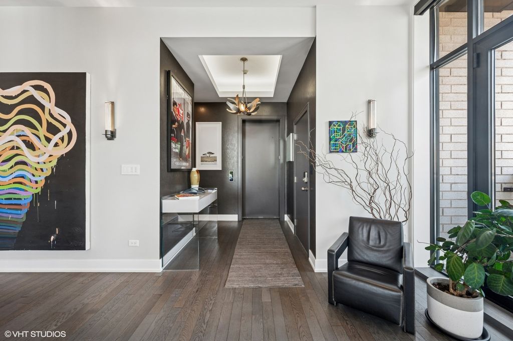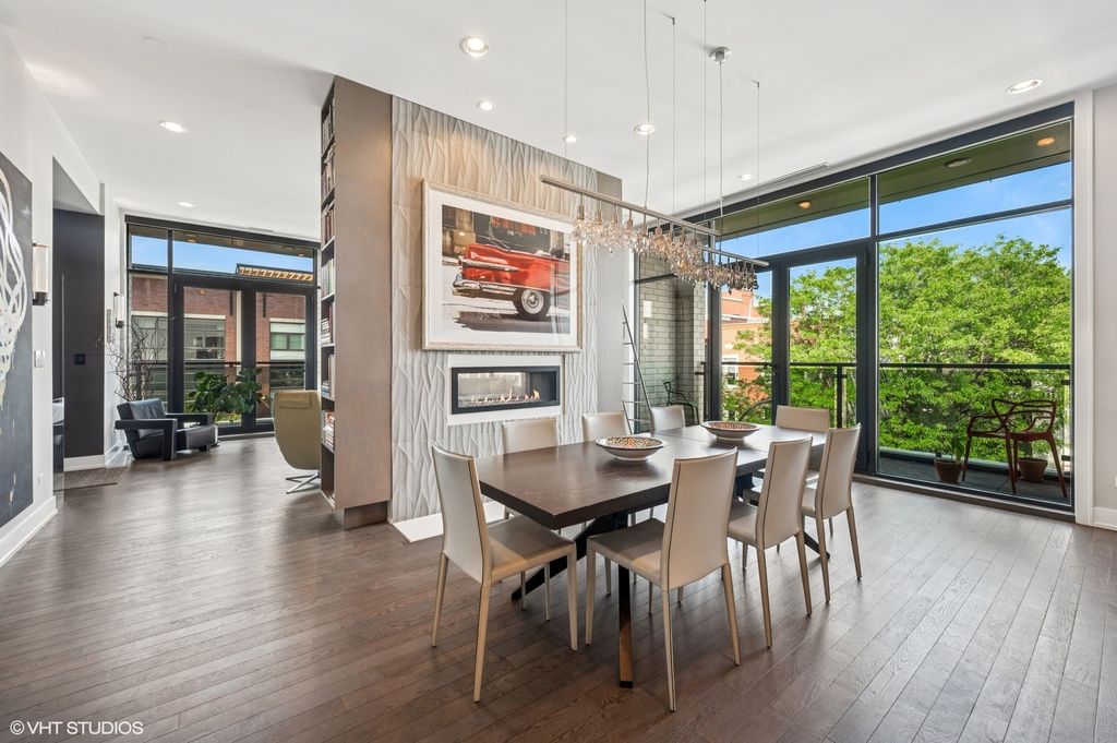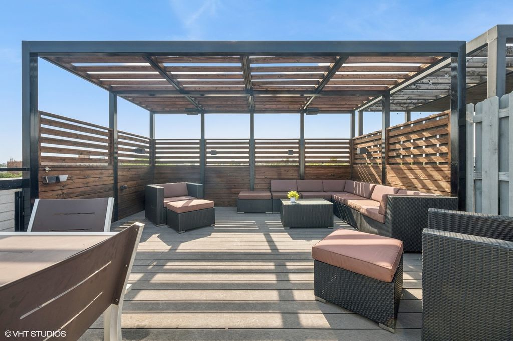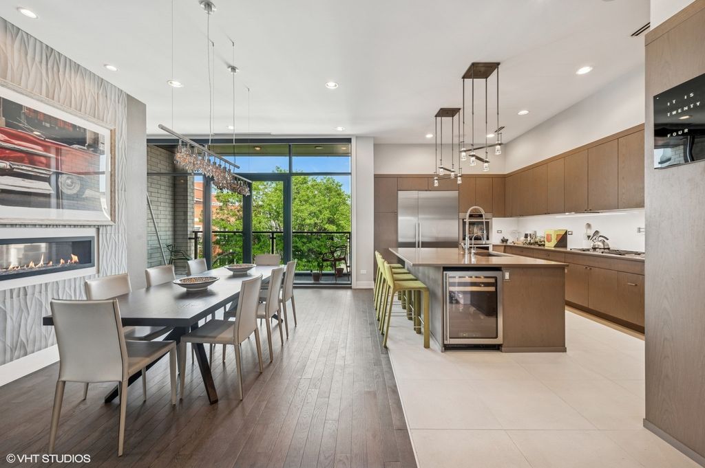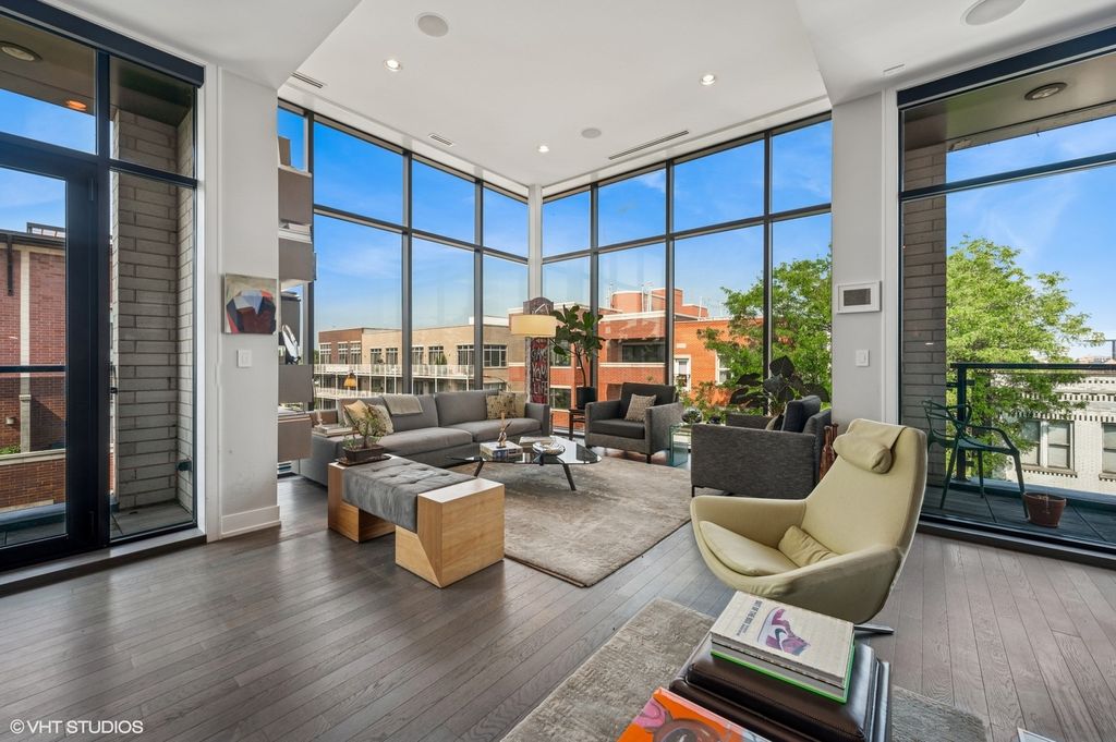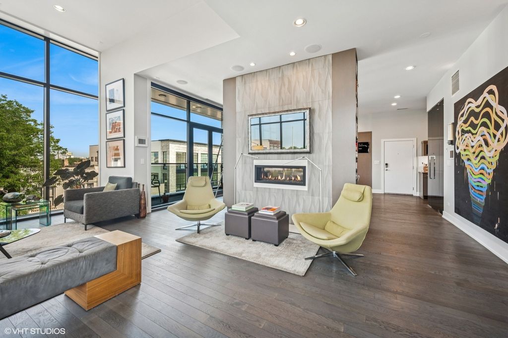 Spectacular full-floor 3 bed, 3.1 bath penthouse condo with direct and private elevator access is perfectly situated in prime Bucktown at the corner of Damen and Shakespeare. Soaring 18' ceilings and dramatic windows flood this home with natural light, while an expansive private rooftop terrace offers unmatched skyline views. Rare, boutique elevator building offers 2-car attached and heated garage parking. Designed for luxurious living and effortless entertaining with more than 2,800 square feet of living space and open-concept living. The spacious living room is framed by dramatic floor-to-ceiling east and north facing windows and a sleek dual-sided fireplace. The adjacent dining area is anchored by a full wet bar and a striking, floor to ceiling, custom glass wine cellar. The ultimate chef's kitchen offers sleek quartz countertops, generous custom cabinetry, and high-end appliances-including a built-in Miele coffee system, double ovens, pot filler, dual dishwashers, and two beverage/wine refrigerators. Just off the living room, two private balconies extend your entertaining space and offer the perfect setting for morning coffee or evening cocktails. The luxurious primary suite features a generous walk-in closet and spa-like bath with dual vanities, a jetted soaking tub, and steam shower. Two spacious secondary bedrooms, each with its own en-suite bath for comfort and privacy. Upstairs, an expansive private rooftop deck offers a true outdoor oasis with sweeping panoramic views of the city skyline. Thoughtfully designed for entertaining and relaxation, this incredible space features built-in seating, an outdoor TV/lounge area, a pergola offering shade and style, and both water and gas lines for easy outdoor cooking and hosting. Attached and heated two-car garage and dedicated storage. Ideally located near Bucktown's best dining, shopping, the 606 Trail, public transport, Midtown Athletic Club and more. Pulaski Elementary School district. Come see this rare offering!