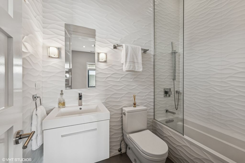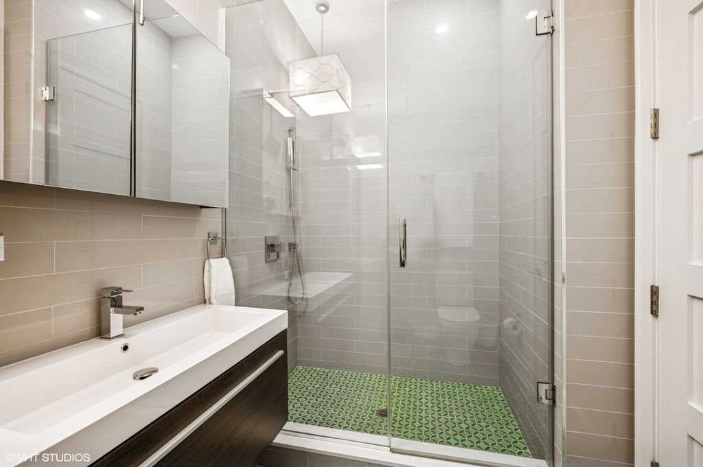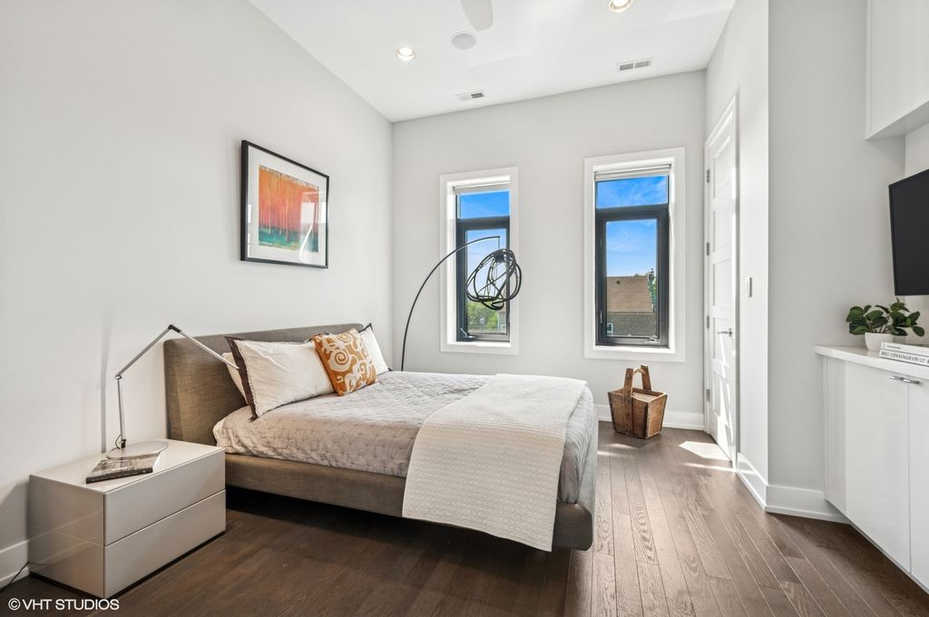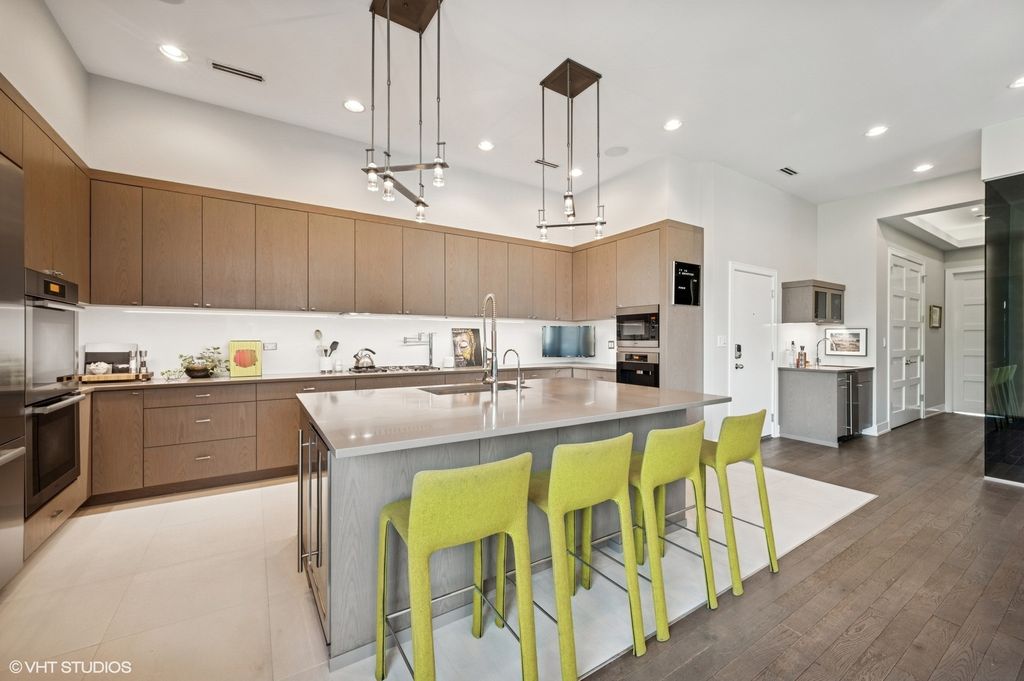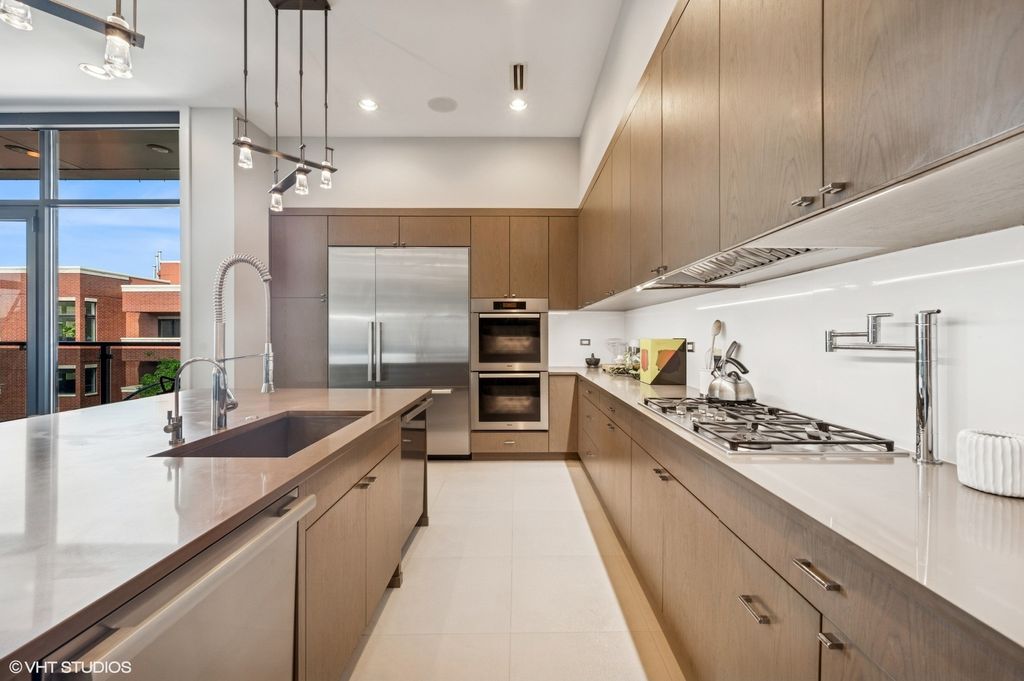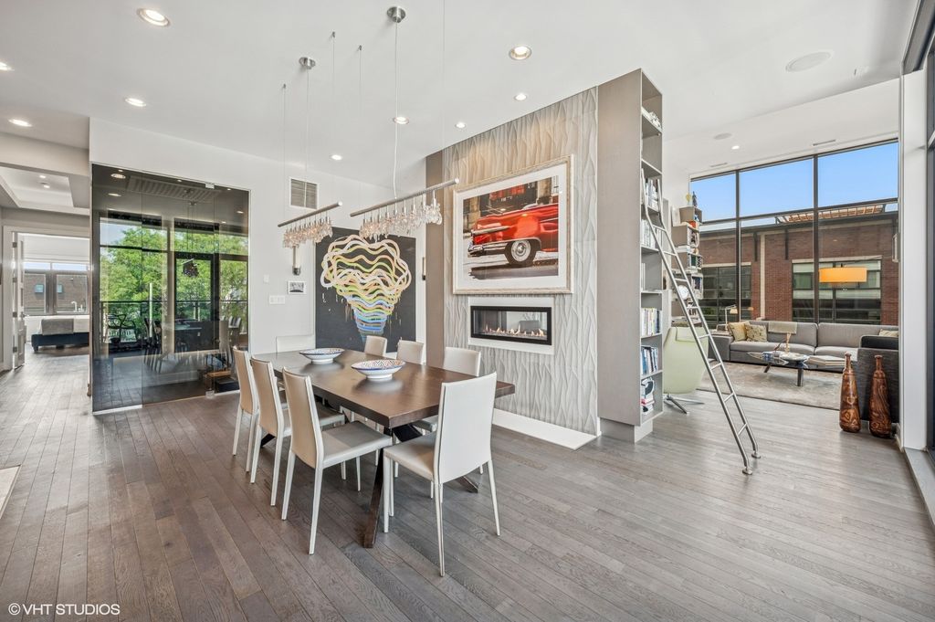 Spectacular full-floor 3 bed, 3.1 bath penthouse condo with direct and private elevator access is perfectly situated in prime Bucktown at the corner of Damen and Shakespeare. Soaring 18' ceilings and dramatic windows flood this home with natural light, while an expansive private rooftop terrace offers unmatched skyline views. Rare, boutique elevator building offers 2-car attached and heated garage parking. Designed for luxurious living and effortless entertaining with more than 2,800 square feet of living space and open-concept living. The spacious living room is framed by dramatic floor-to-ceiling east and north facing windows and a sleek dual-sided fireplace. The adjacent dining area is anchored by a full wet bar and a striking, floor to ceiling, custom glass wine cellar. The ultimate chef's kitchen offers sleek quartz countertops, generous custom cabinetry, and high-end appliances-including a built-in Miele coffee system, double ovens, pot filler, dual dishwashers, and two beverage/wine refrigerators. Just off the living room, two private balconies extend your entertaining space and offer the perfect setting for morning coffee or evening cocktails. The luxurious primary suite features a generous walk-in closet and spa-like bath with dual vanities, a jetted soaking tub, and steam shower. Two spacious secondary bedrooms, each with its own en-suite bath for comfort and privacy. Upstairs, an expansive private rooftop deck offers a true outdoor oasis with sweeping panoramic views of the city skyline. Thoughtfully designed for entertaining and relaxation, this incredible space features built-in seating, an outdoor TV/lounge area, a pergola offering shade and style, and both water and gas lines for easy outdoor cooking and hosting. Attached and heated two-car garage and dedicated storage. Ideally located near Bucktown's best dining, shopping, the 606 Trail, public transport, Midtown Athletic Club and more. Pulaski Elementary School district. Come see this rare offering!