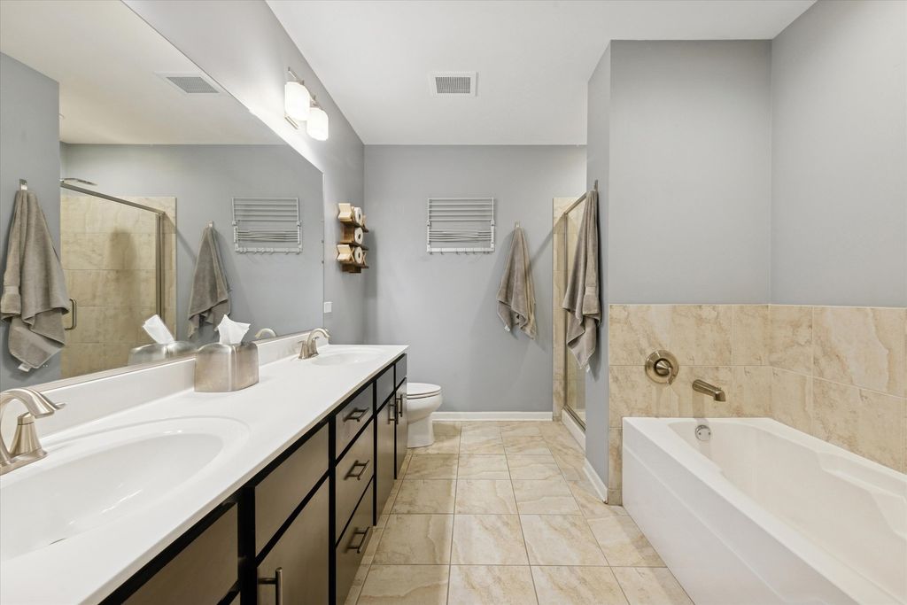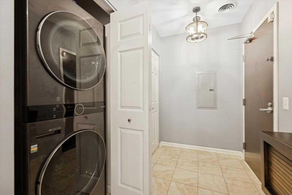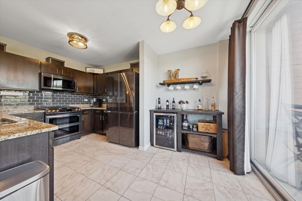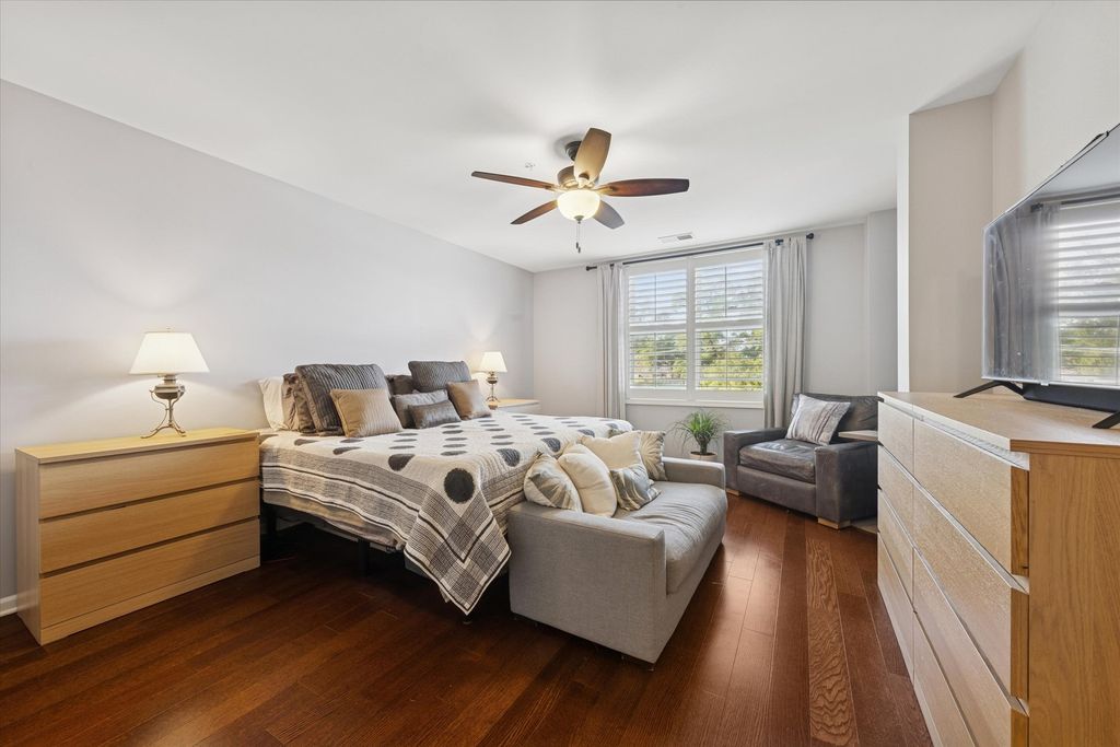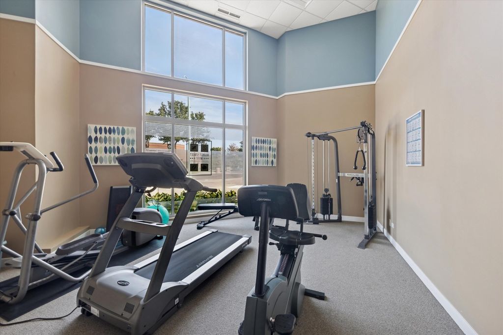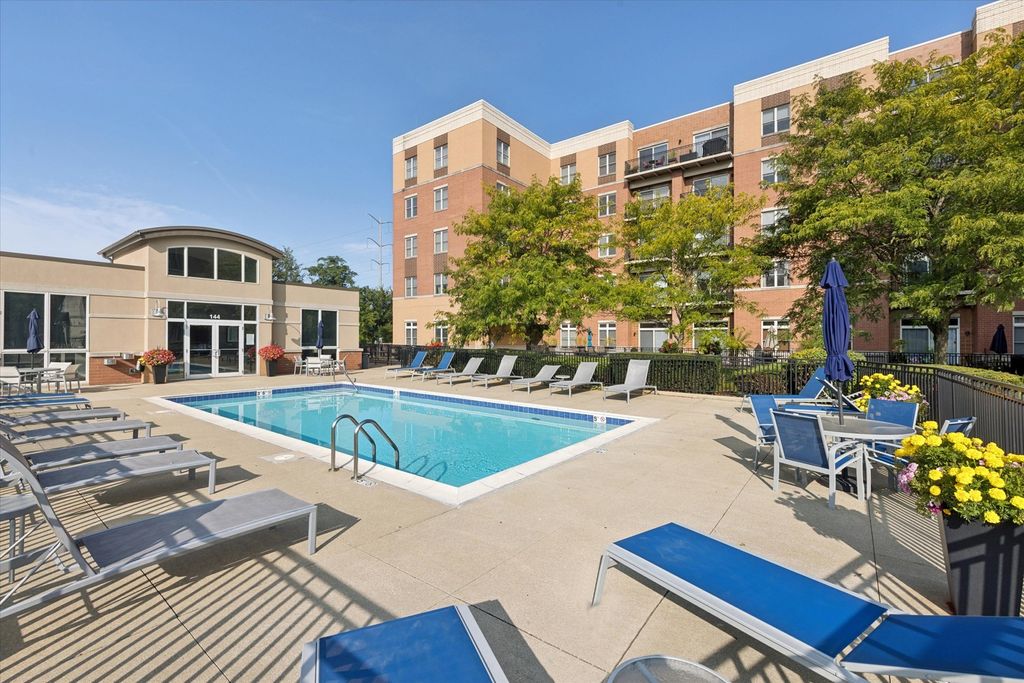 This natural light filled northwest corner condo offers an open concept living/dining and kitchen space. There are hardwood floors throughout and custom plantation shutters. The kitchen opens to a balcony for morning coffee or evening grilling. Enjoy new stainless appliances and a large kitchen island that offers additional seating. The primary suite has a large double sink and both walk-in shower and separate tub. Closets have custom built-in organizers along with additional storage throughout the unit. A new washer and dryer provides for in-unit laundry. Amenities include an outdoor heated pool and clubhouse, heated parking garage, exercise room, storage cage and bike storage areas. Conveniently located near the commuter train, restaurants and shops, walking paths and village hall.