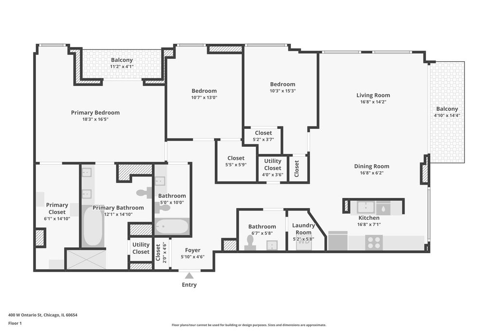 Experience city living at its finest in this 3-bedroom, 2.5-bath River North showplace, soaring above the skyline on the 12th floor with two private balconies offering breathtaking, unobstructed views from every room. A spacious foyer with gallery walls for your art and collections sets the stage for a home that blends sophistication with comfort. The kitchen, appointed with a deep stainless-steel sink and brand new stainless steel appliances, opens seamlessly to the dining and living areas. The result: a bright, airy, open-concept space that's as perfect for entertaining as it is for everyday living. The primary suite is a true retreat, featuring an oversized walk-in closet with custom shelving and a spa-inspired bath with jacuzzi tub, glass-enclosed shower, and sleek vanity. Enjoy the convenience of in-unit laundry. The building features a fully equipped gym and 24-hour doorperson service. Step outside to the vibrant heart of River North-where world-class dining, shopping, nightlife, Whole Foods, public transit, and the Chicago Riverwalk are all at your doorstep.
