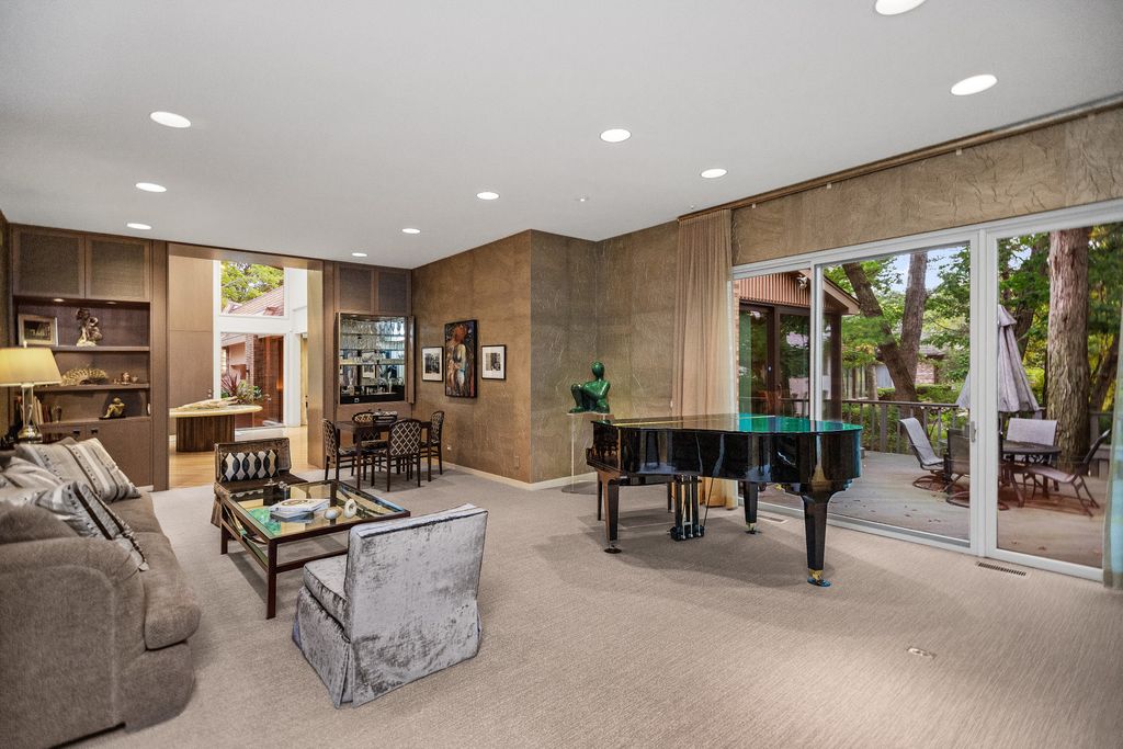 Experience the height of North Shore sophistication at 990 Sheridan Road -- an impressive ranch offering 4575 square feet of refined living space. Located down a long driveway, this exceptionally pristine ranch is set among towering trees. Three car heated garage, motor court, and circular drive awaits you. From the moment you enter, the home's grand scale is revealed through the Foyer's soaring ceiling, expansive windows and skylights, that bathe the interior in natural light, beautifully highlighting the hardwood floors and walls for art. In addition there is recessed lighting throughout the entire home. At the heart of the home is a stunning chef's Kitchen featuring a huge Island with quartzite counters, many built-ins, as well as seating, work space, sink, and built-in Dishwasher. Gorgeous custom cabinetry around the large side by side Sub Zero refrigerator/freezer, double large Wolf ovens and 5 burner gas cook top also on quartzite counters. Under cabinet lighting and skylights. Spacious eating area w/sliding doors to the Trex wrap around deck and huge yard. Convenient Laundry/Mudroom with several closets and built-ins, Refrigerator/Freezer, hanging space, one door to the heated three car garage and one to the outside. There is a very spacious separate Dining Room adjacent to the Kitchen, making entertaining easy-- and highlighting the custom buffet and lighting. The open exquisite Living Room has a spectacular doublesided fire place w/crystals, wall of sliding glass doors to the deck, wet bar, and walls for art. Beyond the Living Room is the Family Room w/built-ins, wall of windows, and the other side of the fireplace. This commitment to quality continues in the private quarters-specifically within the Primary Suite: Spacious carpeted Bedroom with sliding glass doors to the deck, luxurious Bathroom creats a spa-like retreat with whirlpool tub, steam shower wih seat, two sinks, skylight, Dressing Room with wall of built-ins and two walk-in closets--One is a giant! Completing the private area are two additional carpeted Bedrooms which are separated by a double sided ensuite bathroom. The fourth Bedroom is being used as an Office with many built-ins and ensuite bathroom with a skylight. As we turn the corner to go downstairs, we pass a beautiful Powder Room and two more coat closets. Beyond the Primary living area, the home's versatilty shines in the expansive finished Basement. The carpeted stairwell has a landing and many windows as we descend to the Lower Level. There are solid core doors, many closets and areas for storage. The Lower Level has the same 4575 sft as the main floor. There is a Bedroom, Bath, Exercise Room, Work Room, Rec Room, huge Cedar Closet, and a huge amount of space for development. There are two hotwater heaters, two furnaces, two AC(2021), two humidifiers, two new electrical panels (2026) and a Generator(2020). Upgraded irrigation system(2021). Ideally located near Rosewood Beach w/new sidewalks in progress directly across the street from the house, Ravinia Elementary school, Ravinia Festival Park, and the Ravinia Metra Station, this exceptional home offers a rare blend of comfort, sophistication, and secure, stylish living.