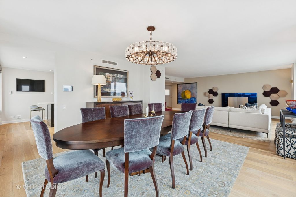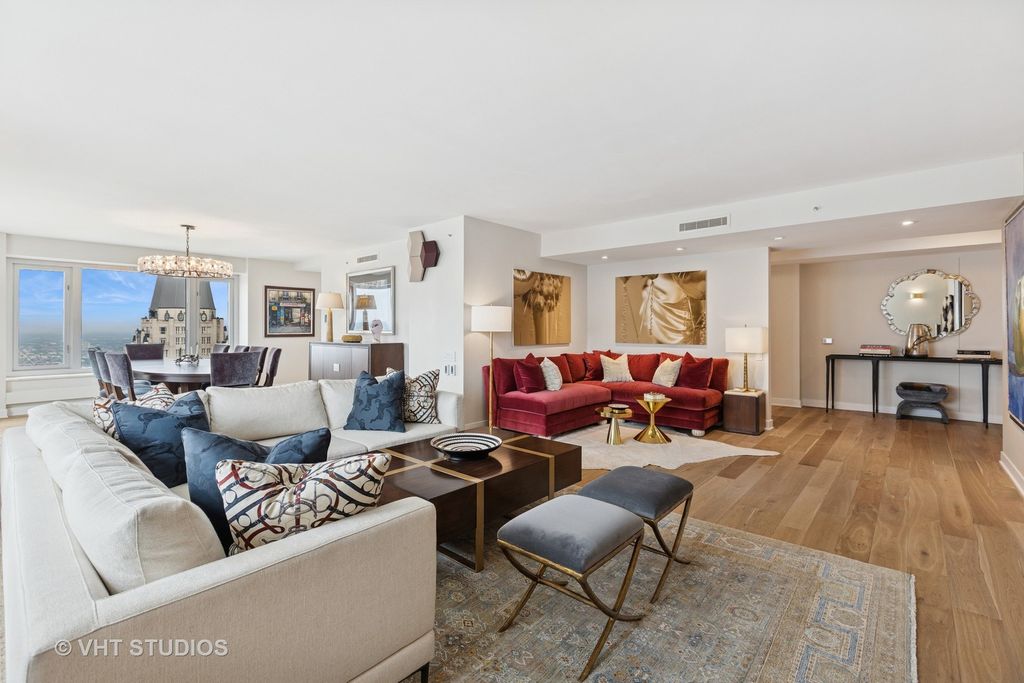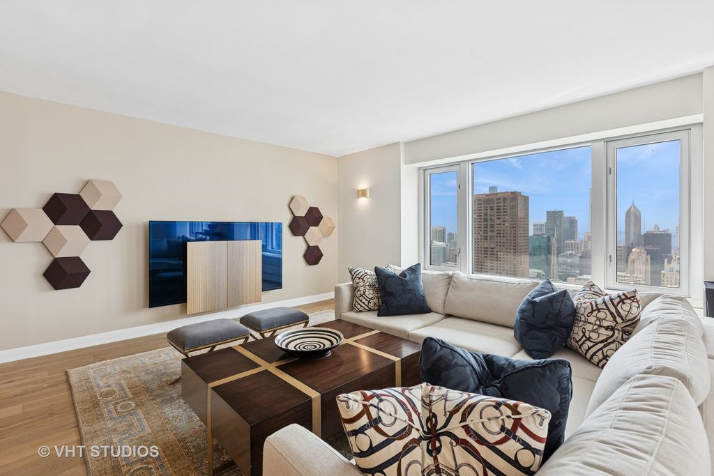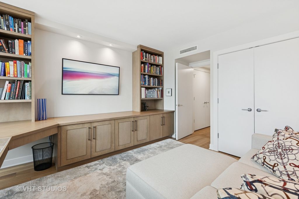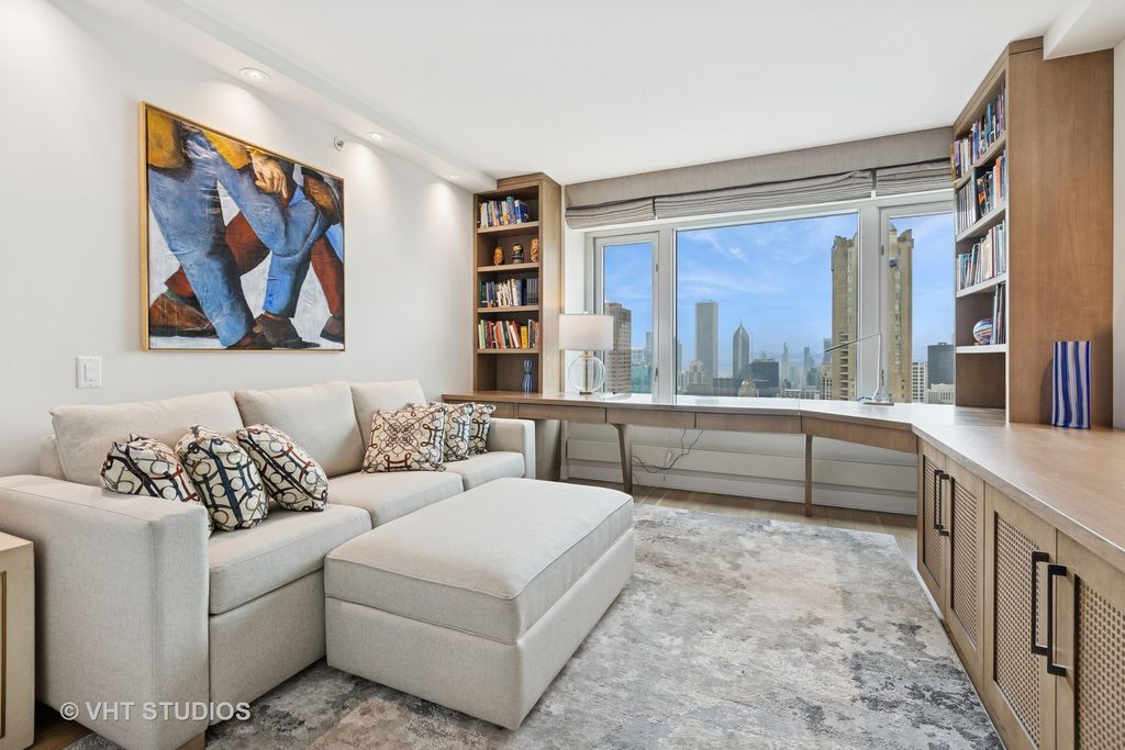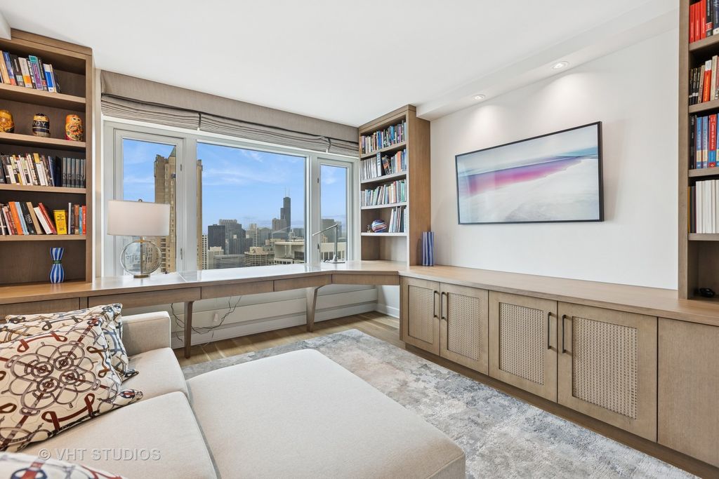 Enjoy the best of luxury living in this sleek, sophisticated southwest corner unit at the Four Seasons Chicago. Unit 5101 was fully rehabbed in 2019 and offers 3 bedrooms, 3 bathrooms spanning 2,500 square feet of beautifully renovated space. High-end finishes throughout include wide-plank oak hand scraped hardwood floors throughout, and window sills made of quartz with custom sewn cushions for added seating. The elegant foyer opens up the expansive living space with city views filling the living room, family room and dining room. The living room has a high-end Bang & Olufsen retractable television with Beolink 5.1 surround sound system. The kitchen was designed with custom cabinetry, quartzite countertops, an island with both seating and storage, and high-end Wolf and SubZero appliances, all new during the renovation. The kitchen island seats 4 people, perfect for in-kitchen dining and watching the sunset. Off the kitchen, find the dry-bar, custom cabinetry with a beverage / wine refrigerator. You will fall in love with the primary suite's two oversized closets, and grand bathroom with custom designed double vanities, a spa-like shower, and soaking tub. The second bedroom is complete with two closets and an en-suite bathroom. The third bedroom was built-out to an office with custom stained walnut cabinetry. The stunning built-in features a dual workstation and plenty of storage. This room is complete with a closet and adjacent to the third full bathroom. The third bathroom has simple elegance with natural looking linen tile. Additional highlights include a large laundry room, spacious storage closet, and Control 4 smart home system throughout controlling all lights, audio, video, and Holly Hunt shades. Residents enjoy access (via membership) to the newly renovated amenities of the Four Seasons Hotel: 24-hour room service, a world-class spa, pristine indoor pool, and state-of-the-art fitness center, room service and more. With round-the-clock staff and concierge-level service, this full-service building delivers an unmatched lifestyle of luxury and convenience. Parking is leased through Metropolis. Storage locker 82 included.