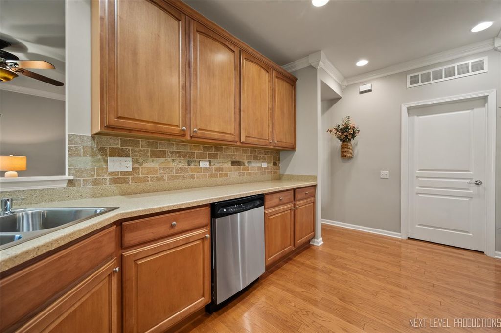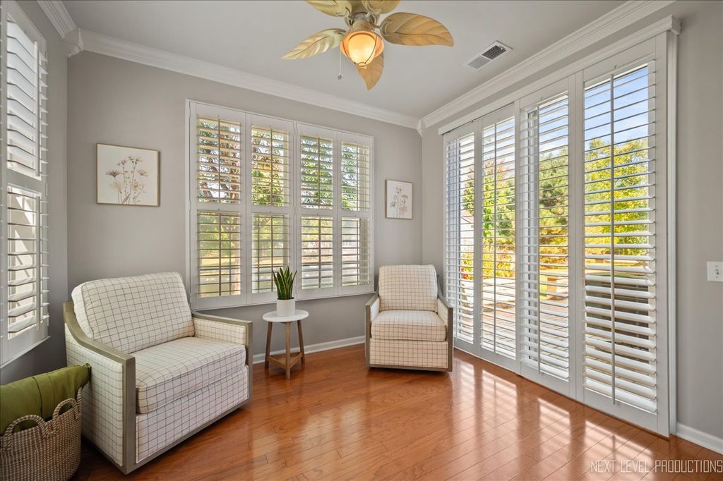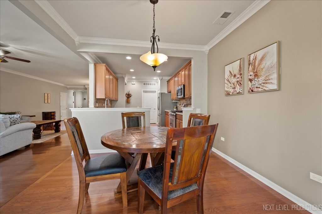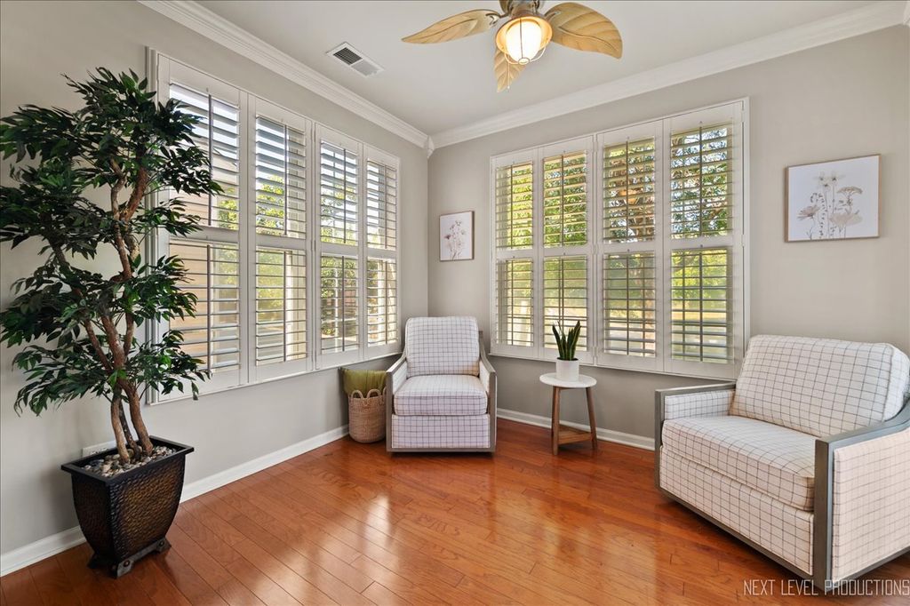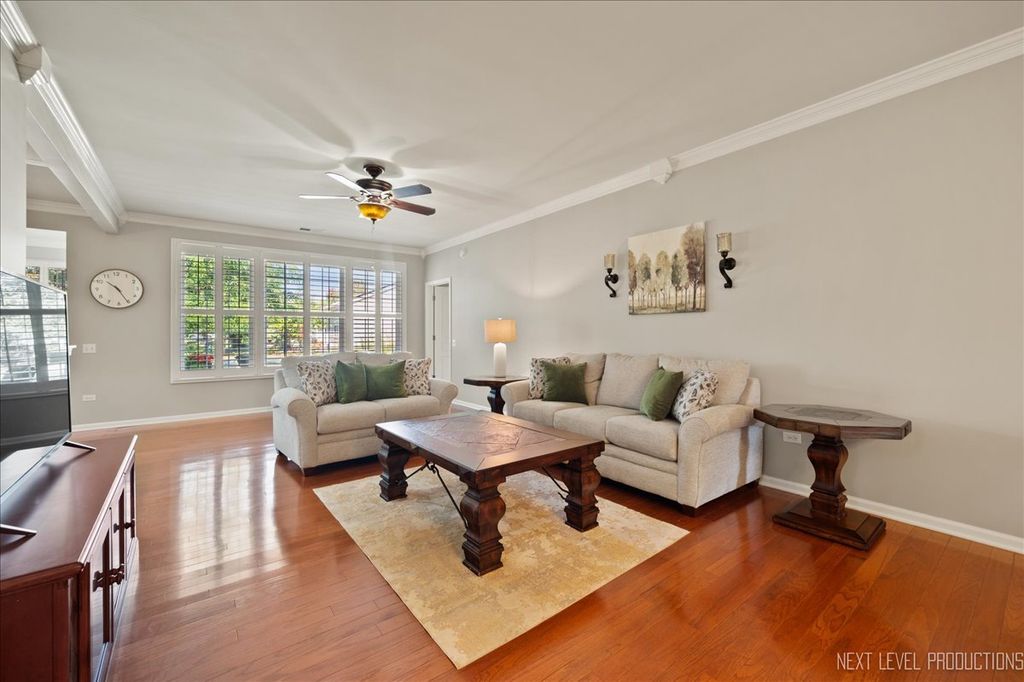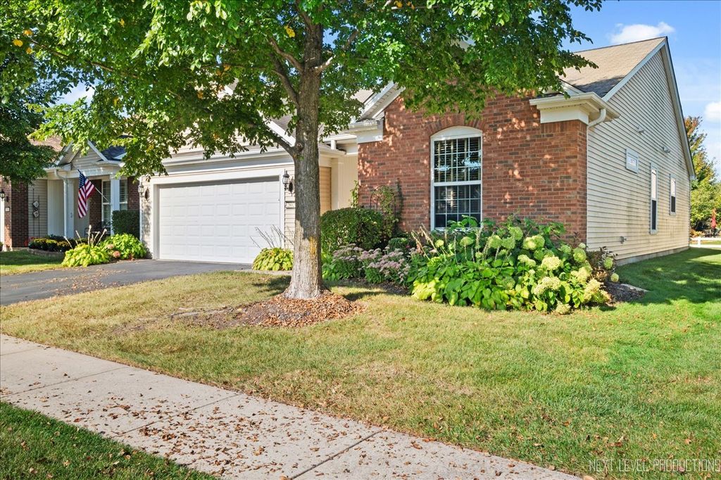 Welcome to this elegant Wilmette model home in Edgewater of Del Webb, which offers fabulous updates and a private location backing directly onto a walking path and nature area. The covered front porch welcomes guests to this lovely home with an open floor plan featuring hardwood floors, white trim with crown molding, panel molding, and custom window treatments, including plantation shutters. This Wilmette model boasts a formal foyer with a guest closet, a large combination great room and formal dining room, and a kitchen equipped with 42" maple cabinets, Corian countertops, stainless steel appliances, and a pantry cabinet. A separate eating area is open to a sunroom with access to a brick paver patio, complete with a SunSetter awning, offering beautiful views. The primary bedroom features a large bay window overlooking the backyard, a spacious walk-in closet, and a primary bath with dual vanities, a soaking tub, a separate shower, and a private commode. The front foyer leads to a hallway where you will find the second bedroom, perfect for guests, a second bath, and a large den that could also be used as a third bedroom. The utility room offers a washer and dryer with a full wall of cabinets above for ample storage, a utility sink, plus all the mechanicals (furnace & A/C new in 2020) are located in a private closet, hidden from view. There is an extended two-car finished garage with attic access, a beautiful epoxy floor, and two large wall storage cabinets, great for extra storage. Enjoy the professionally landscaped yard with a sprinkler system. Residents can enjoy all the amenities, including a clubhouse, indoor/outdoor pools, pickleball, bocce ball, a park, tennis courts, an exercise facility, walking paths, and plenty of social clubs. The location is also close to Randall Rd. shopping, restaurants, and I-90 for an easy commute. This move-in-ready home is in pristine condition and ready for a new owner!