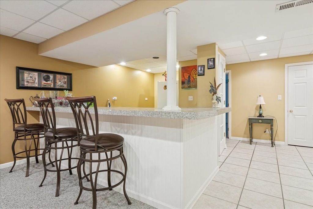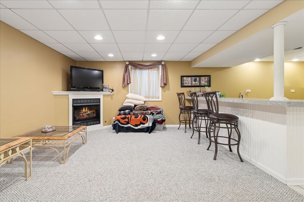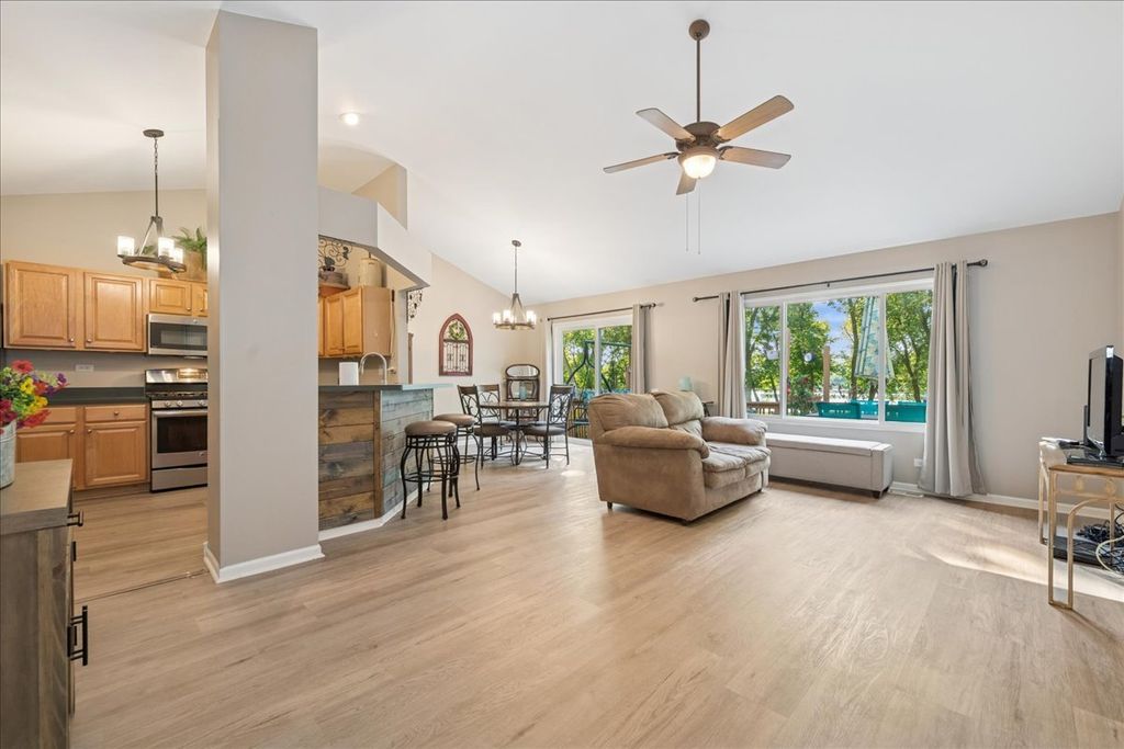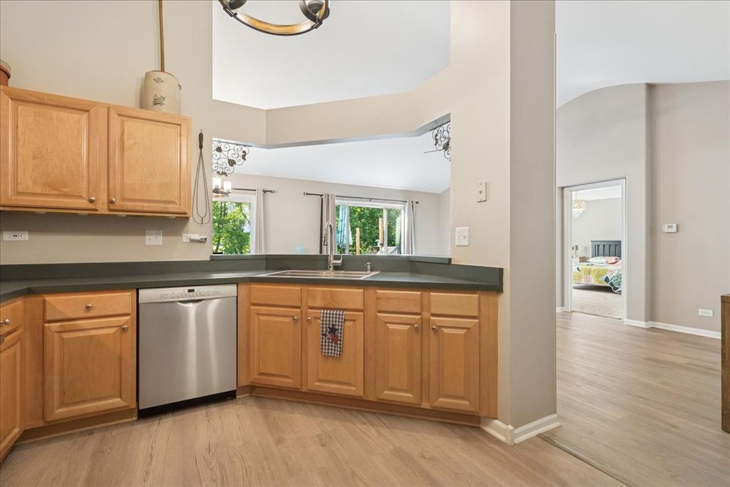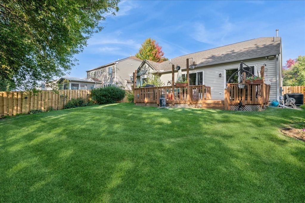 Welcome to this beautifully updated 4-bedroom, 2-bath ranch in the sought-after Meadowbrook subdivision, perfectly positioned on an interior lot backing to a serene lake and protected nature preserve. Offering the perfect blend of style, comfort, and convenience, this home is designed to impress both inside and out. Step inside to find a light-filled open floorplan featuring neutral tones, crisp white trim, and durable wood-look vinyl plank flooring. The vaulted ceiling enhances the spaciousness of the living, dining, and kitchen areas, making it ideal for everyday living and entertaining. The kitchen boasts maple cabinetry, stainless steel appliances, a pantry, and a breakfast bar accented with rustic barnwood. Updated lighting fixtures add a modern touch throughout. The primary suite offers a generous walk-in closet and a private bath with a walk-in shower. Two additional bedrooms and another fully updated bathroom complete the main level. A sliding barn door leads to the finished basement, where you'll find an expansive family room with a cozy fireplace, a stylish bar area, a 4th bedroom, laundry room, and abundant storage with built-in shelving. Enjoy outdoor living on the large deck overlooking the fenced backyard, lake, and nature preserve-an ideal setting for sunsets and relaxation. Recent updates: HVAC 2025; New Wood fence 2025; Windows & sliding glass door 2019; Roof 2019. Located just steps from Sunset Park, you'll have access to playgrounds, sports fields, tennis courts, and year-round community events. The home is also close to Huntley schools, Northwestern Huntley Hospital, and the Randall Road Corridor for shopping, dining, and everyday necessities. This is a rare opportunity to own a move-in ready ranch in a premier location-don't miss it!