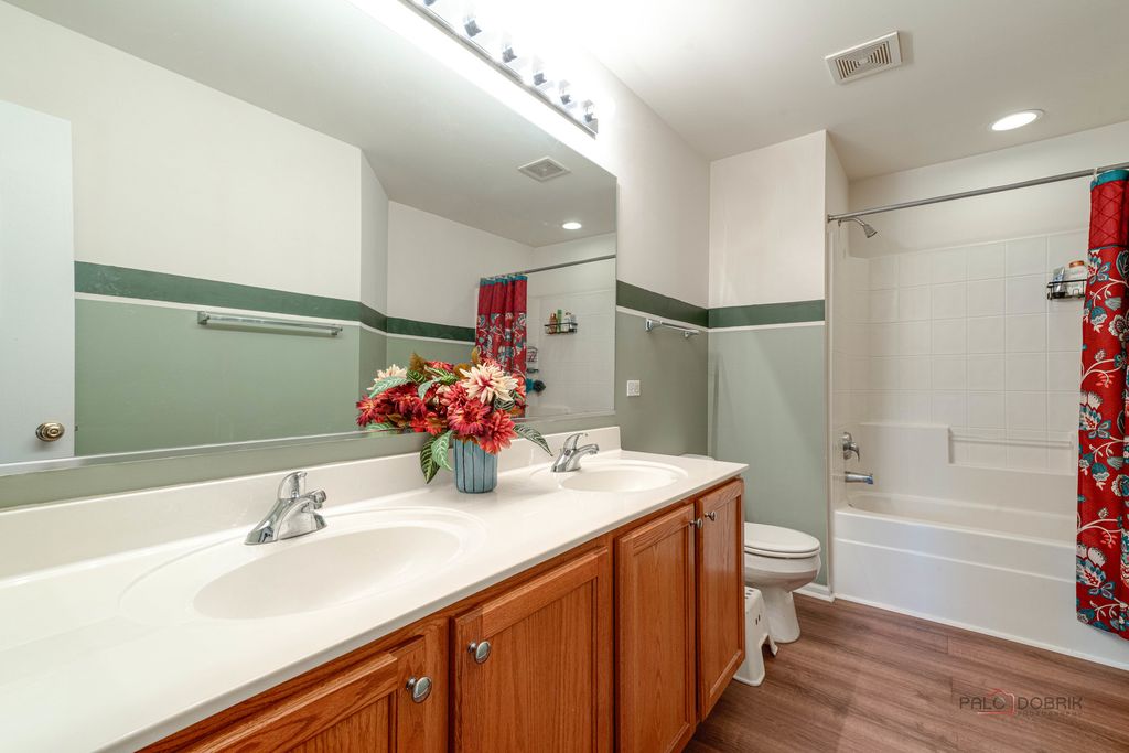 Welcome to Shadow Creek at Gregg's Landing! This two-story townhome with a full finished basement lives like a single-family home. The open floor plan and soaring two-story foyer fill the space with natural light. Enjoy brand-new hardwood floors on the main level and durable vinyl flooring on the second level and in the basement. The kitchen features tall cabinets, stainless steel appliances, and a dining area that opens to a private patio. The primary suite offers a spacious bath with dual vanities and a huge walk-in closet. Two additional bedrooms provide generous space and ample closets. Fresh, updated paint throughout. The basement was recently finished and offers 800 square feet of versatile living space. Located just minutes from parks, the golf course, Metra station, restaurants, shopping, fitness centers, entertainment and everything Vernon Hills has to offer! This home is served by highly rated District 73 North Elementary/Middle Schools and Vernon Hills High School. HOME WARRANTY is included through May of 2028!