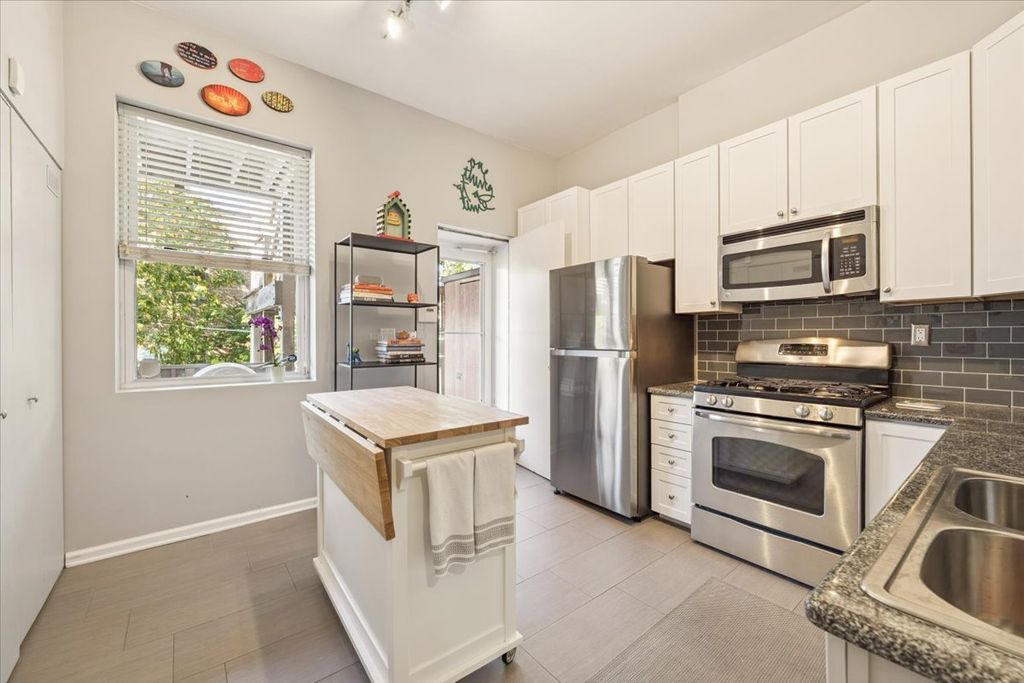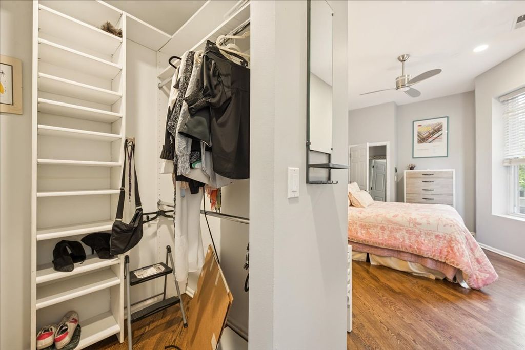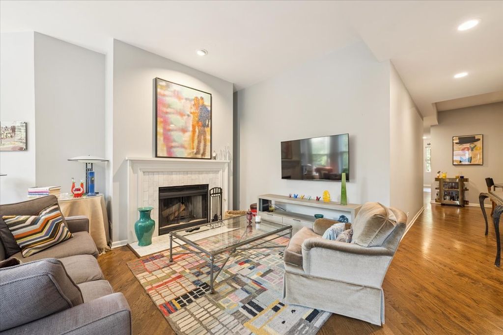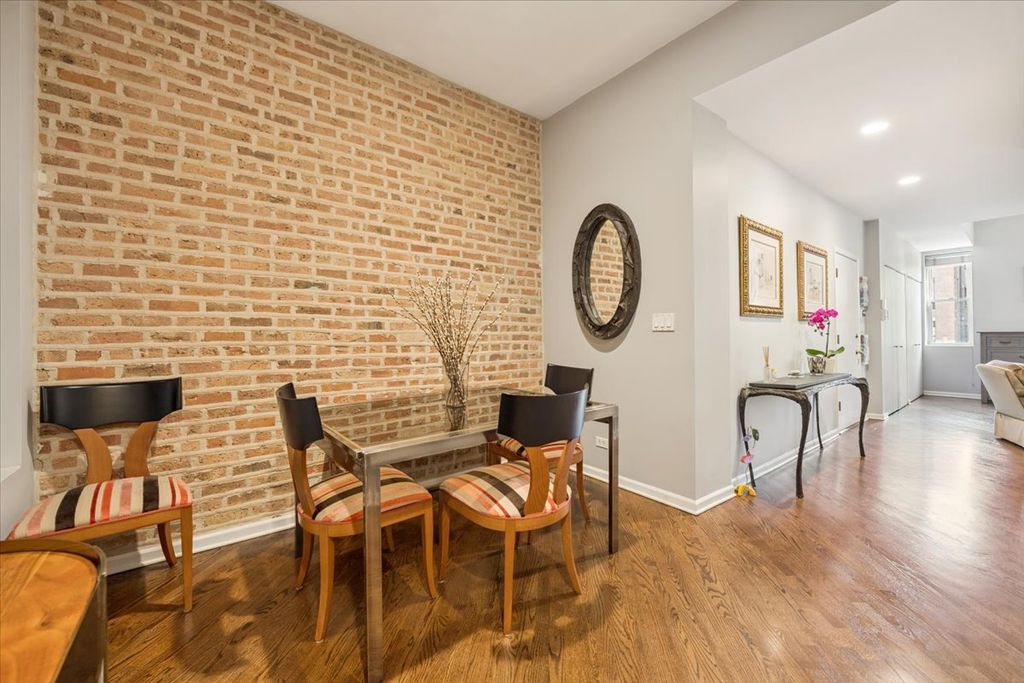 Set on the second floor of a classic three-story, six-unit greystone on a quiet one-way street, this 2 bed/2 bath home pairs historic character with smart functionality. The bright living room showcases high ceilings, oak floors, and a wood-burning fireplace; an octagonal turret alcove with windows flexes as a dining area, office nook, or reading spot, while a separate hallway cove near the kitchen/bedrooms offers a second option for dining or a desk. The kitchen features granite counters, stainless steel appliances, a glass tile backsplash, and ample cabinetry. Bedrooms are generously sized with custom storage, including a large walk-in closet in the primary. Two full baths include one with a walk-in shower and double vanity, and another with a tub/shower combo. A large private deck with leafy views extends the living space; in-unit laundry, storage off the deck, and a deeded parking space behind the building add everyday convenience. Close to Broadway, Halsted, and Belmont, and just one block from Belmont Harbor with easy access to the lakefront and Lakeshore Path.