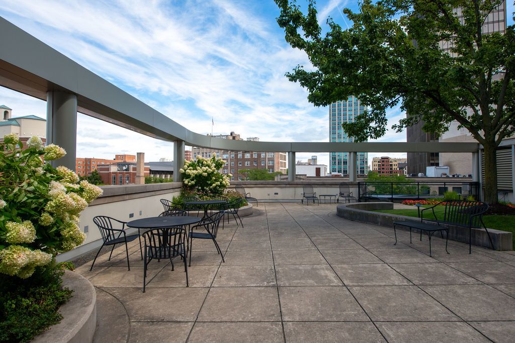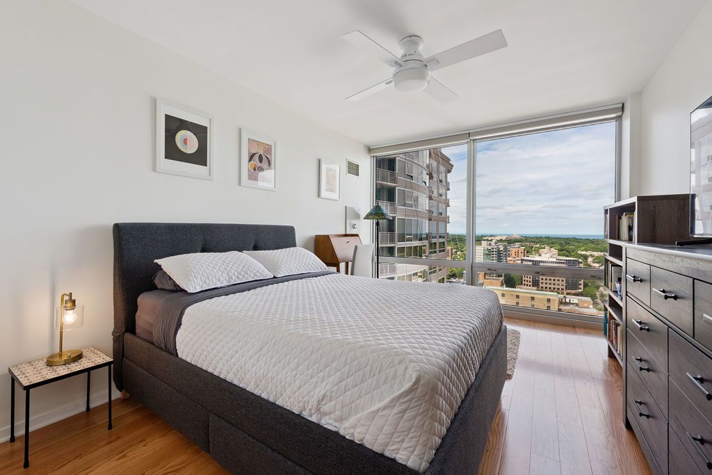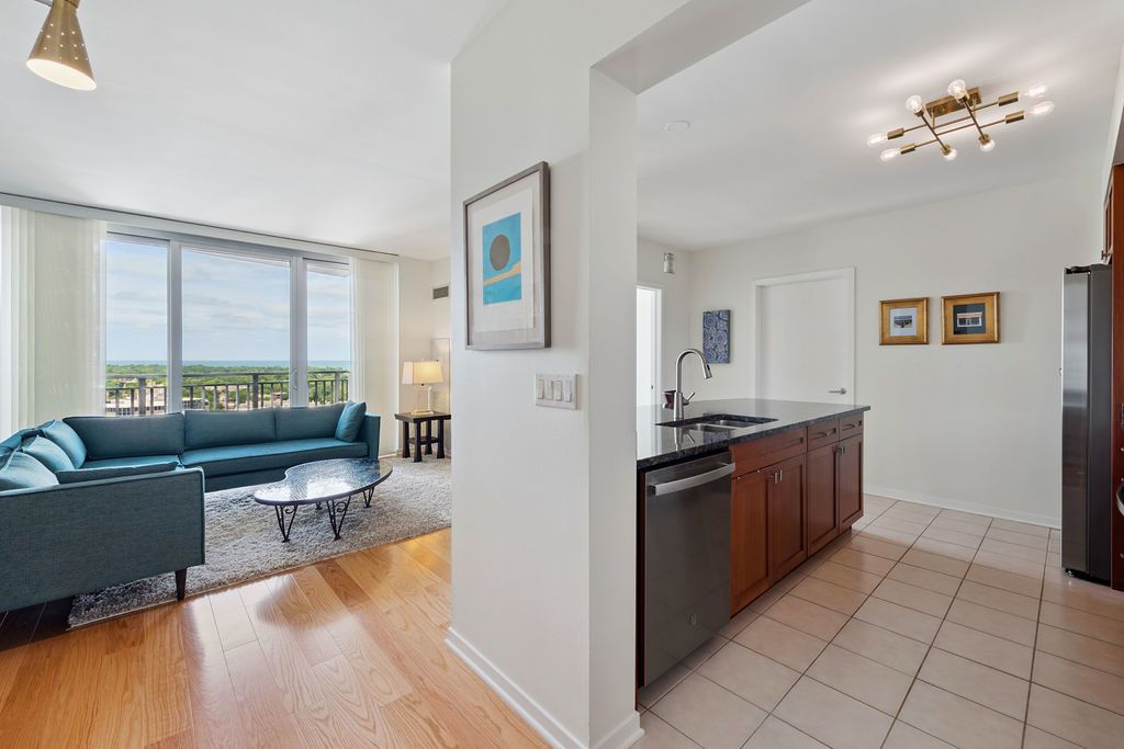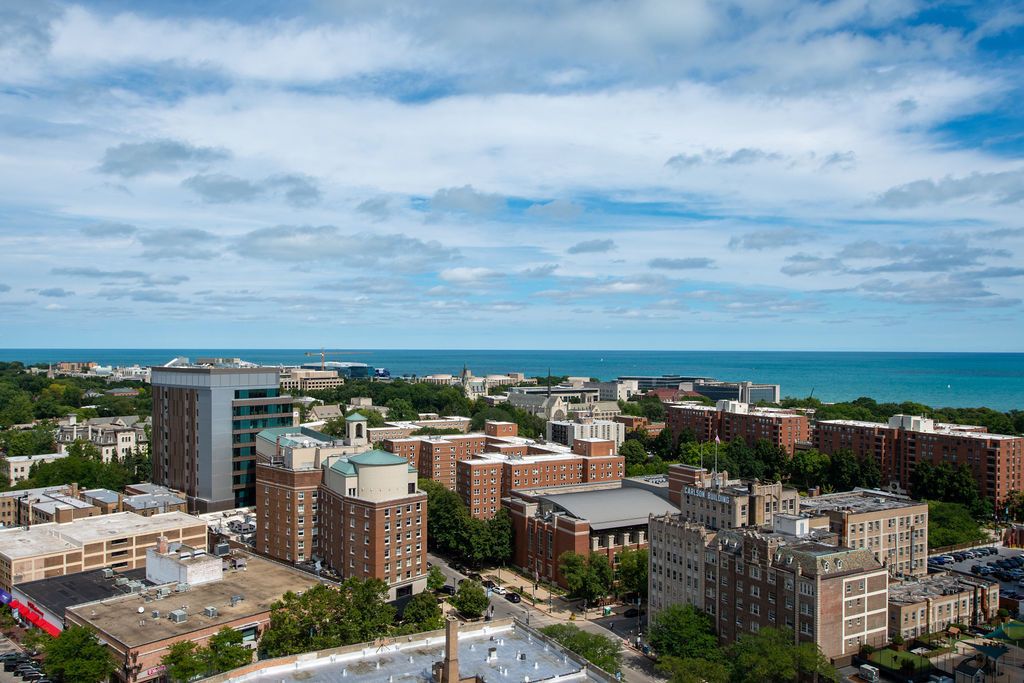 Welcome to 807 Davis Street unit 1907, where modern living meets stunning city and Lake views! This spacious corner high-rise unit in the coveted Sherman Plaza condos is located in the heart of downtown Evanston. It boasts a split floor plan with 2 spacious bedrooms and 2 large bathrooms. The primary suite has a large walk in closet as well as an en suite bathroom. The sleek, open kitchen features stainless steel appliances (everything except the refrigerator has been replaced within the last year), a breakfast bar with granite countertops, and an open concept living + dining area. There are new hardwood floors and updated lighting throughout the unit and many more updates. The second bedroom is light filled making it the ideal office + guest space. There's even an in unit laundry room with a new washer/dryer for ease of living. Enjoy the luxury of a private balcony and the convenience of a doorperson, gym, party room and guest suite. Additional building amenities include a bike room, adjacent to Lifetime Fitness and Target, as well as EV car charging capabilities and private storage options. Experience comfort with a pet-friendly atmosphere, service elevator, and attached garage parking included in the price. Whether entertaining or relaxing, this home offers the perfect blend of style and functionality. Don't miss the opportunity to make this exceptional residence your own!