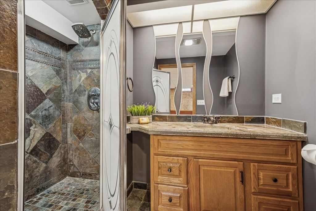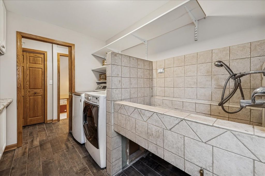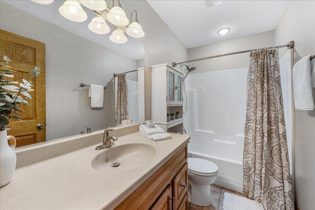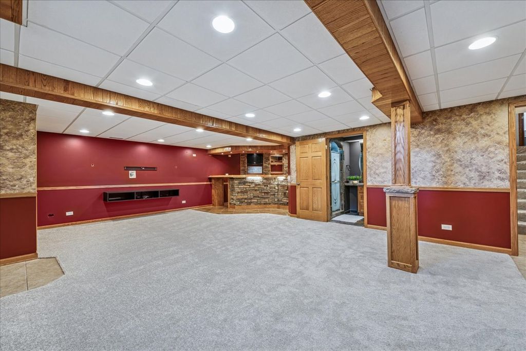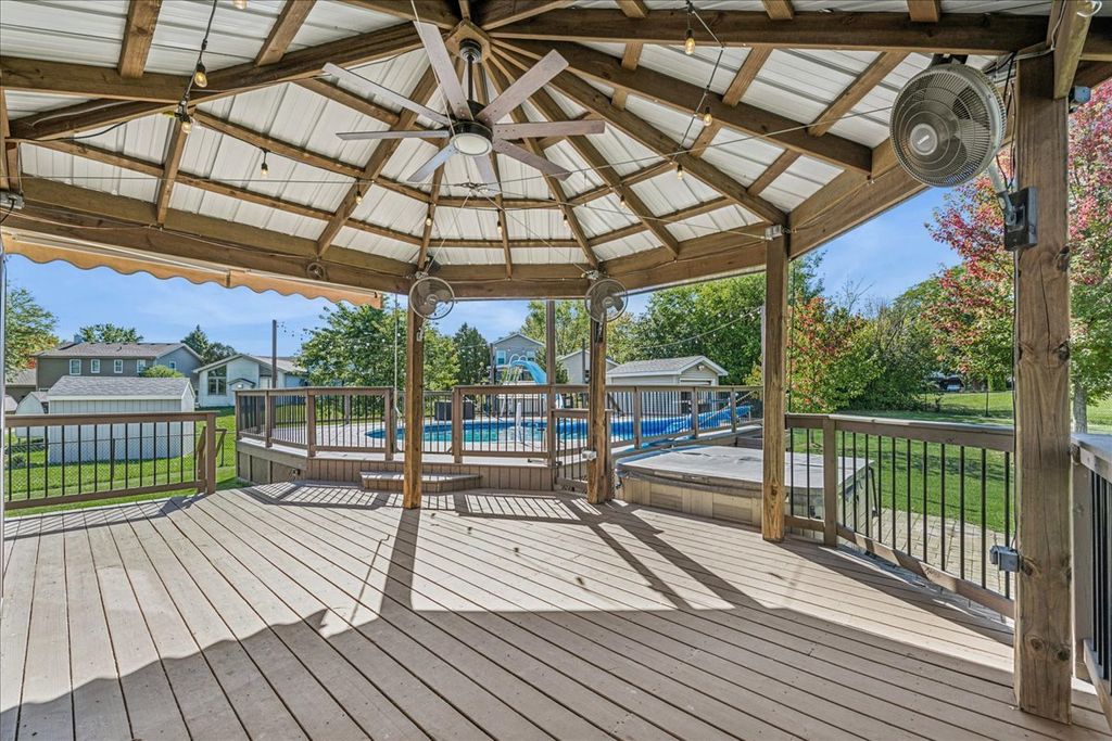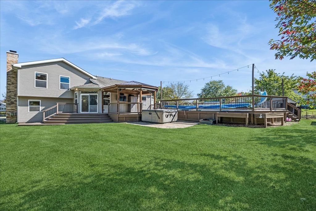 An Entertainer's Dream Home! Welcome to this beautifully updated 4-bedroom, 3.5-bath home perfectly situated on a private cul-de-sac. With four finished levels, this home offers versatile spaces for every lifestyle, from entertaining to working from home. The open-concept main level features vaulted ceilings, gleaming hardwood floors, and a stunning updated kitchen with quartz countertops, a breakfast-bar island, stainless steel appliances, and two pantries-a true chef's delight. The spacious primary suite offers a whirlpool tub, separate shower, and walk-in closet. Three additional bedrooms plus a home office provide plenty of space for family, guests, or remote work. The finished basement with exterior access is designed for entertaining, complete with a large family room, wet bar, and full bath-ideal for gatherings or easily adaptable as an in-law suite. A cozy wood-burning fireplace with gas starter is located in the family room on the lower level, providing a warm and inviting space for relaxing evenings or casual entertaining. The laundry room is a pet owner's dream-featuring a built-in dog bath station and a service door with a pet door leading directly to the fenced backyard, offering easy access and convenience for both you and your furry friends. Step outside to your private backyard oasis featuring a deck, gazebo with ceiling fans, roll-down sides, and awning, plus a heated pool for endless hours of fun and relaxation. The fenced yard also includes a storage shed and a pool garage with ample space for equipment and accessories. A dedicated gas line for grilling means you'll never run out of fuel. The heated 2-car garage offers a freshly epoxied floor, and the expanded driveway with side parking provides extra space for guests. Recent updates include fresh paint throughout, refinished hardwood floors, and new carpet-making this home completely move-in ready.