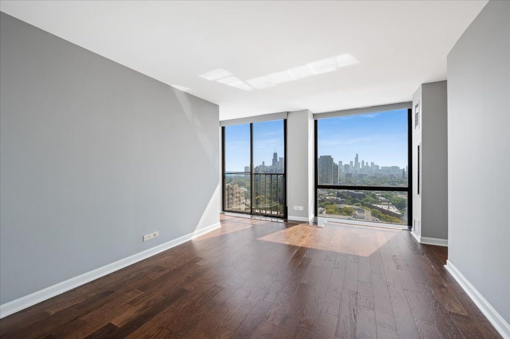Experience breathtaking panoramic south, east, and west views of the Chicago skyline and Lincoln Park from this beautifully updated 2-bedroom, 2-bath residence at 345 Fullerton. Designed for both comfort and style, the home features hardwood and quartz floors, a white kitchen with new stainless steel appliances, stone countertops and island seating, plus refreshed bathrooms with marble and quartz finishes and new vanities. The primary suite offers a spacious walk-in closet, while the second bedroom-set off the living room with French doors-provides flexibility for a guest room, office, or den. Enjoy the full-service building with 24-hour security, fitness center, outdoor terrace with grills, and rental parking available. Step outside your front door to enjoy convenient bus access, the Lincoln Park Zoo, lakefront trails, green space, and all that city living has to offer.