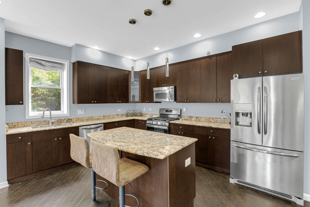 Located in the architectural heritage of historic Bronzeville. This expansive 4-bedroom, 4-bathroom duplex, first floor condo offers the space and comfort of a single-family home with elevated modern finishes throughout. The open-concept layout features a centrally positioned chef's kitchen with sleek cabinetry and modern appliances, seamlessly flowing into the spacious living room with a gas fireplace and elegant curved windows. Hardwood flooring extends throughout the home, complemented by abundant closet space and massive sized bedrooms. The residence boasts two luxurious primary suites-each with walk-in closets-while the owner's suite features a spa-inspired en-suite bath with a jetted soaking tub and dual vanity. The lower level includes a large family or recreation room with a second fireplace, ideal for gatherings, movie nights, or a personal retreat. Additional highlights include fresh paint throughout, a newly installed furnace (2024), hot water tank (2019), and a 1 car garage and plenty of street parking. All of this just one block from the newly constructed Northwestern Medicine facility and minutes from dining, transportation, and Lake Michigan. A rare opportunity to own a sophisticated and spacious home in one of Chicago's most vibrant and evolving neighborhoods.