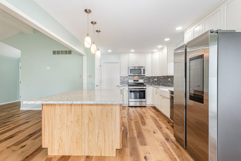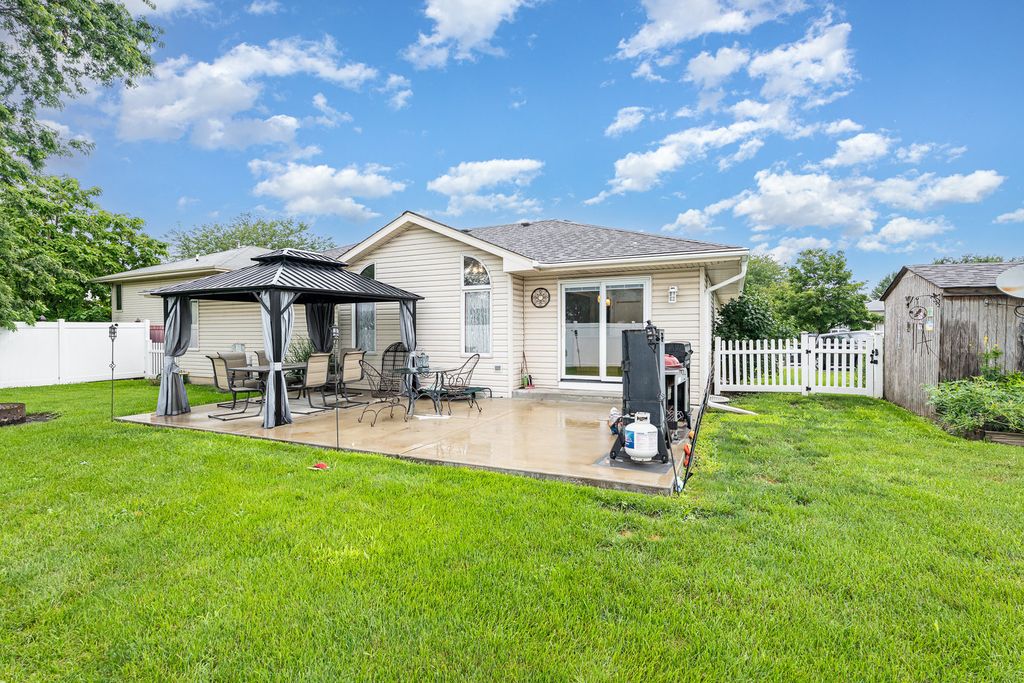 MOTIVATED SELLER WITH QUICK CLOSE OPTIONS. THIS HOME IS approximately 2528 SQFT with the full finished basement. Welcome Home! This beautifully maintained 4 bedroom, 3 bathroom home offers comfort, style, and space for every stage of life. Step inside to hardwood floors and an open concept design that connects the living room, dining area, and kitchen. The living room boasts soaring cathedral ceilings, filling the space with natural light. The kitchen features an oversized island and updated appliances, deal for both everyday living and special gatherings. As you continue through the main floor you'll find three spacious bedrooms that offer flexibility for family, guests, or a home office. Outside enjoy outdoor living in the fully fenced backyard, complete with a large concrete patio and a charming gazebo-perfect for relaxing. The fully finished basement provides additional living space with a wet bar, a full bathroom, with an extra bedroom and room for storage. Home also comes with leaf guard gutters!
