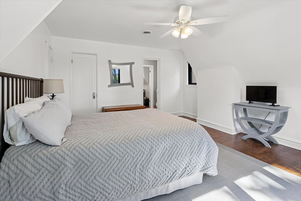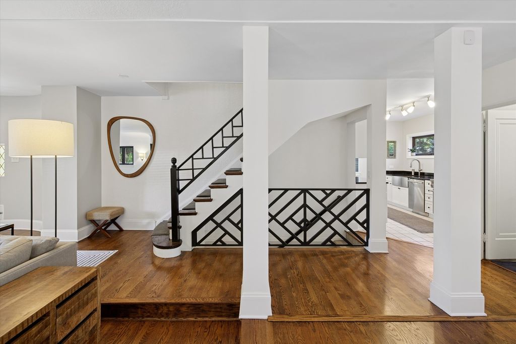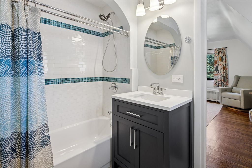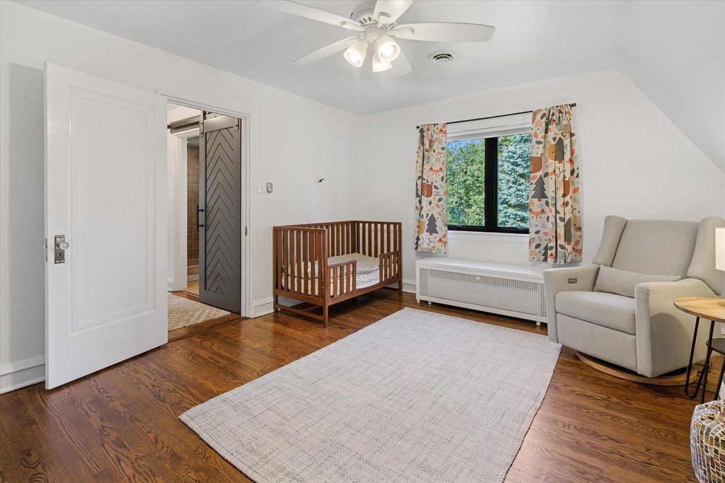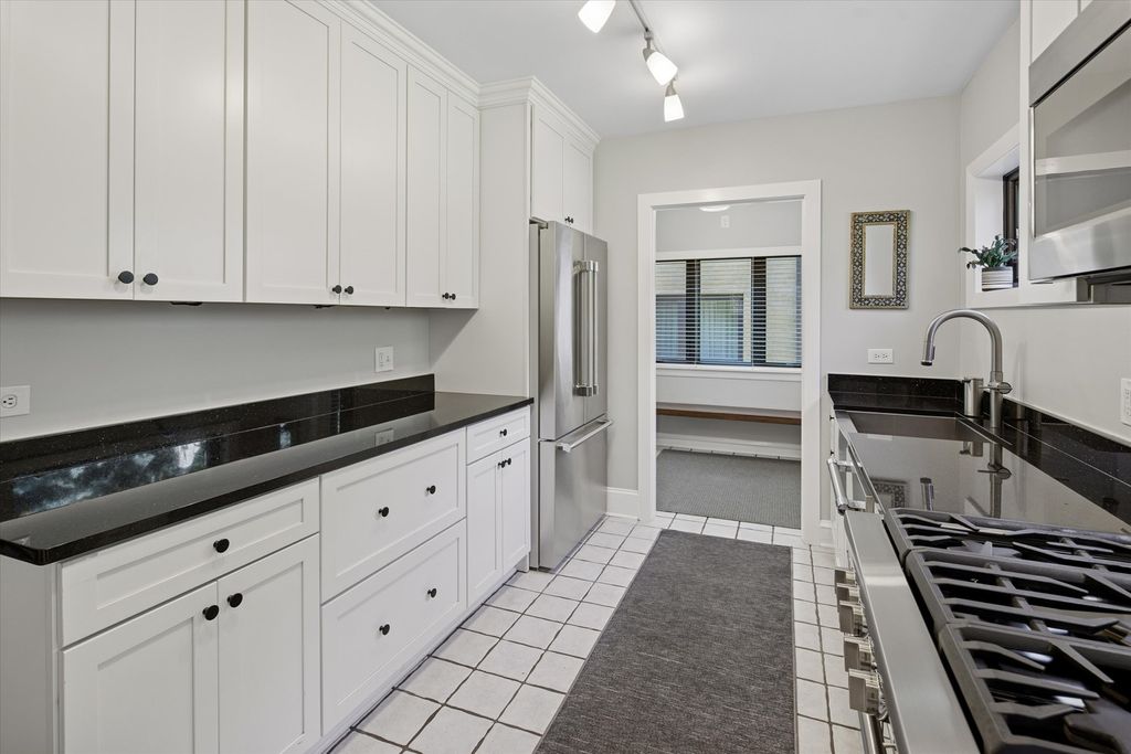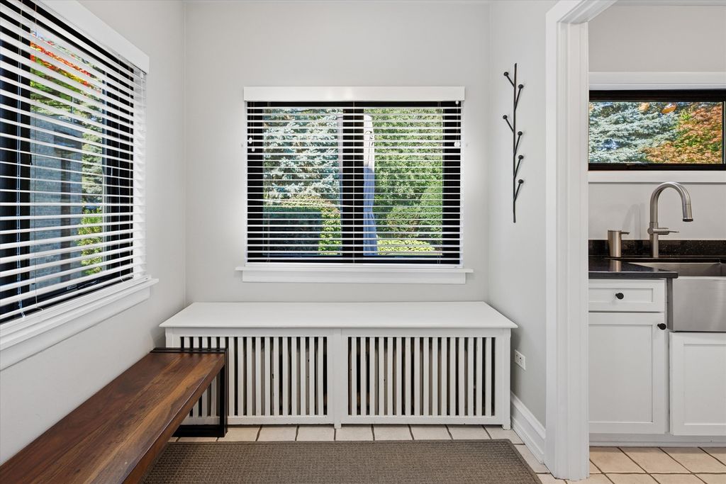 An architectural gem with timeless elegance and lush garden serenity. This captivating Tudor home offers the rare blend of classic design and modern upgrades, beginning with its iconic turret entry, peaked rooflines, and arched doorway that hint at the charm within. Step inside to a sunken living room with rich hardwood floors, curved archways, and a stunning fireplace that anchors the space with sophistication. The formal dining room overlooks a beautifully landscaped backyard, offering a seamless connection between indoor comfort and outdoor beauty. The kitchen is a true standout, featuring premium Thermador appliances, an oversized farmhouse sink, and a large picture window that frames your own private garden oasis. Upstairs, three spacious bedrooms and two full bathrooms offer peaceful treetop views and architectural character, with sloped ceilings and cozy nooks that elevate everyday living. The lower level extends the home's versatility with a finished basement ideal for a gym, office, or additional living room space. Outside, the backyard is a hidden retreat-lined with evergreens, thoughtfully planted garden beds, and a paver patio large enough for a full outdoor lounge and grill station. It's the perfect setting for slow mornings, weekend gatherings, and quiet evenings under the stars. Located on a serene street with access to commuter trains and a short drive to downtown Chicago, this home balances privacy, connection, and beauty in equal measure. Refined yet approachable, elegant yet livable-this home invites you to experience charm, character, and quiet grandeur in every moment.