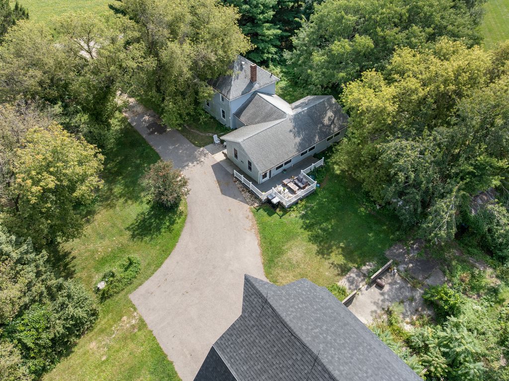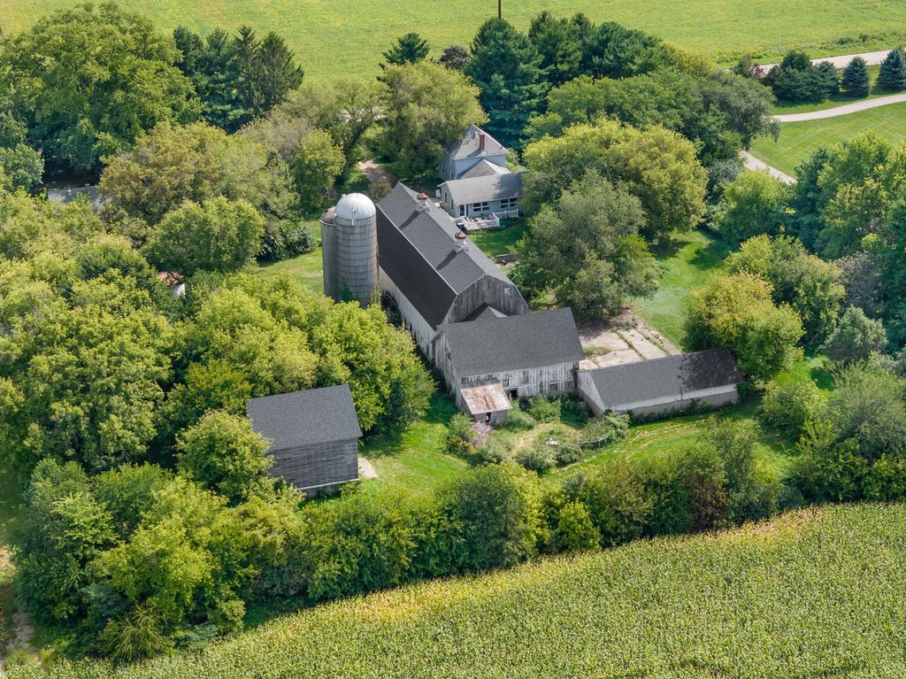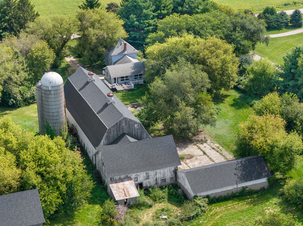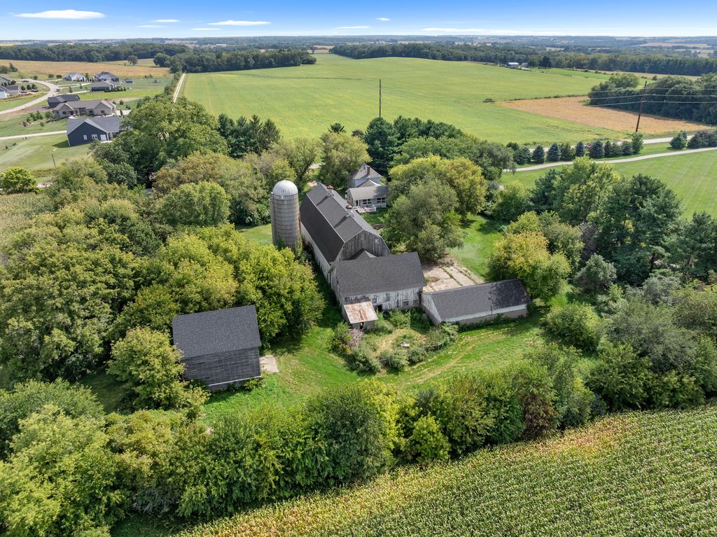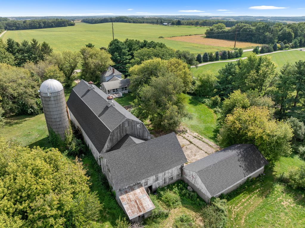 Fabulous opportunity to live in or develop. Farmhouse, guest house, barn and outbuildings on 25+ acres. Farmhouse boasts wood floors, exposed brick, wood beams with an updated kitchen and bathroom, large addition includes family room w/gas fireplace and primary suite with bedroom, bathroom, laundry, and den accessible by stairs or ramp. Guest house (900 sq. ft.) with family room, sitting room, 2 bedrooms, kitchen and bath. 4 car bays behind the large 2-story barn (new roof 2023). Additional buildings: grainery, silos, sheds. Central vacuum in original house, sump pump only in crawl space. Full basement (under original house) has wood fireplace. Crawl space under addition. Known radon of 5.3, will not be mitigated. Both houses and buildings are AS-IS, no repairs. Farm land lease expires 11/01/25.