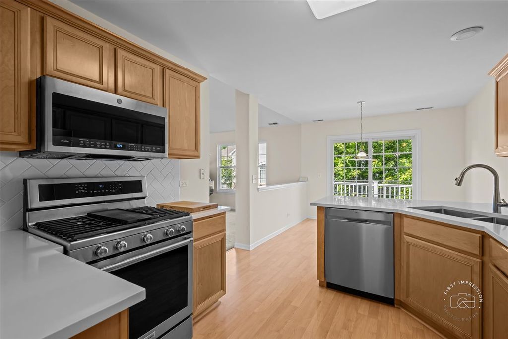 Welcome to 146 Bay Drive in Itasca. This charming home features two bedrooms and two bathrooms, along with vaulted ceilings and abundant natural light from numerous windows. The property also boasts a wonderful rear deck that offers tranquil views of the pond. The kitchen has been recently updated with a tile backsplash, custom countertops, newer appliances, and maple cabinetry, providing ample storage. For your convenience, the laundry room is located in the hallway off the kitchen and includes a washer, dryer, utility sink, and overhead cabinets. The primary bedroom features vaulted ceilings, a large walk-in closet, and an en-suite bathroom with both a shower and a soaker tub. The second bedroom is spacious, offers plenty of natural lighting, and has generous closet space. The basement level provides a roughed-in and plumbed area for a future bathroom, 200-amp service, drywalled ceilings, and large escape windows. Additionally, the home's central location ensures effortless travel with easy access to major roads, interstates, and all area amenities.
