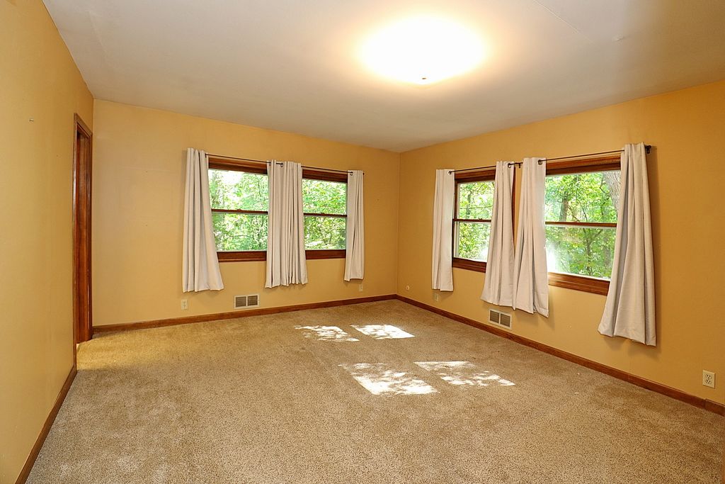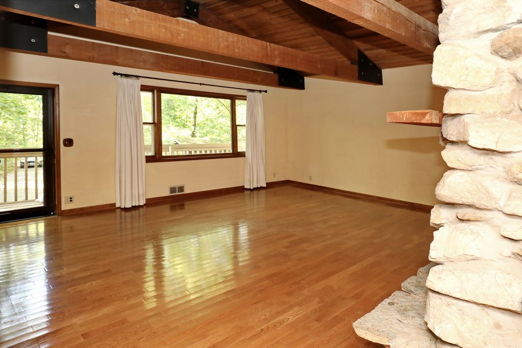 Private Woodland Ranch in the Desirable Oak Openings Subdivision. Are you seeking a serene retreat nestled in the heart of nature? This charming ranch home, set on 1.07 wooded acres, offers the perfect balance of privacy and comfort. A welcoming brick paver driveway leads you to this beautifully maintained residence, featuring a front balcony and a covered back deck where you can relax and enjoy the tranquil sights and sounds of the surrounding landscape. Step inside to a spacious living room showcasing hardwood floors, soaring cathedral ceilings with exposed wood beam trusses, and a timeless floor-to-ceiling stone fireplace; an ideal gathering place for family and friends on cozy winter evenings. The expansive kitchen features recessed lighting, ample cabinetry, and solid-surface countertops, with an open layout that flows seamlessly into the dining area. From here, step into the enclosed screened deck, perfect for year-round enjoyment. A convenient laundry room is located just off the kitchen with direct access to the backyard. The master bedroom boasts a private bath and offers scenic views of the surrounding wooded property. Two additional large bedrooms complete the main level. This ranch offers 1,900 square feet of living space on the main floor, plus a 1,316-square-foot unfinished basement, providing a blank canvas ready for your finishing touches. A Kohler whole-house generator provides peace of mind during power outages. Lovingly cared for, this home is being offered AS IS by the family, presenting a rare opportunity to make it your own in the highly sought-after Oak Openings Subdivision.