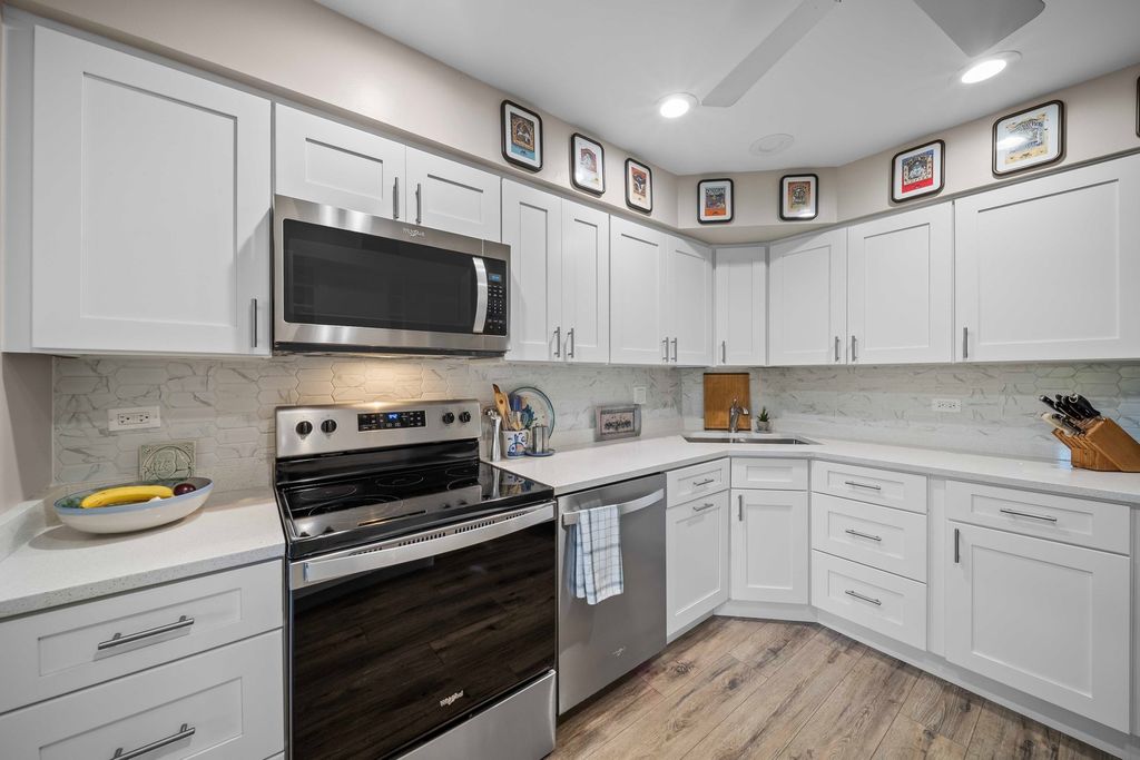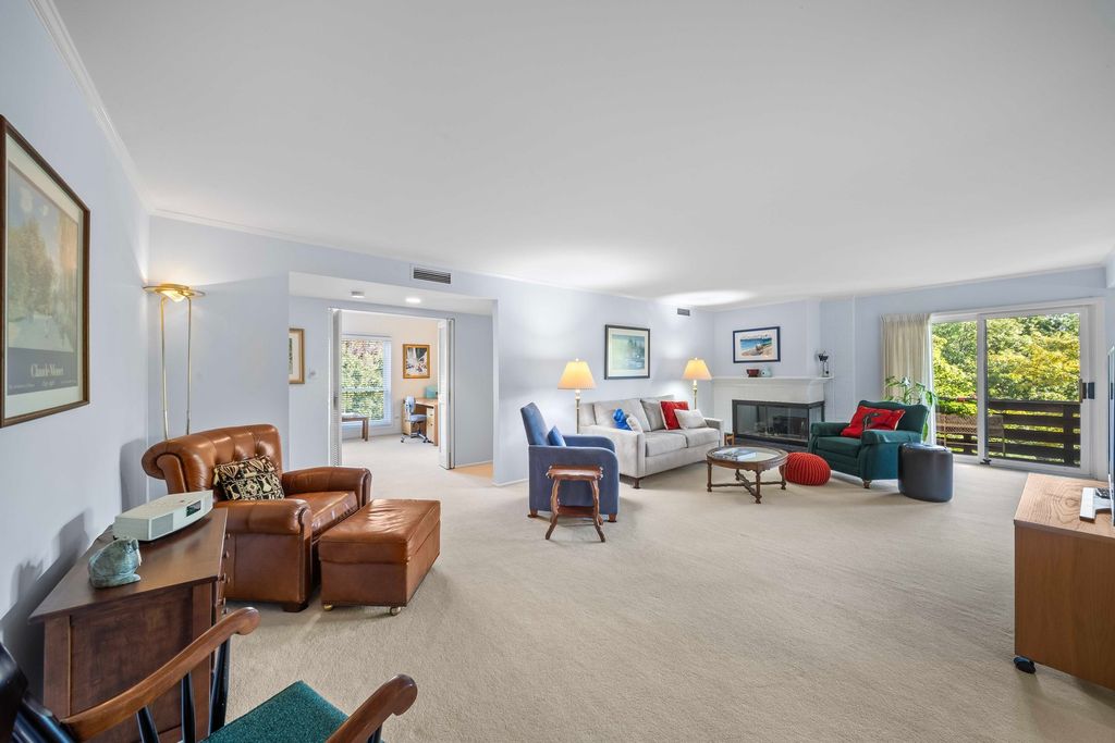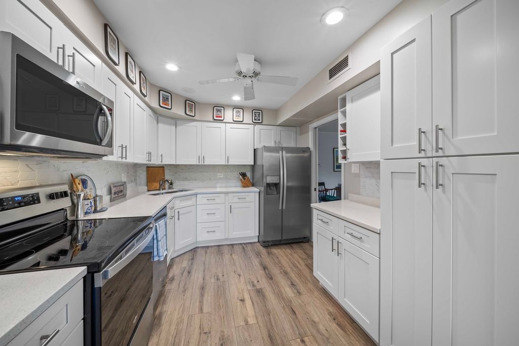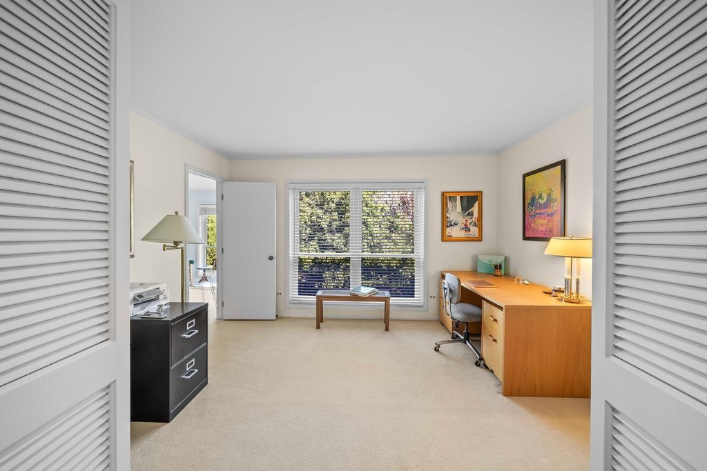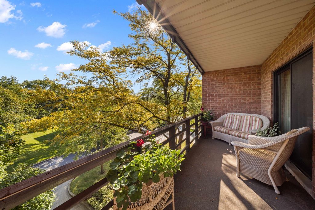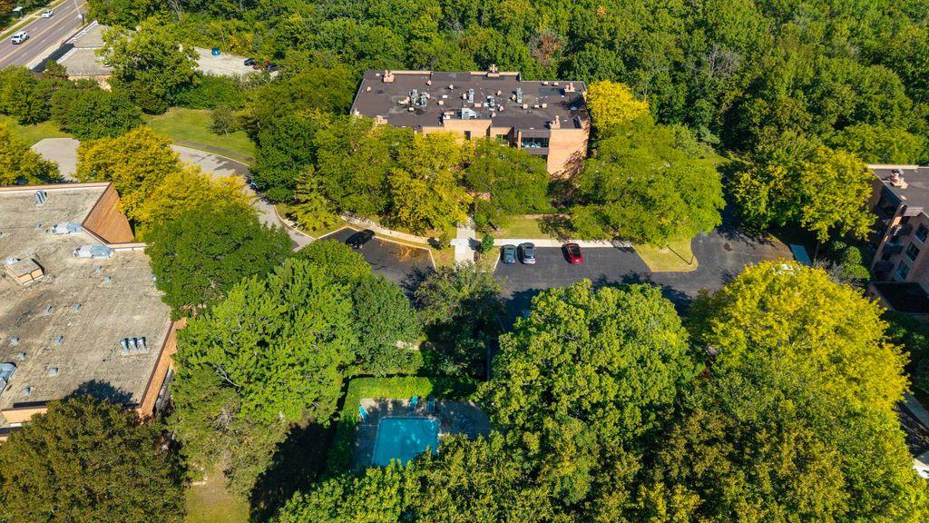 Welcome to Shermer Square, where timeless design meets modern updates in this spacious 2-bedroom + den, 2-bath residence. With over 1,800 square feet of living space, this home has been reimagined with thoughtful upgrades that elevate both function and style. A gracious foyer introduces the interiors, leading to expansive living and dining rooms anchored by a brick-surround fireplace and seamless access to the private balcony overlooking serene treetop views. The updated kitchen shines with quartz countertops, shaker cabinetry with pull-outs, sleek tile backsplash, and a full suite of Whirlpool stainless appliances-designed for both everyday ease and entertaining. The den/office, with custom built-ins, offers a versatile retreat for work or reading, while the private wing showcases a generous second bedroom and a refined hall bath. The primary suite is a true sanctuary with a custom Closets by Design walk-in, crown molding, and a beautifully remodeled bath featuring a walk-in shower with dual sprays and seating. Additional highlights include newer flooring, Corian vanities, newer HVAC, a fireplace refresh with remote and glass doors, in-unit laundry, and consistent design details carried throughout. Lifestyle amenities complete the package: heated garage parking plus ample visitor spaces, a dedicated storage locker, lushly landscaped grounds, and a sparkling outdoor pool. The association provides exterior maintenance, water, snow removal, and lawn care-ensuring a low-maintenance, turnkey experience. All this within moments of downtown Northbrook's best-walk to the Metra, Village Green, Sunset Foods, shops, dining, and the library. A rare opportunity to live in one of the North Shore's most convenient and well-maintained communities, ready for you to move right in!