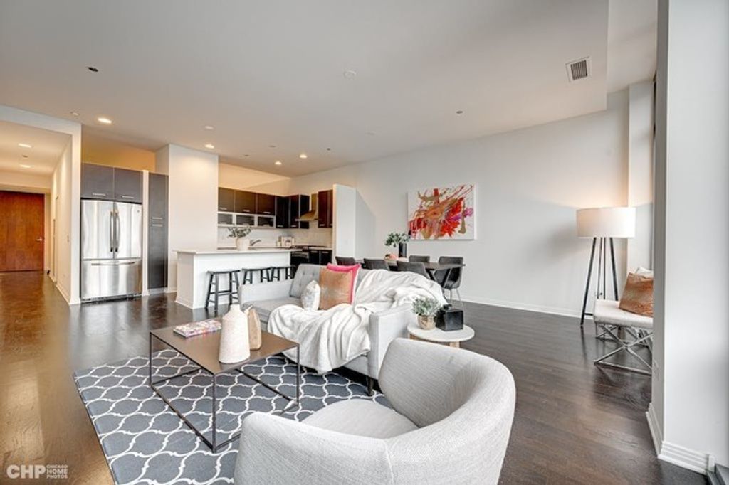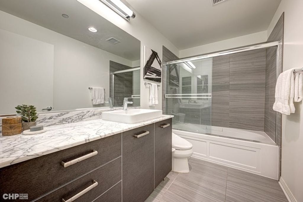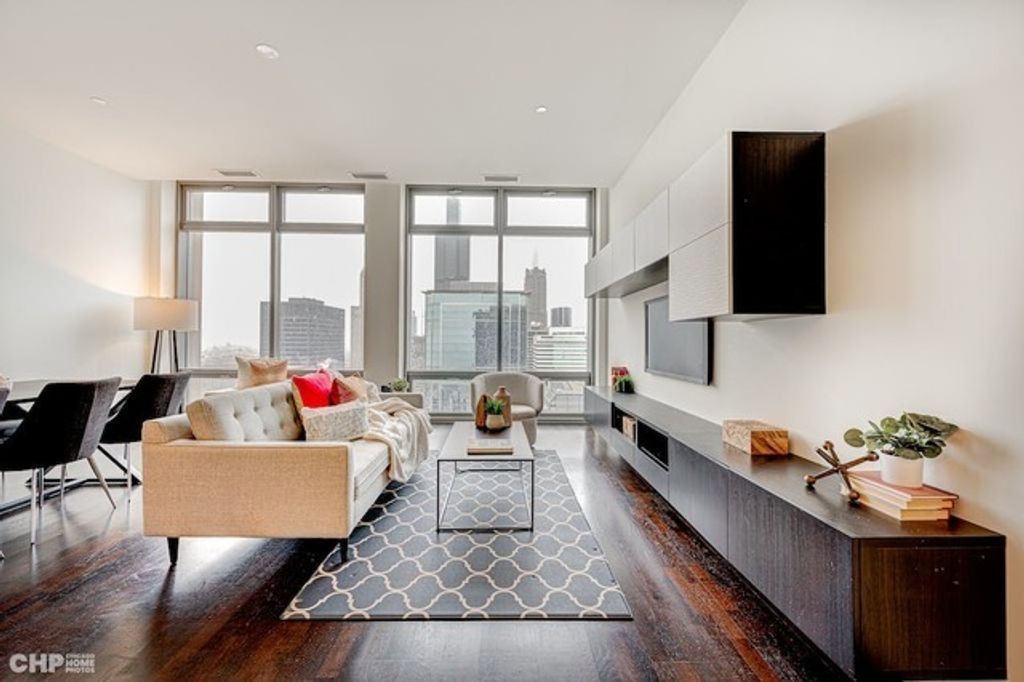 Luxury residence with spectacular expansive city views, 10ft ceilings with floor to ceiling windows, Expresso wood floors, recessed lighting, gallery entry, living room features custom built-in, contemporary kitchen with oversized island, stainless chimney hood, commercial grade appliances, quartz counter tops, and designer cabinets, bath features soaker tub and marble oversized vanity with raised sink, primary bedroom with two large closets, laundry in unit, rental parking available