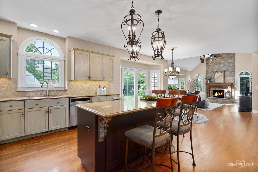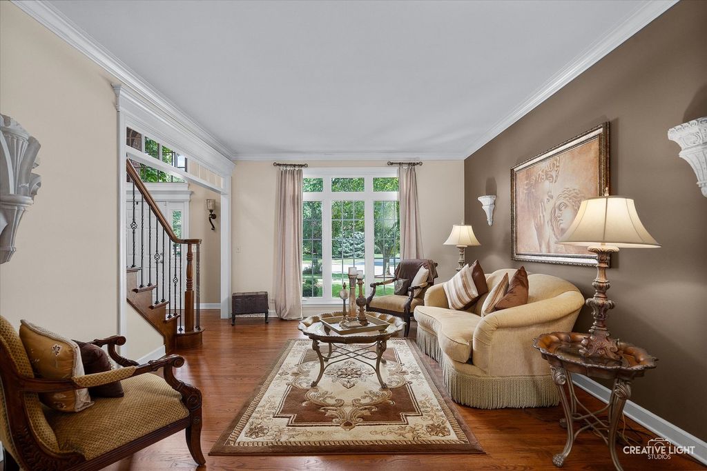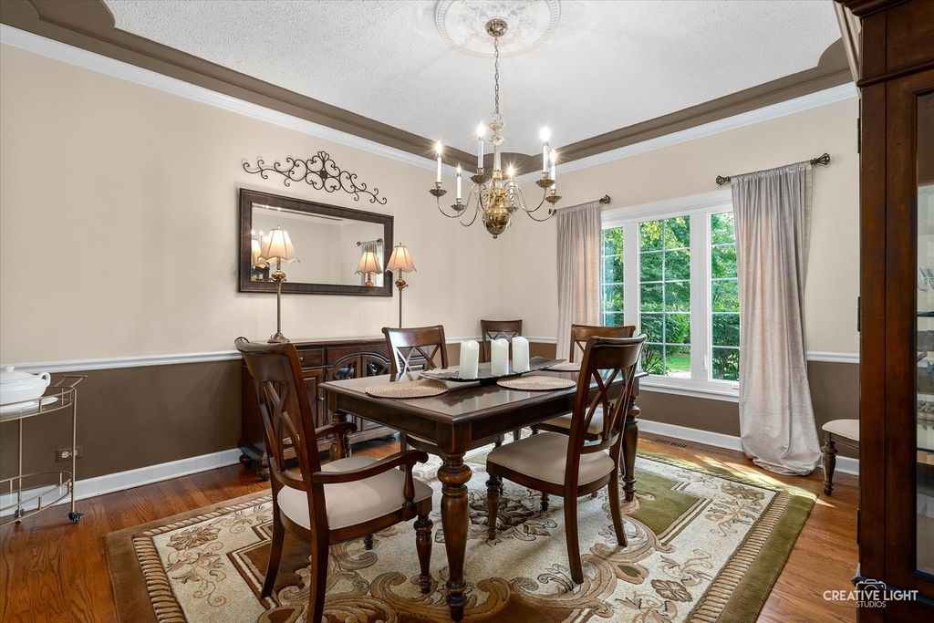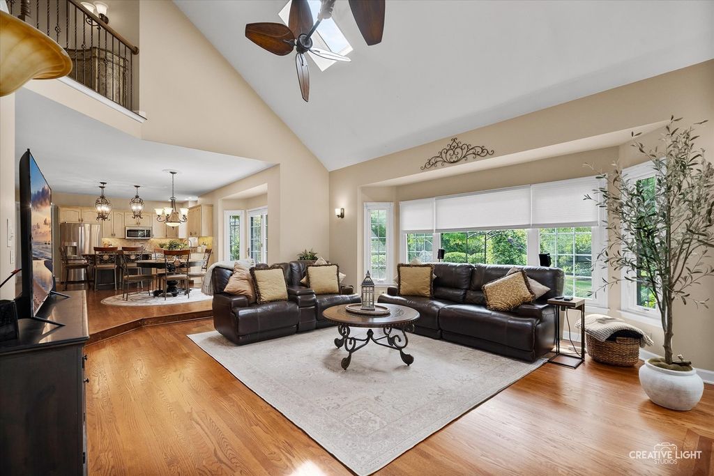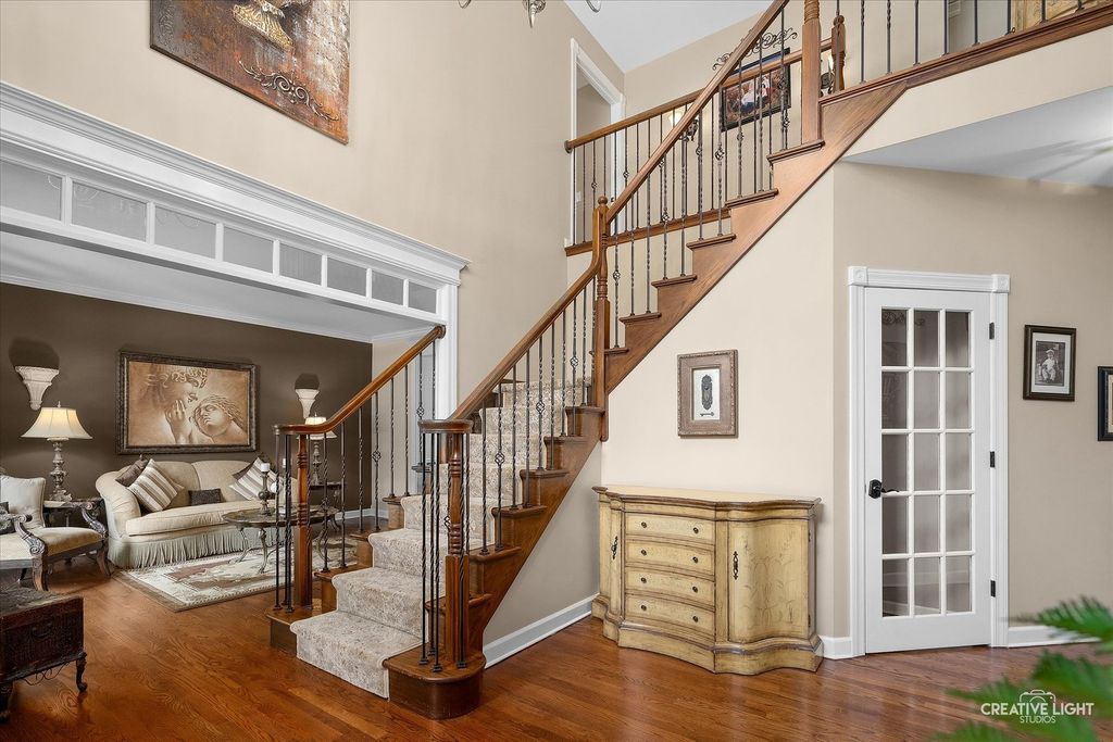 Prestigious River Run Half acre+ corner lot! This elegant 3700+ SF custom built home by Kings Court Builders blends refined luxury with thoughtful updates throughout. Featuring 4 bedrooms, 4.5 baths and a fully finished basement with newer carpeting, this home offers space, sophistication and timeless comfort. Step inside the grand two-story foyer to find stunning hardwood floors and a beautiful staircase with wrought iron spindles. The formal living and dining rooms offer custom white wood work with crown molding and tray ceiling. The 1st floor office has french doors, crown molding and built ins. The beautiful large kitchen with granite counter tops, SS appliances, large island, separate coffee bar and wet bar make this an entertainers dream. The Fanimotion paddle fan and 2 story brick gas log fireplace add to the grandeur of the family room. This central gathering place offers an impressive vaulted ceiling with 2 skylights, amazing views of the beautiful backyard and a rear staircase with wrought iron spindles that mirror the foyer staircase. The 1st floor also has an updated mud room with board & batten, coat closet, separate laundry and updated powder room that has space that can be converted to full bath by adding shower. Stunning cathedral master bedroom with adjacent cathedral master bath with skylight, double sink, soaking tub and walk-in closet with custom Closet Works organizers. Two of the Three additional bedrooms have cathedral ceilings, one w/adjacent full bath and large loft overlooking Fam Rm perfect for an in-law set up. The third 2nd floor bath has double sinks and a compartmentalized toilet and shower room. An additional 1,300+ sq ft of living space in the finished basement w/full bath, wet bar + mini fridge, theater area,rec/game room and unfinished room for storage. The 3 car garage has deep 3rd bay! Step into the serene beautifully landscaped back yard with new stamped concrete patio (2023). Dual zone A/C (new 2021 & 2022), sprinkling system, New Sump Pump Battery Backup (2019), New Roof (2020), New Gutters (2020), New Skylights (2020), New Pella Energy Efficient Maintenance Free Windows (2021), New Pella Patio Door (2021), Two New Furnaces (2022), Two New Hot Water Tanks (2023), New Stamped Concrete Front Walkway and Stoop (2023) Home comes with Equity Membership to River Run Club: includes heated indoor/outdoor pools, tennis and pickle ball courts, state of the art gym, sauna and steam room. Award winning IPSD 204.