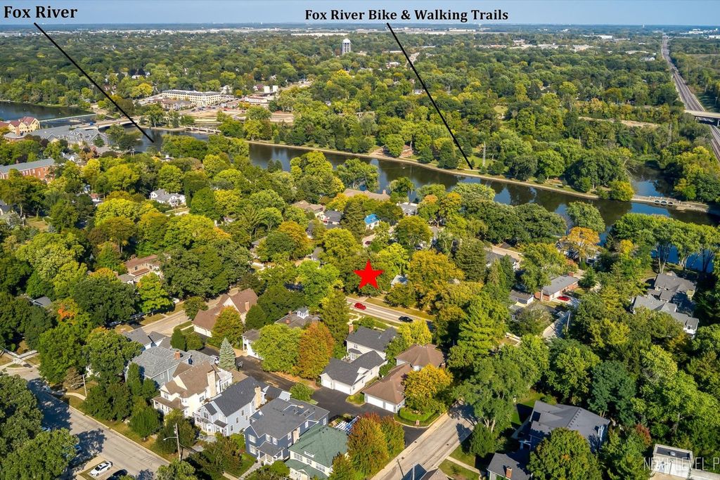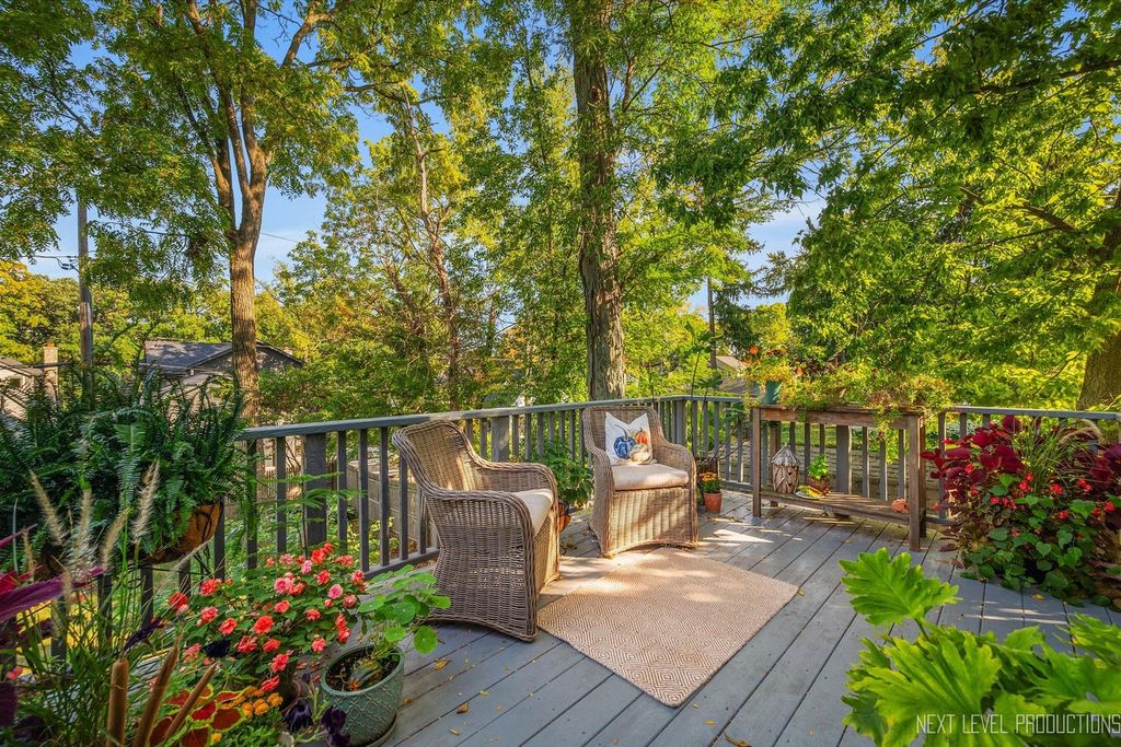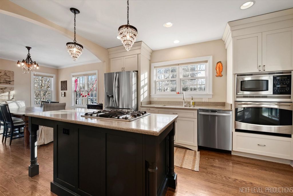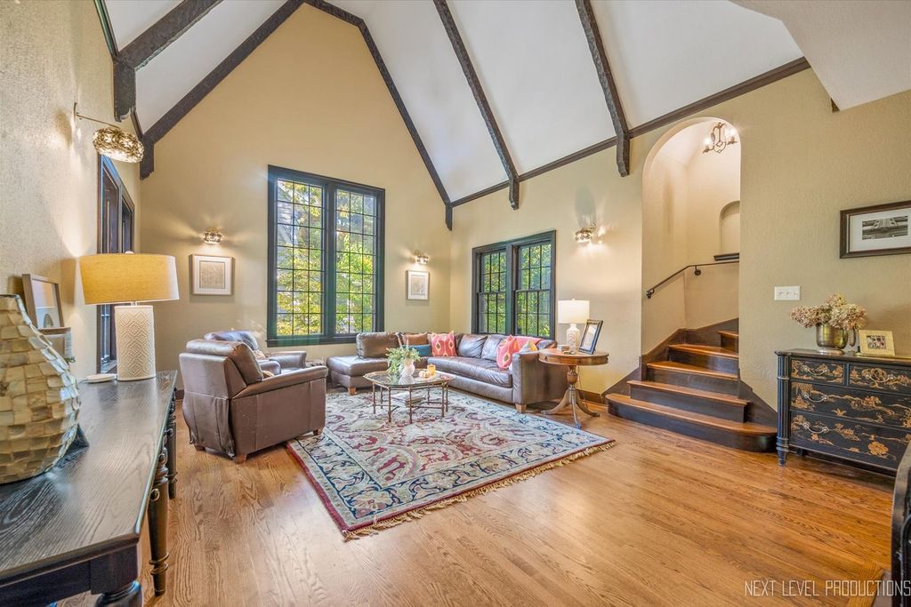 Step inside one of the most charming homes in downtown Geneva! This Tudor Revival style beauty is ideally located just one block from the Fox River and two blocks from historic Third Street with its boutique shopping and dining - this home truly has it all! A stunning brick and stone exterior and inviting side courtyard set the tone! An original arched entry door opens to a welcoming foyer with custom tile flooring and another arched doorway that leads into the dramatic two-story great room. Stunning hardwood floors flow throughout most of the main level! The breathtaking two-story great room features a beamed ceiling, striking stone fireplace, and Juliet balcony above. The formal dining room offers an arched entry, crown molding, and a corner built-in surrounded by windows. The chef's kitchen is beautifully appointed with 42" cabinetry (some with glass fronts) and crown molding, quartz countertops, stainless steel appliances, a large island with breakfast bar, and an eating area with arched entry and access to an elevated deck overlooking the picturesque, tree-lined yard. The spacious main floor primary suite features dual wall closets and a private bath with two vanities and an oversized glass-door shower, hardwood floors continue, and the Juliet balcony overlooks the great room below. Three additional bedrooms and two full baths complete the second level. The finished basement offers a media space and laundry room with utility sink. A rare 4-car garage provides incredible flexibility, and the fenced wooded lot includes a built-in fire pit and generous entertaining space. With its unbeatable location, nearby amenities, and acclaimed Geneva schools, this exceptional home is an obvious choice!