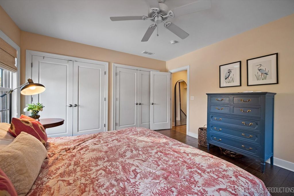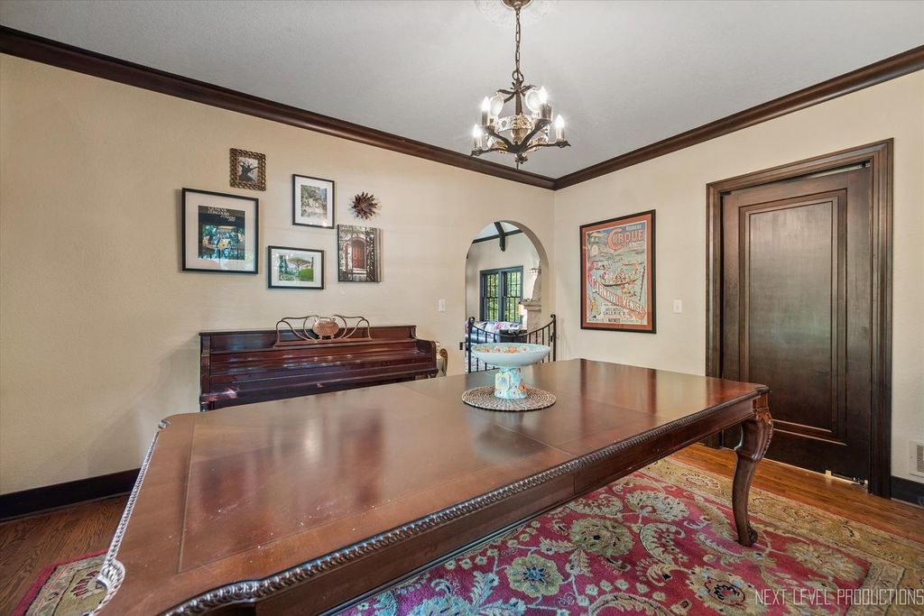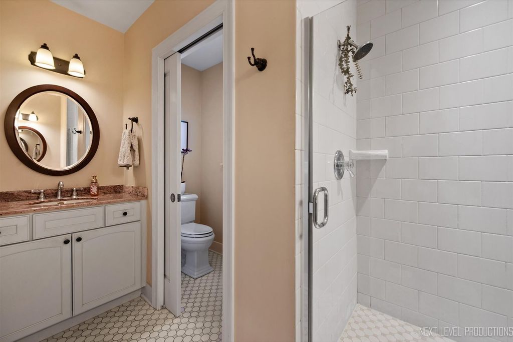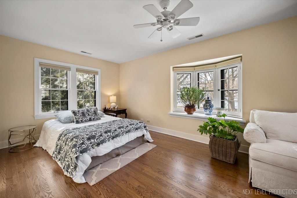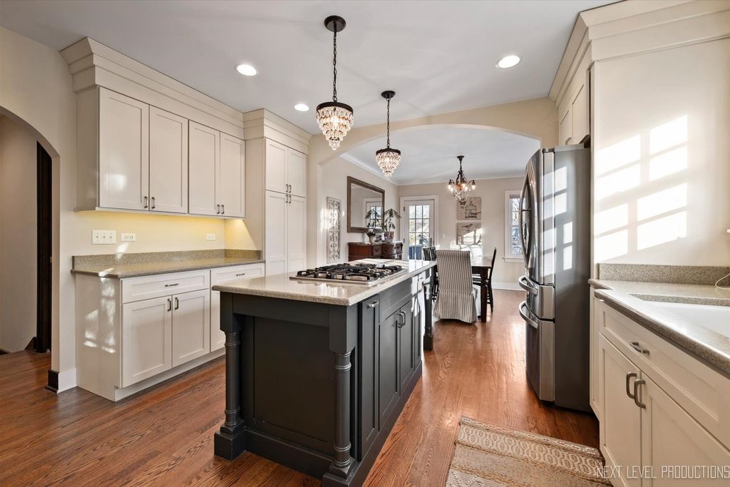 Step inside one of the most charming homes in downtown Geneva! This Tudor Revival style beauty is ideally located just one block from the Fox River and two blocks from historic Third Street with its boutique shopping and dining - this home truly has it all! A stunning brick and stone exterior and inviting side courtyard set the tone! An original arched entry door opens to a welcoming foyer with custom tile flooring and another arched doorway that leads into the dramatic two-story great room. Stunning hardwood floors flow throughout most of the main level! The breathtaking two-story great room features a beamed ceiling, striking stone fireplace, and Juliet balcony above. The formal dining room offers an arched entry, crown molding, and a corner built-in surrounded by windows. The chef's kitchen is beautifully appointed with 42" cabinetry (some with glass fronts) and crown molding, quartz countertops, stainless steel appliances, a large island with breakfast bar, and an eating area with arched entry and access to an elevated deck overlooking the picturesque, tree-lined yard. The spacious main floor primary suite features dual wall closets and a private bath with two vanities and an oversized glass-door shower, hardwood floors continue, and the Juliet balcony overlooks the great room below. Three additional bedrooms and two full baths complete the second level. The finished basement offers a media space and laundry room with utility sink. A rare 4-car garage provides incredible flexibility, and the fenced wooded lot includes a built-in fire pit and generous entertaining space. With its unbeatable location, nearby amenities, and acclaimed Geneva schools, this exceptional home is an obvious choice!