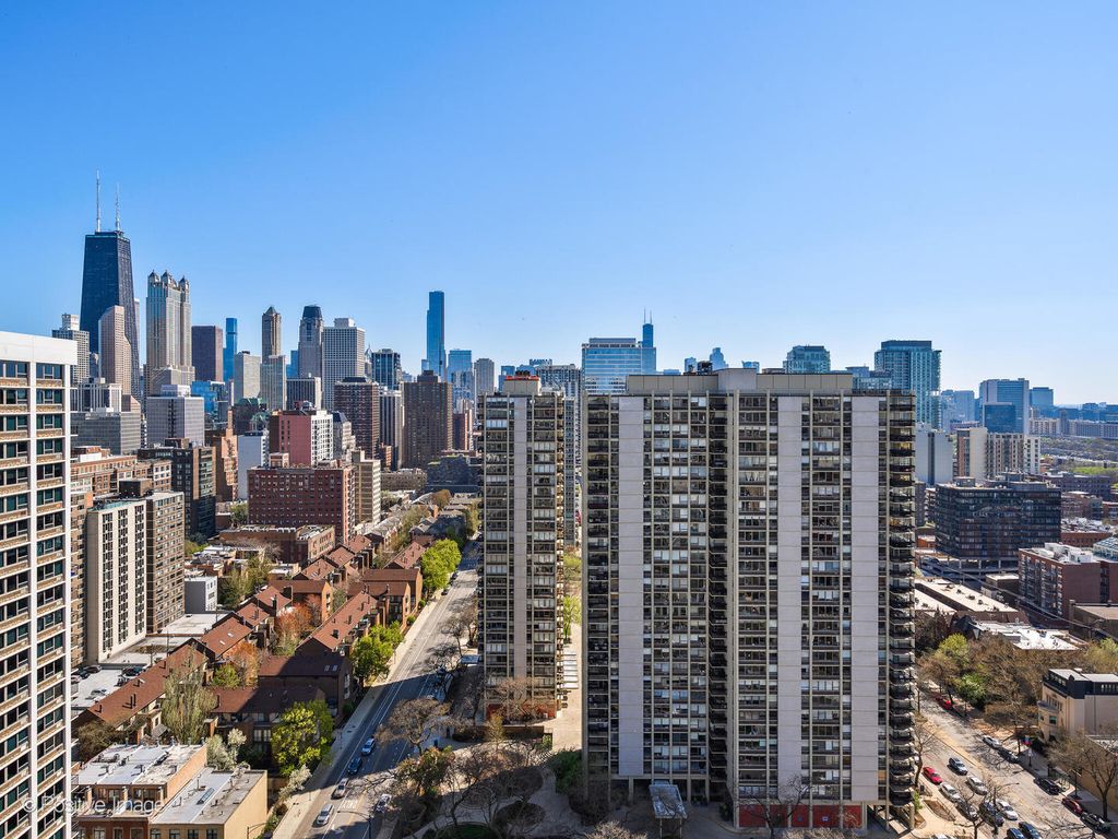 Presenting this stunning brand new penthouse unit in Bryant House with spectacular views- Be the first to live in this gut renovated two bedroom, one bathroom unit, ideally located between Old Town & Gold Coast. Wraparound windows facing South to the Chicago skyline and west with panoramic views over the city, provide abundant natural light for a bright and open space. The unit has been meticulously gut rehabbed and is very well appointed with top quality and tasteful finishes- The open kitchen has slim shaker cabinets, full tiled backsplash, under cabinet LED lighting, gold accent hardware & fixtures, quartz counters & peninsula with breakfast bar and designer lighting/pendants. High-end Kitchen Aid appliances including built-in panel dishwasher, french-door refrigerator, slide in range, microwave drawer. Bathroom is elegantly renovated with a walk-in shower, slim shaker vanity with quartz top, black accent fixtures & hardware, contemporary tiles. There is a large primary bedroom with walk-in organized closet, office desk area, new recessed lighting over the bed. The second bedroom shares the same stunning city views, with a built-in closet, it offers many options as a guest bedroom or a luxurious home office. . Throughout the unit there are wide plank light wood color floors, new recessed led lighting, abundant professionally organized closets, including a full wall of entry closets. All new electrical, plumbing and A/C units. Monthly assessment includes heat, Cable TV and internet service, everything except electricity. Bryant House is a well run building with good reserves, many recent major updates completed including new elevators and newly renovated hallways. Great amenities- Sandburg Village has 2 Olympic size outdoor heated swimming pools, tennis courts, landscaped courtyards. The building has 24hr doorman, Gym, rooftop deck, additional storage (provided with unit), bike room, parking garage (rental). Convenient for transportation - 1 block to train/subway, buses, Lake Shore Dr, bike path. Located close to Old Town, downtown, Lincoln Park. Enjoy all attractions of the neighborhood - restaurants, nightlife, shopping, grocery stores, Lakefront trail, beach, parks. Garage parking only $170 p/m. Pets allowed.