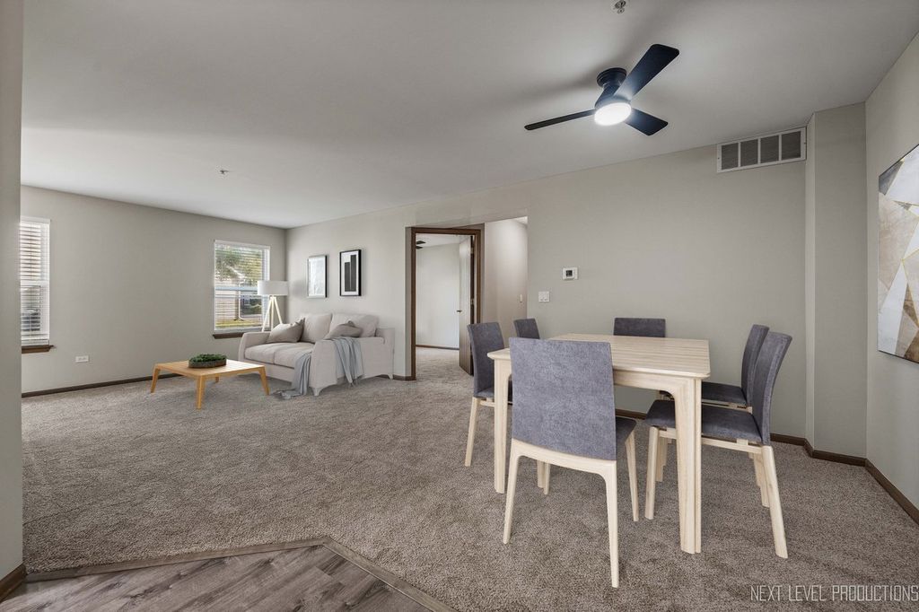 Welcome to Carillon of Plainfield! Fabulous main level ranch-style unit with two bedrooms and two full baths located in an ELEVATOR building with a spacious open layout! This building is conveniently situated near the clubhouse, pool and tennis club! This first floor location provides easy access to you one car interior garage private entrance with storage. Your primary suite has a large walk-in closet and private bath, with an additional full bath for guests and the second bedroom. Laundry has a full-sized washer and dryer. Your kitchen and foyer area enjoys newer luxury vinyl plank flooring, NEW carpet and FRESHLY PAINTED throughout. Carillon is a 55+ active adult GATED community with 24 hour security, new tennis and pickleball courts, updated clubhouse, two outdoor pools, one indoor pool, hot tubs, lovely walking path, (3) 9-hole golf courses with an on-site restaurant, Talk of the Town monthly newsletter, and so much more! Close to I 55, restaurants, shopping and all the area has to offer. Contact me today to schedule your private showing. Happy to Help!