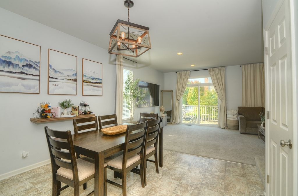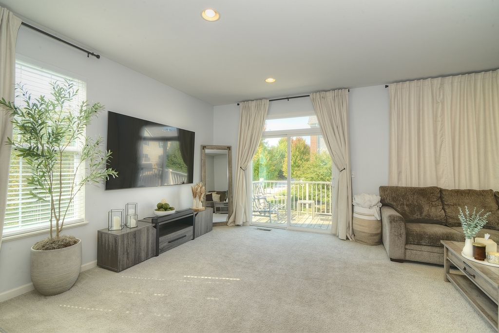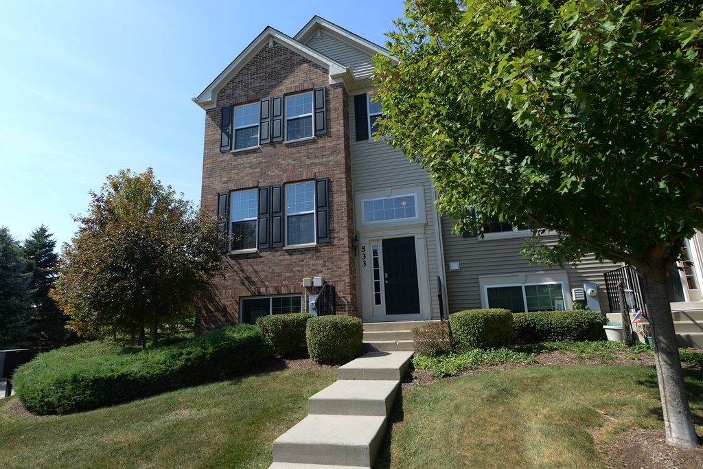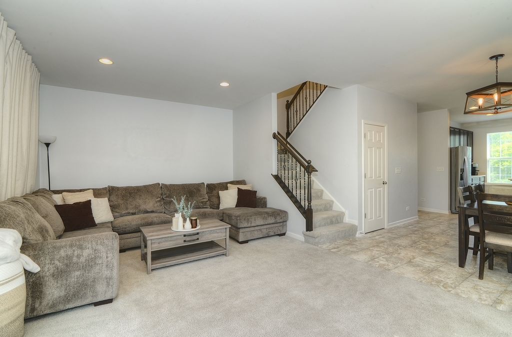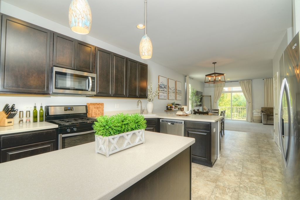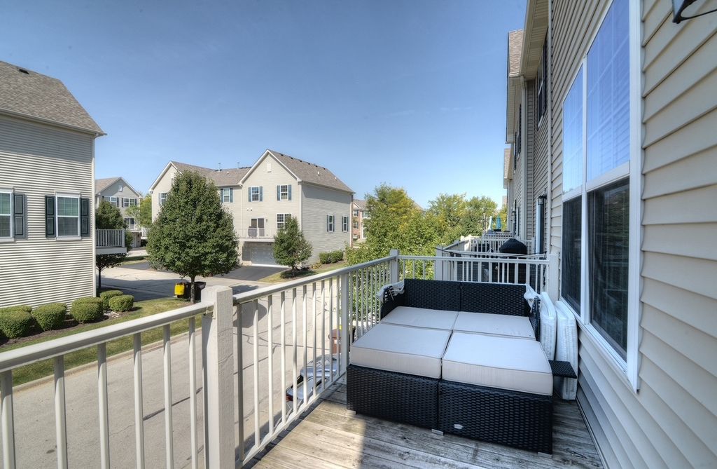 Stunning three level END Unit townhome with amazing open space views! Featuring over 1900 square feet of living space, this Home welcomes you in with a 2 story foyer, upgraded railings & Open concept design. Huge Kitchen with island, loads of upgraded cabinetry, pantry, tons counters space plus a breakfast bar, newer Stainless Steel Appliances, as well Large Dining and Living Room. The oversized deck offers beautiful view and tons of space! 2nd floor features a large Master suite with Huge walk in closet and upgraded Master bath with dual vanities, upgraded counters & cabinets, large separate shower and soaking tub! Two spacious additional secondary bedrooms, an upgraded full bath & second floor laundry room that offers convenience and space! Finished lower level flex room is the perfect space whether you are looking for a family room, office, play area, gym or fourth bedroom! End unit with loads of natural light and fantastic location in the community! Gilberts Town Center features large park with splash pad, playground, baseball fields, 2nd playground, paths & ponds, Loads of Open space which hosts annual fest, Summer Movie in the park and more! This home is move in ready!