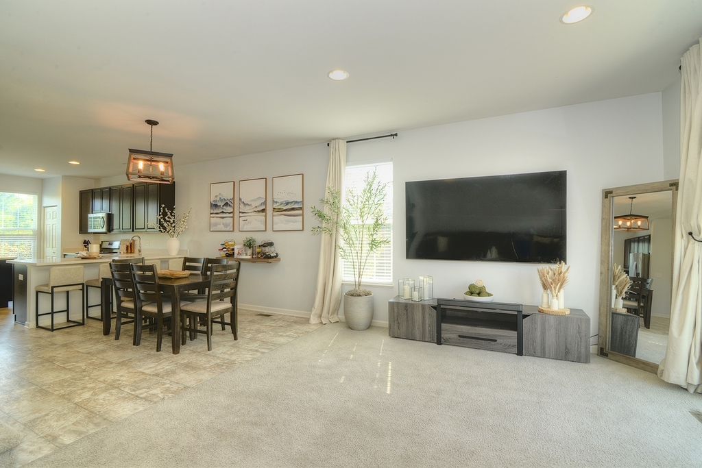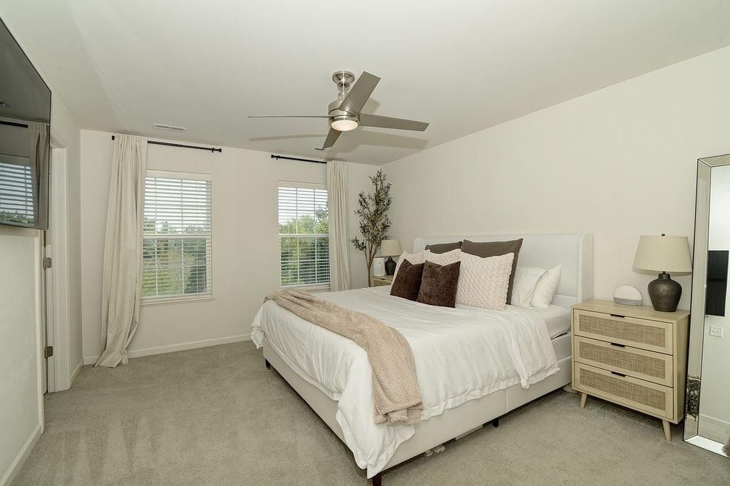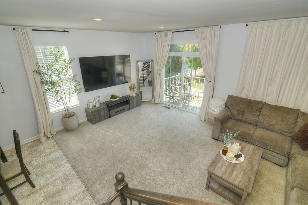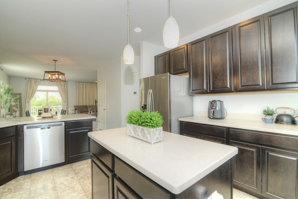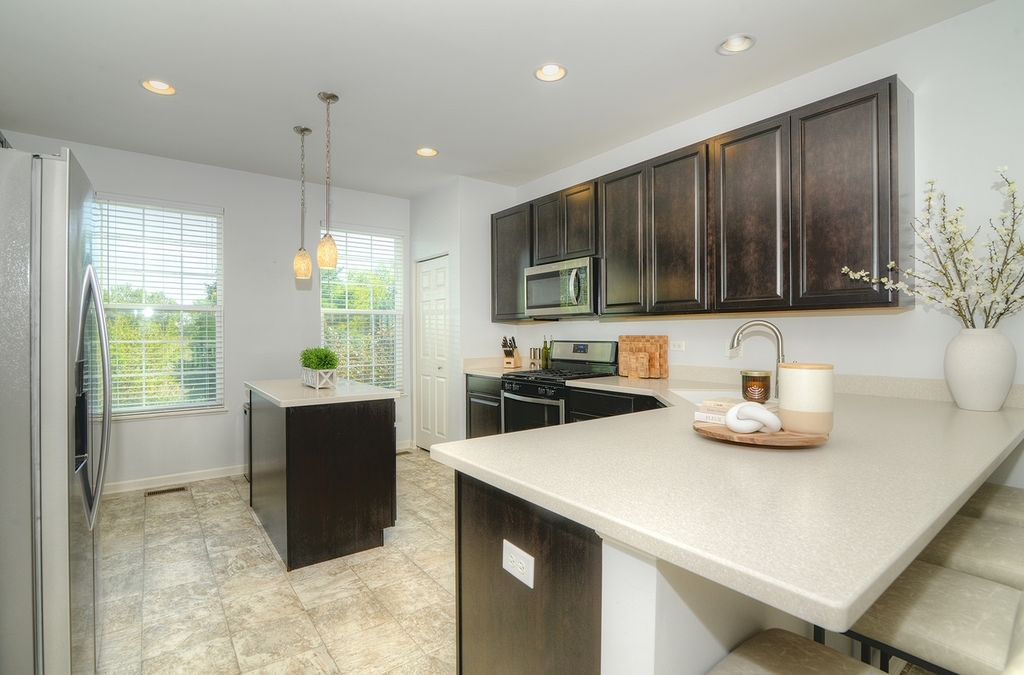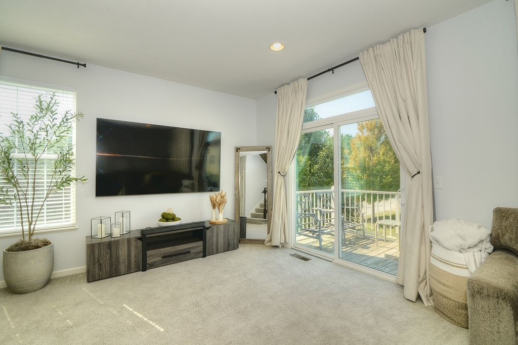 Stunning three level END Unit townhome with amazing open space views! Featuring over 1900 square feet of living space, this Home welcomes you in with a 2 story foyer, upgraded railings & Open concept design. Huge Kitchen with island, loads of upgraded cabinetry, pantry, tons counters space plus a breakfast bar, newer Stainless Steel Appliances, as well Large Dining and Living Room. The oversized deck offers beautiful view and tons of space! 2nd floor features a large Master suite with Huge walk in closet and upgraded Master bath with dual vanities, upgraded counters & cabinets, large separate shower and soaking tub! Two spacious additional secondary bedrooms, an upgraded full bath & second floor laundry room that offers convenience and space! Finished lower level flex room is the perfect space whether you are looking for a family room, office, play area, gym or fourth bedroom! End unit with loads of natural light and fantastic location in the community! Gilberts Town Center features large park with splash pad, playground, baseball fields, 2nd playground, paths & ponds, Loads of Open space which hosts annual fest, Summer Movie in the park and more! This home is move in ready!