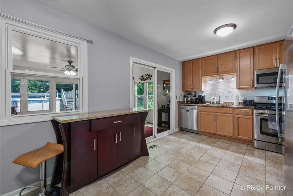 You'll truly enjoy this split level home with a large sunroom addition that includes a luxurious hot tub and walk out to your private pool, deck and brick paver patio. Such a great home for entertaining! Inside is a beautiful remodeled kitchen complete with granite countertops and stainless steel appliances that include a new fridge and microwave. Downstairs is the family room with gas log fireplace, and new sump pump. Great location too, close to shopping, Metra and expressways. This home has it all!