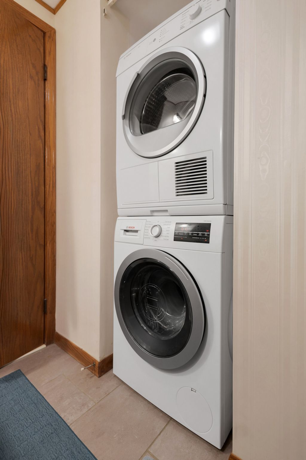 Dramatic penthouse with vaulted ceilings in living room and both bedrooms and master craftsman touches. Freshly painted throughout. Wood laminate flooring throughout. Living room has gas fireplace and sliding glass doors to private balcony that has a storage closet plus a very tranquil view. Kitchen is updated with dark raised panel cabinets, stainless steel appliances and sink and ceramic backsplash. Large pantry closet. The primary bedroom is a generous size and has lots of closets and private bath with whirlpool tub and 12x24 ceramic walls. Second bedroom designed to give you options and has a door to the balcony and is set up to use it as part of the living room, an office . . .you decide. Immaculate home is move in ready. Washer and dryer in home. Underground heated parking Space #309. Close to hospital, shopping, library, Pavilion fitness center, Busse Woods and more. Expressways are right up the street. No dogs. No rentals. (Real estate taxes have senior exemption $673.52 and $1225.64 senior freeze.)