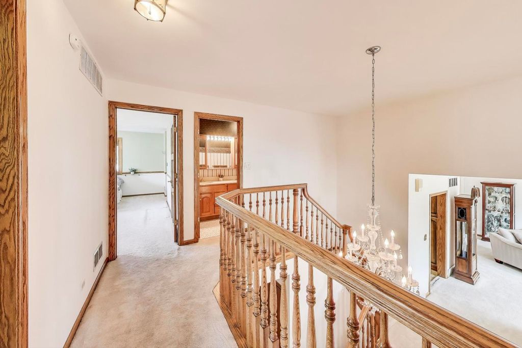 This charming Park Ridge corner-lot home offers 4 bedrooms, 2.5 baths, and a 2.5-car attached garage, all complemented by a brick driveway and a fully fenced side yard for added privacy and outdoor enjoyment. The main level features an ideal layout with multiple living spaces - the sun-filled front living room is flooded with south-facing natural light, while the rear family room invites you to relax by the stone-adorned wood-burning fireplace. The kitchen provides abundant cabinet space, a cozy bay-window seating area with a convenient back door for easy access to grilling and entertaining, flowing seamlessly to the dining room. Upstairs, you'll find four generously sized bedrooms, including a spacious primary suite with its own bath, ample storage, and a second full bath with double-sink vanity. The finished basement offers even more versatility with a dedicated room perfect for a home office or guest room, a laundry area with sink and workshop space, an additional recreation area with bar, and plenty of storage. All of this in a fantastic location just steps from Woodland Park and Franklin Elementary School - making this the perfect place to call home!