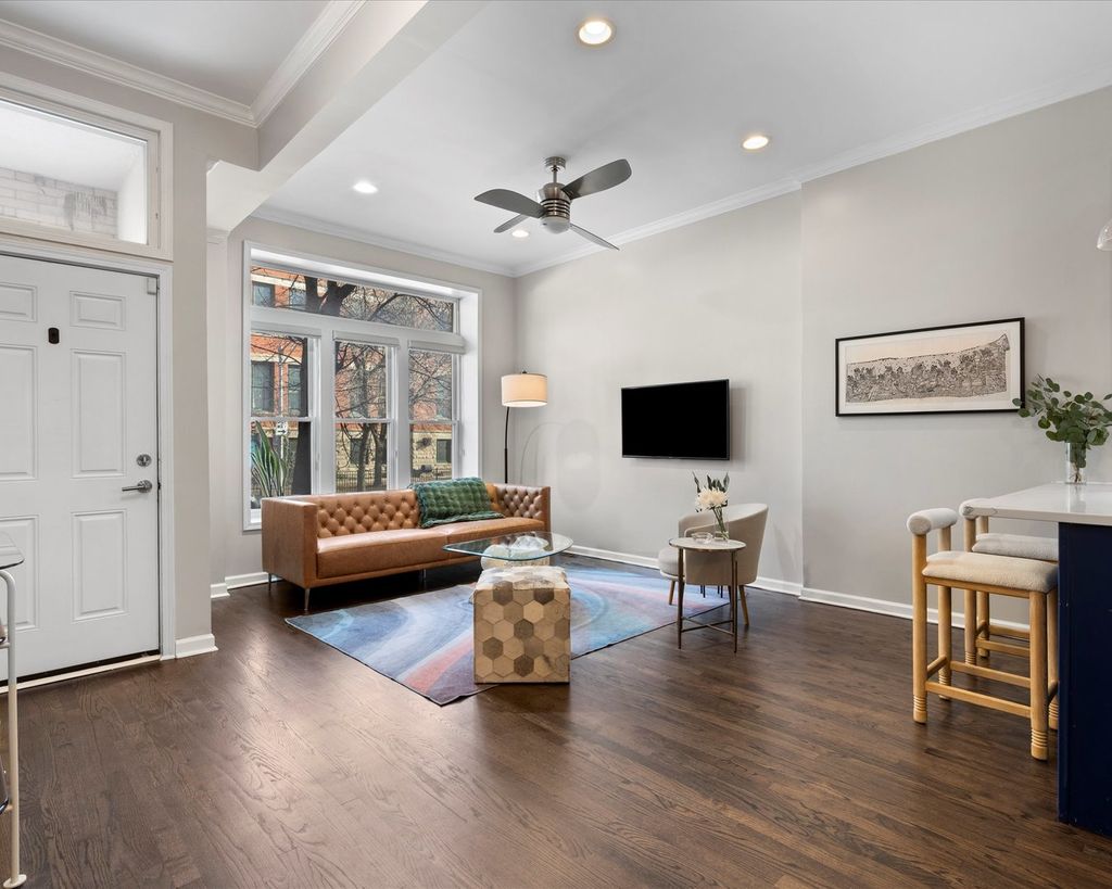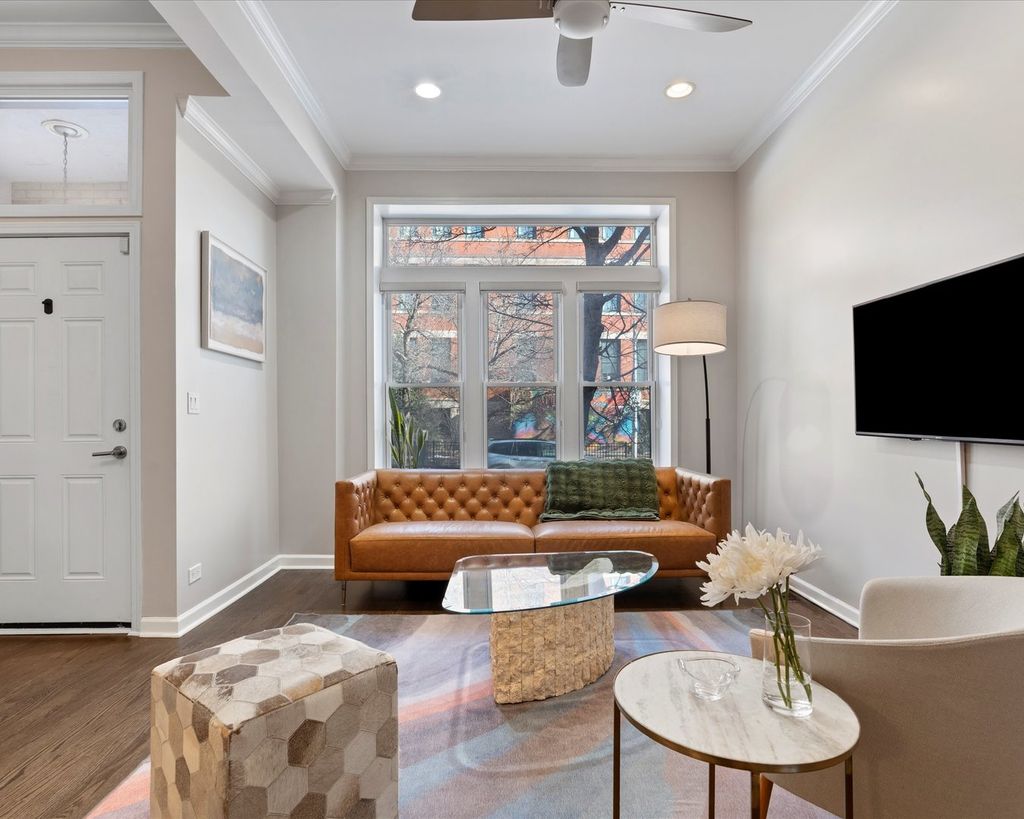 Welcome to 514 N Armour, Unit 1F, an impeccably updated duplex-down residence offering expansive living space and thoughtful upgrades all tucked into a quiet, tree-lined pocket of West Town. This well-appointed 2 bed, 2 bath home delivers seamless functionality across two levels, with multiple living areas and a layout ideal for modern city living. The main level centers around a fully renovated kitchen with contemporary cabinetry, quartz countertops, marble backsplash, and a complete suite of new GE Cafe appliances with custom hardware. Open-concept living and dining areas are bright and offer various layout options. Freshly refinished red Oak hardwood flooring and fresh paint throughout. The spacious primary suite includes custom Elfa closet systems and a beautifully remodeled primary bath including a standing shower with arched entry, updated designer tile, vanity, and fixtures. Downstairs, a large family room with gas fireplace provides a warm secondary gathering space perfect for entertaining. The second bedroom and second full bath offer ideal accommodations for guests, office use, or additional living needs. Additional upgrades include a new front-loading LG washer/dryer and new 50-gallon water heater. Garage parking and a separate storage closet included. Located within close proximity to parks, public transportation, and 5 minutes from the vibrant West Loop, this home offers exceptional value and a flexible footprint in one of Chicago's most sought-after neighborhoods.